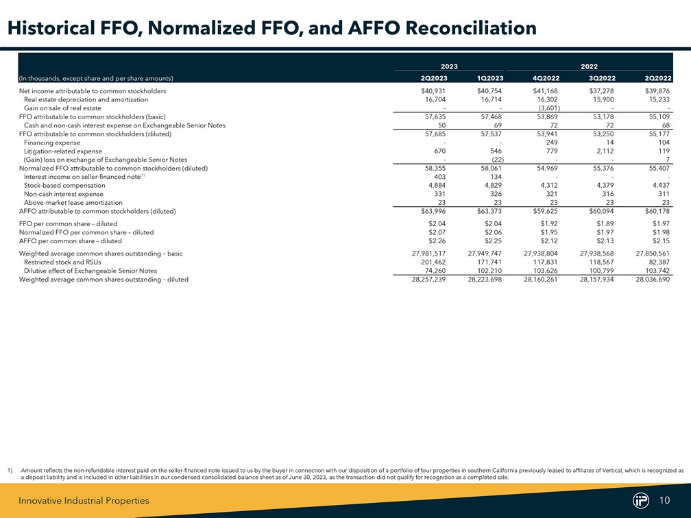 Innovative Industrial Properties 10 2023 2022 (In thousands, except share and per share amounts) 2Q2023 1Q2023 4Q2022 3Q2022 2Q2022 Net income attributable to common stockholders $40,931 $40,754 $41,168 $37,278 $39,876 Real estate depreciation and amortization 16,704 16,714 16,302 15,900 15,233 Gain on sale of real estate - - (3,601) - - FFO attributable to common stockholders (basic) 57,635 57,468 53,869 53,178 55,109 Cash and non-cash interest expense on Exchangeable Senior Notes 50 69 72 72 68 FFO attributable to common stockholders (diluted) 57,685 57,537 53,941 53,250 55,177 Financing expense - - 249 14 104 Litigation-related expense 670 546 779 2,112 119 (Gain) loss on exchange of Exchangeable Senior Notes - (22) - - 7 Normalized FFO attributable to common stockholders (diluted) 58,355 58,061 54,969 55,376 55,407 Interest income on seller-financed note (1) 403 134 - - - Stock-based compensation 4,884 4,829 4,312 4,379 4,437 Non-cash interest expense 331 326 321 316 311 Above-market lease amortization 23 23 23 23 23 AFFO attributable to common stockholders (diluted) $63,996 $63,373 $59,625 $60,094 $60,178 FFO per common share – diluted $2.04 $2.04 $1.92 $1.89 $1.97 Normalized FFO per common share – diluted $2.07 $2.06 $1.95 $1.97 $1.98 AFFO per common share – diluted $2.26 $2.25 $2.12 $2.13 $2.15 Weighted average common shares outstanding – basic 27,981,517 27,949,747 27,938,804 27,938,568 27,850,561 Restricted stock and RSUs 201,462 171,741 117,831 118,567 82,387 Dilutive effect of Exchangeable Senior Notes 74,260 102,210 103,626 100,799 103,742 Weighted average common shares outstanding – diluted 28,257,239 28,223,698 28,160,261 28,157,934 28,036,690 Historical FFO, Normalized FFO, and AFFO Reconciliation 1) Amount reflects the non - refundable interest paid on the seller - financed note issued to us by the buyer in connection with our disposition of a portfolio of four properties in southern California previously leased to affiliates of Vertical, which is recognized as a deposit liability and is included in other liabilities in our condensed consolidated balance sheet as of June 30 , 2023 , as the transaction did not qualify for recognition as a completed sale .