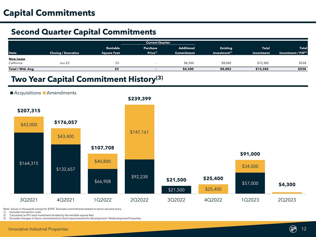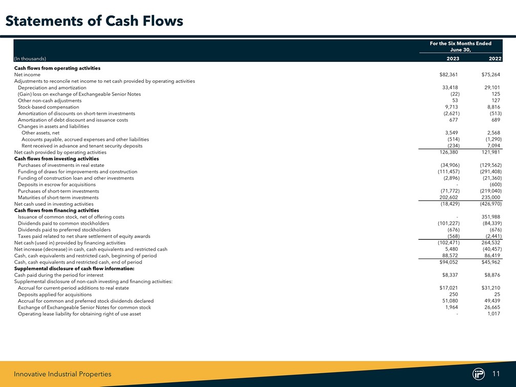 Innovative Industrial Properties 11 For the Six Months Ended June 30, (In thousands) 2023 2022 Cash flows from operating activities Net income $82,361 $75,264 Adjustments to reconcile net income to net cash provided by operating activities Depreciation and amortization 33,418 29,101 (Gain) loss on exchange of Exchangeable Senior Notes (22) 125 Other non-cash adjustments 53 127 Stock-based compensation 9,713 8,816 Amortization of discounts on short-term investments (2,621) (513) Amortization of debt discount and issuance costs 677 689 Changes in assets and liabilities Other assets, net 3,549 2,568 Accounts payable, accrued expenses and other liabilities (514) (1,290) Rent received in advance and tenant security deposits (234) 7,094 Net cash provided by operating activities 126,380 121,981 Cash flows from investing activities Purchases of investments in real estate (34,906) (129,562) Funding of draws for improvements and construction (111,457) (291,408) Funding of construction loan and other investments (2,896) (21,360) Deposits in escrow for acquisitions - (600) Purchases of short-term investments (71,772) (219,040) Maturities of short-term investments 202,602 235,000 Net cash used in investing activities (18,429) (426,970) Cash flows from financing activities Issuance of common stock, net of offering costs - 351,988 Dividends paid to common stockholders (101,227) (84,339) Dividends paid to preferred stockholders (676) (676) Taxes paid related to net share settlement of equity awards (568) (2,441) Net cash (used in) provided by financing activities (102,471) 264,532 Net increase (decrease) in cash, cash equivalents and restricted cash 5,480 (40,457) Cash, cash equivalents and restricted cash, beginning of period 88,572 86,419 Cash, cash equivalents and restricted cash, end of period $94,052 $45,962 Supplemental disclosure of cash flow information: Cash paid during the period for interest $8,337 $8,876 Supplemental disclosure of non-cash investing and financing activities: Accrual for current-period additions to real estate $17,021 $31,210 Deposits applied for acquisitions 250 25 Accrual for common and preferred stock dividends declared 51,080 49,439 Exchange of Exchangeable Senior Notes for common stock 1,964 26,665 Operating lease liability for obtaining right of use asset - 1,017 Statements of Cash Flows