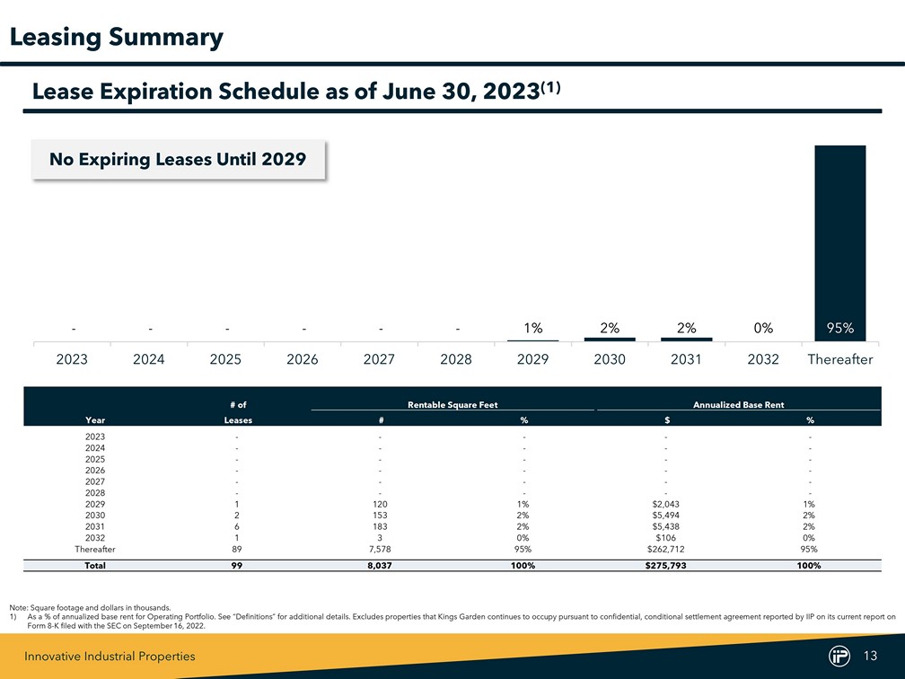 Innovative Industrial Properties 12 Current Quarter Rentable Purchase Additional Existing Total Total State Closing / Execution Square Feet Price (1) Commitment Investment (1) Investment Investment / PSF (2) New Lease California Jun-23 23 - $4,300 $8,082 $12,382 $538 Total / Wtd. Avg. 23 - $4,300 $8,082 $12,382 $538 Capital Commitments Note : Values in thousands except for $ /PSF . Excludes commitments related to senior secured loans . 1) Excludes transaction costs . 2) Calculated as IIP’s total investment divided by the rentable square feet . 3) Excludes changes in future commitments to fund improvements for Development / Redevelopment Properties . $164,315 $132,657 $66,908 $92,238 $21,500 - $57,000 $43,000 $43,400 $40,800 $147,161 - $25,400 $34,000 $207,315 $176,057 $107,708 $239,399 $21,500 $25,400 $91,000 $4,300 3Q2021 4Q2021 1Q2022 2Q2022 3Q2022 4Q2022 1Q2023 2Q2023 Acquisitions Amendments Second Quarter Capital Commitments Two Year Capital Commitment History (3)