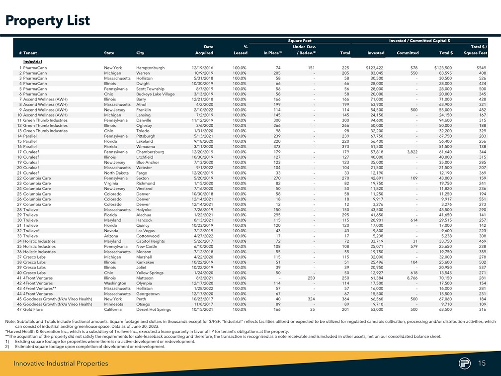 Innovative Industrial Properties 14 IIP Portfolio First Quarter 2023 (3) Tenant Information Total Invested Capital (1) Investment # of Adjusted Market MSO #Tenant $ % Square Feet (2) / Square Feet Leases Revenue EBITDA (4) Capitalization (5) / SSO (6) 1PharmaCann $321,172 13.5% 688 $467 11 Private Co. Private Co. Private Co. MSO 2Ascend Wellness (AWH) 214,050 9.0% 624 343 4 $114 $23 $127 MSO 3Green Thumb Industries 176,800 7.4% 664 266 3 249 76 1,806 MSO 4Parallel 175,650 7.4% 832 211 3 Private Co. Private Co. Private Co. MSO 5Curaleaf 175,047 7.3% 578 303 8 336 73 2,236 MSO 6Columbia Care 147,834 6.2% 588 251 21 125 16 189 MSO 7Trulieve 146,503 6.1% 740 198 6 289 78 730 MSO 8Holistic Industries 121,900 5.1% 333 366 5 Private Co. Private Co. Private Co. MSO 9Cresco Labs 120,845 5.1% 379 319 5 194 29 511 MSO 10 4Front Ventures (7) 119,150 5.0% 488 244 4 30 4 98 MSO Top 10 Tenants Total $1,718,951 72.0% 5,914 $291 70 Top Tenants Overview 1) Total Portfolio representation . Dollars in thousands, see “Definitions” for additional details . 2) Square feet in thousands . 3) Dollars in millions, based on each company’s public securities filings and earnings release, available at www . sec . gov, www . sedar . com, or each company’s respective website, for the quarter ended March 31 , 2023 . 4) Adjusted EBITDA is a non - GAAP financial measure utilized in the industry . For definitions and reconciliations of Adjusted EBITDA to net income, see each company’s public securities filings, available at www . sec . gov or www . sedar . com . 5) Dollars in millions, per S&P Capital IQ Pro as of 6 / 30 / 2023 . 6) “MSO” stands for Multi - State Operator which means the tenant (or guarantor) conducts cannabis operations in more than one state . “SSO” stands for Single - State O perator which means the tenant (or guarantor) conducts cannabis operations in a single state . 7) Includes one property acquired in January 2022 for $ 16 . 0 million which did not satisfy the requirements for sale - leaseback accounting and therefore, the transaction is recognized as a note receivable and is included in other assets, net on our consolidated balance sheet .