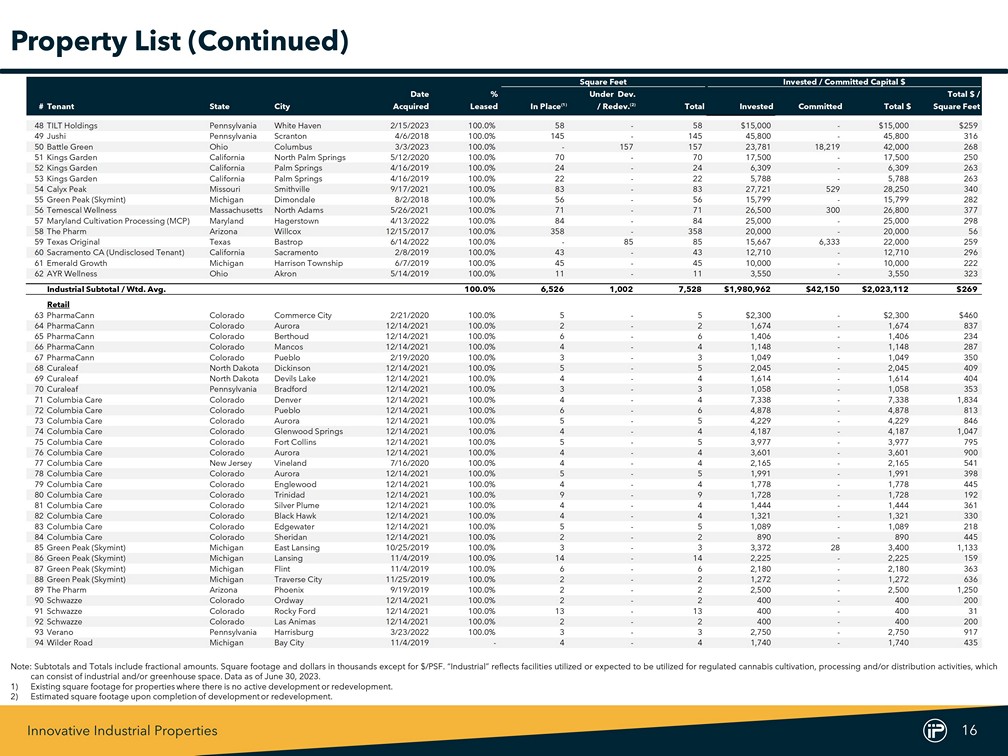 Innovative Industrial Properties 15 Square Feet Invested / Committed Capital $ Date % Under Dev. Total $ / #Tenant State City Acquired Leased In Place (1) / Redev. (2) Total Invested Committed Total $ Square Feet Industrial 1PharmaCann New York Hamptonburgh 12/19/2016 100.0% 74 151 225 $123,422 $78 $123,500 $549 2PharmaCann Michigan Warren 10/9/2019 100.0% 205 - 205 83,045 550 83,595 408 3PharmaCann Massachusetts Holliston 5/31/2018 100.0% 58 - 58 30,500 - 30,500 526 4PharmaCann Illinois Dwight 10/30/2019 100.0% 66 - 66 28,000 - 28,000 424 5PharmaCann Pennsylvania Scott Township 8/7/2019 100.0% 56 - 56 28,000 - 28,000 500 6PharmaCann Ohio Buckeye Lake Village 3/13/2019 100.0% 58 - 58 20,000 - 20,000 345 7Ascend Wellness (AWH) Illinois Barry 12/21/2018 100.0% 166 - 166 71,000 - 71,000 428 8Ascend Wellness (AWH) Massachusetts Athol 4/2/2020 100.0% 199 - 199 63,900 - 63,900 321 9Ascend Wellness (AWH) New Jersey Franklin 2/10/2022 100.0% 114 - 114 54,500 500 55,000 482 10Ascend Wellness (AWH) Michigan Lansing 7/2/2019 100.0% 145 - 145 24,150 - 24,150 167 11Green Thumb Industries Pennsylvania Danville 11/12/2019 100.0% 300 - 300 94,600 - 94,600 315 12Green Thumb Industries Illinois Oglesby 3/6/2020 100.0% 266 - 266 50,000 - 50,000 188 13Green Thumb Industries Ohio Toledo 1/31/2020 100.0% 98 - 98 32,200 - 32,200 329 14Parallel Pennsylvania Pittsburgh 5/13/2021 100.0% 239 - 239 67,750 - 67,750 283 15Parallel Florida Lakeland 9/18/2020 100.0% 220 - 220 56,400 - 56,400 256 16Parallel Florida Wimauma 3/11/2020 100.0% 373 - 373 51,500 - 51,500 138 17Curaleaf Pennsylvania Chambersburg 12/20/2019 100.0% 179 - 179 57,818 3,822 61,640 344 18Curaleaf Illinois Litchfield 10/30/2019 100.0% 127 - 127 40,000 - 40,000 315 19Curaleaf New Jersey Blue Anchor 7/13/2020 100.0% 123 - 123 35,000 - 35,000 285 20Curaleaf Massachusetts Webster 9/1/2022 100.0% 104 - 104 21,500 - 21,500 207 21Curaleaf North Dakota Fargo 12/20/2019 100.0% 33 - 33 12,190 - 12,190 369 22Columbia Care Pennsylvania Saxton 5/20/2019 100.0% 270 - 270 42,891 109 43,000 159 23Columbia Care Virginia Richmond 1/15/2020 100.0% 82 - 82 19,750 - 19,750 241 24Columbia Care New Jersey Vineland 7/16/2020 100.0% 50 - 50 11,820 - 11,820 236 25Columbia Care Colorado Denver 10/30/2018 100.0% 58 - 58 11,250 - 11,250 194 26Columbia Care Colorado Denver 12/14/2021 100.0% 18 - 18 9,917 - 9,917 551 27Columbia Care Colorado Denver 12/14/2021 100.0% 12 - 12 3,276 - 3,276 273 28Trulieve Massachusetts Holyoke 7/26/2019 100.0% 150 - 150 43,500 - 43,500 290 29Trulieve Florida Alachua 1/22/2021 100.0% 295 - 295 41,650 - 41,650 141 30Trulieve Maryland Hancock 8/13/2021 100.0% 115 - 115 28,901 614 29,515 257 31Trulieve Florida Quincy 10/23/2019 100.0% 120 - 120 17,000 - 17,000 142 32Trulieve* Nevada Las Vegas 7/12/2019 100.0% 43 - 43 9,600 - 9,600 223 33Trulieve Arizona Cottonwood 4/27/2022 100.0% 17 - 17 5,238 - 5,238 308 34Holistic Industries Maryland Capitol Heights 5/26/2017 100.0% 72 - 72 33,719 31 33,750 469 35Holistic Industries Pennsylvania New Castle 6/10/2020 100.0% 108 - 108 25,071 579 25,650 238 36Holistic Industries Massachusetts Monson 7/12/2018 100.0% 55 - 55 19,750 - 19,750 359 37Cresco Labs Michigan Marshall 4/22/2020 100.0% 115 - 115 32,000 - 32,000 278 38Cresco Labs Illinois Kankakee 10/22/2019 100.0% 51 - 51 25,496 104 25,600 502 39Cresco Labs Illinois Joliet 10/22/2019 100.0% 39 - 39 20,950 - 20,950 537 40Cresco Labs Ohio Yellow Springs 1/24/2020 100.0% 50 - 50 12,927 618 13,545 271 414Front Ventures Illinois Matteson 8/3/2021 100.0% - 250 250 61,384 8,766 70,150 281 424Front Ventures Washington Olympia 12/17/2020 100.0% 114 - 114 17,500 - 17,500 154 434Front Ventures** Massachusetts Holliston 1/28/2022 100.0% 57 - 57 16,000 - 16,000 281 444Front Ventures Massachusetts Georgetown 12/17/2020 100.0% 67 - 67 15,500 - 15,500 231 45Goodness Growth (f/k/a Vireo Health) New York Perth 10/23/2017 100.0% 40 324 364 66,560 500 67,060 184 46Goodness Growth (f/k/a Vireo Health) Minnesota Otsego 11/8/2017 100.0% 89 - 89 9,710 - 9,710 109 47Gold Flora California Desert Hot Springs 10/15/2021 100.0% 166 35 201 63,000 500 63,500 316 Note : Subtotals and Totals include fractional amounts . Square footage and dollars in thousands except for $ /PSF . “Industrial” reflects facilities utilized or expected to be utilized for regulated cannabis cultivation, processing and/or distribution activities, which can consist of industrial and/or greenhouse space . Data as of June 30 , 2023 . *Harvest Health & Recreation Inc . , which is a subsidiary of Trulieve Inc . , executed a lease guaranty in favor of IIP for tenant’s obligations at the property . **The acquisition of the property did not satisfy the requirements for sale - leaseback accounting and therefore, the transaction is recognized as a note receivable and is included in other assets, net on our consolidated balance sheet . 1) Existing square footage for properties where there is no active development or redevelopment . 2) Estimated square footage upon completion of development or redevelopment . Property List