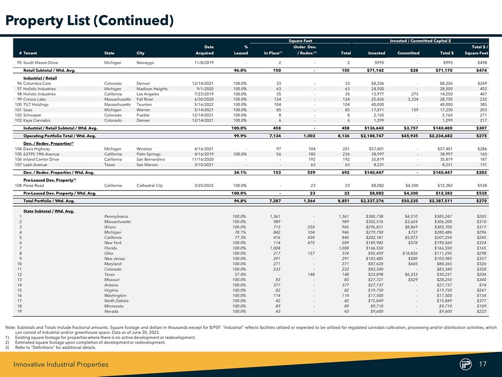 Innovative Industrial Properties 16 Square Feet Invested / Committed Capital $ Date % Under Dev. Total $ / #Tenant State City Acquired Leased In Place (1) / Redev. (2) Total Invested Committed Total $ Square Feet 48TILT Holdings Pennsylvania White Haven 2/15/2023 100.0% 58 - 58 $15,000 - $15,000 $259 49Jushi Pennsylvania Scranton 4/6/2018 100.0% 145 - 145 45,800 - 45,800 316 50Battle Green Ohio Columbus 3/3/2023 100.0% - 157 157 23,781 18,219 42,000 268 51Kings Garden California North Palm Springs 5/12/2020 100.0% 70 - 70 17,500 - 17,500 250 52Kings Garden California Palm Springs 4/16/2019 100.0% 24 - 24 6,309 - 6,309 263 53Kings Garden California Palm Springs 4/16/2019 100.0% 22 - 22 5,788 - 5,788 263 54Calyx Peak Missouri Smithville 9/17/2021 100.0% 83 - 83 27,721 529 28,250 340 55Green Peak (Skymint) Michigan Dimondale 8/2/2018 100.0% 56 - 56 15,799 - 15,799 282 56Temescal Wellness Massachusetts North Adams 5/26/2021 100.0% 71 - 71 26,500 300 26,800 377 57Maryland Cultivation Processing (MCP) Maryland Hagerstown 4/13/2022 100.0% 84 - 84 25,000 - 25,000 298 58The Pharm Arizona Willcox 12/15/2017 100.0% 358 - 358 20,000 - 20,000 56 59Texas Original Texas Bastrop 6/14/2022 100.0% - 85 85 15,667 6,333 22,000 259 60Sacramento CA (Undisclosed Tenant) California Sacramento 2/8/2019 100.0% 43 - 43 12,710 - 12,710 296 61Emerald Growth Michigan Harrison Township 6/7/2019 100.0% 45 - 45 10,000 - 10,000 222 62AYR Wellness Ohio Akron 5/14/2019 100.0% 11 - 11 3,550 - 3,550 323 Industrial Subtotal / Wtd. Avg. 100.0% 6,526 1,002 7,528 $1,980,962 $42,150 $2,023,112 $269 Retail 63PharmaCann Colorado Commerce City 2/21/2020 100.0% 5 - 5 $2,300 - $2,300 $460 64PharmaCann Colorado Aurora 12/14/2021 100.0% 2 - 2 1,674 - 1,674 837 65PharmaCann Colorado Berthoud 12/14/2021 100.0% 6 - 6 1,406 - 1,406 234 66PharmaCann Colorado Mancos 12/14/2021 100.0% 4 - 4 1,148 - 1,148 287 67PharmaCann Colorado Pueblo 2/19/2020 100.0% 3 - 3 1,049 - 1,049 350 68Curaleaf North Dakota Dickinson 12/14/2021 100.0% 5 - 5 2,045 - 2,045 409 69Curaleaf North Dakota Devils Lake 12/14/2021 100.0% 4 - 4 1,614 - 1,614 404 70Curaleaf Pennsylvania Bradford 12/14/2021 100.0% 3 - 3 1,058 - 1,058 353 71Columbia Care Colorado Denver 12/14/2021 100.0% 4 - 4 7,338 - 7,338 1,834 72Columbia Care Colorado Pueblo 12/14/2021 100.0% 6 - 6 4,878 - 4,878 813 73Columbia Care Colorado Aurora 12/14/2021 100.0% 5 - 5 4,229 - 4,229 846 74Columbia Care Colorado Glenwood Springs 12/14/2021 100.0% 4 - 4 4,187 - 4,187 1,047 75Columbia Care Colorado Fort Collins 12/14/2021 100.0% 5 - 5 3,977 - 3,977 795 76Columbia Care Colorado Aurora 12/14/2021 100.0% 4 - 4 3,601 - 3,601 900 77Columbia Care New Jersey Vineland 7/16/2020 100.0% 4 - 4 2,165 - 2,165 541 78Columbia Care Colorado Aurora 12/14/2021 100.0% 5 - 5 1,991 - 1,991 398 79Columbia Care Colorado Englewood 12/14/2021 100.0% 4 - 4 1,778 - 1,778 445 80Columbia Care Colorado Trinidad 12/14/2021 100.0% 9 - 9 1,728 - 1,728 192 81Columbia Care Colorado Silver Plume 12/14/2021 100.0% 4 - 4 1,444 - 1,444 361 82Columbia Care Colorado Black Hawk 12/14/2021 100.0% 4 - 4 1,321 - 1,321 330 83Columbia Care Colorado Edgewater 12/14/2021 100.0% 5 - 5 1,089 - 1,089 218 84Columbia Care Colorado Sheridan 12/14/2021 100.0% 2 - 2 890 - 890 445 85Green Peak (Skymint) Michigan East Lansing 10/25/2019 100.0% 3 - 3 3,372 28 3,400 1,133 86Green Peak (Skymint) Michigan Lansing 11/4/2019 100.0% 14 - 14 2,225 - 2,225 159 87Green Peak (Skymint) Michigan Flint 11/4/2019 100.0% 6 - 6 2,180 - 2,180 363 88Green Peak (Skymint) Michigan Traverse City 11/25/2019 100.0% 2 - 2 1,272 - 1,272 636 89The Pharm Arizona Phoenix 9/19/2019 100.0% 2 - 2 2,500 - 2,500 1,250 90Schwazze Colorado Ordway 12/14/2021 100.0% 2 - 2 400 - 400 200 91Schwazze Colorado Rocky Ford 12/14/2021 100.0% 13 - 13 400 - 400 31 92Schwazze Colorado Las Animas 12/14/2021 100.0% 2 - 2 400 - 400 200 93Verano Pennsylvania Harrisburg 3/23/2022 100.0% 3 - 3 2,750 - 2,750 917 94Wilder Road Michigan Bay City 11/4/2019 - 4 - 4 1,740 - 1,740 435 Property List (Continued) Note : Subtotals and Totals include fractional amounts . Square footage and dollars in thousands except for $ /PSF . “Industrial” reflects facilities utilized or expected to be utilized for regulated cannabis cultivation, processing and/or distribution activities, which can consist of industrial and/or greenhouse space . Data as of June 30 , 2023 . 1) Existing square footage for properties where there is no active development or redevelopment . 2) Estimated square footage upon completion of development or redevelopment .