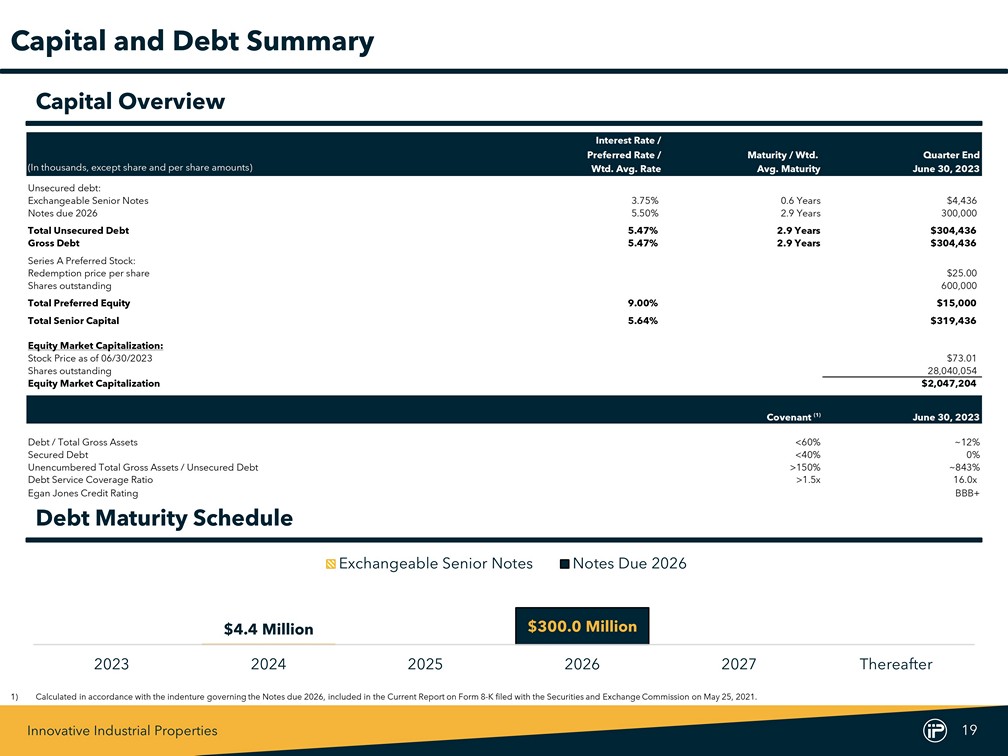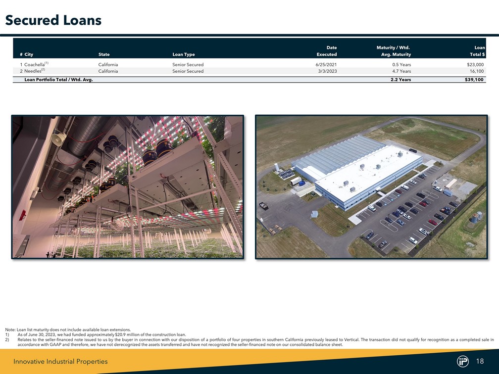 Innovative Industrial Properties 18 Date Maturity / Wtd. Loan #City State Loan Type Executed Avg. Maturity Total $ 1 Coachella (1) California Senior Secured 6/25/2021 0.5 Years $23,000 2 Needles (2) California Senior Secured 3/3/2023 4.7 Years 16,100 Loan Portfolio Total / Wtd. Avg. 2.2 Years $39,100 Secured Loans Note : Loan list maturity does not include available loan extensions . 1) As of June 30 , 2023 , we had funded approximately $ 20 . 9 million of the construction loan . 2) Relates to the seller - financed note issued to us by the buyer in connection with our disposition of a portfolio of four properties in southern California previously leased to Vertical . The transaction did not qualify for recognition as a completed sale in accordance with GAAP and therefore, we have not derecognized the assets transferred and have not recognized the seller - financed note on our consolidated balance sheet .