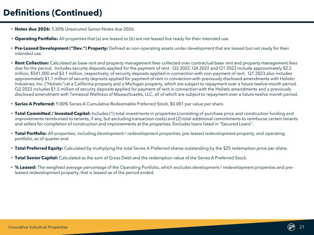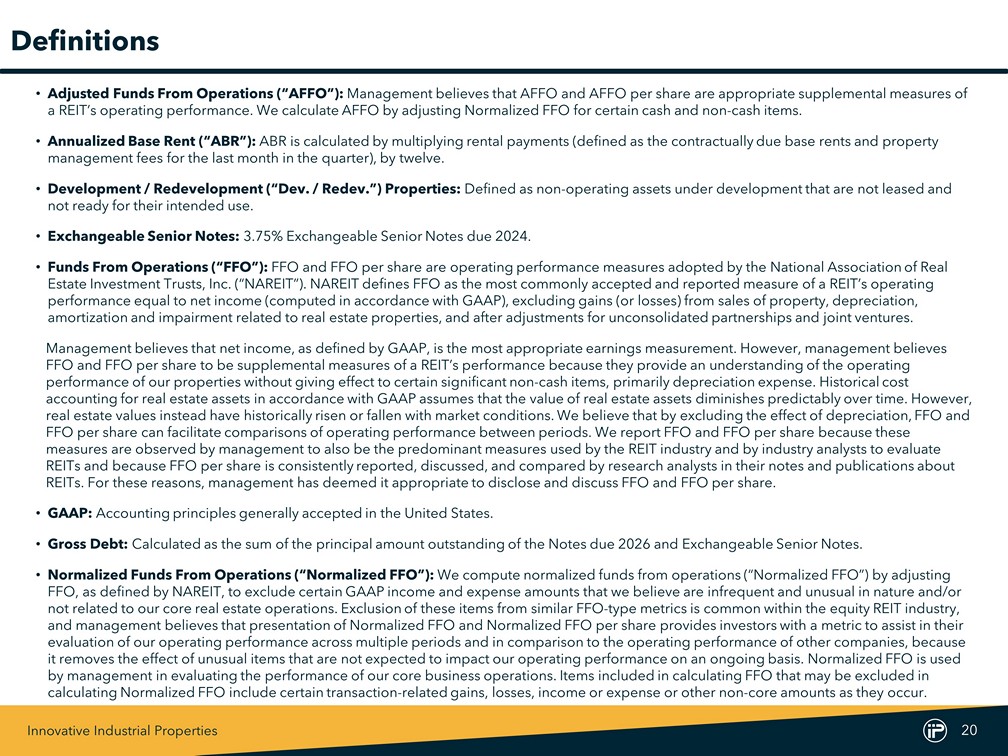 Innovative Industrial Properties 20 Definitions • Adjusted Funds From Operations (“AFFO”): Management believes that AFFO and AFFO per share are appropriate supplemental measures of a REIT’s operating performance. We calculate AFFO by adjusting Normalized FFO for certain cash and non - cash items. • Annualized Base Rent (“ABR”): ABR is calculated by multiplying rental payments (defined as the contractually due base rents and property management fees for the last month in the quarter), by twelve. • Development / Redevelopment (“Dev. / Redev.”) Properties: Defined as non - operating assets under development that are not leased and not ready for their intended use. • Exchangeable Senior Notes: 3.75% E xchangeable Senior Notes due 2024. • Funds From Operations (“FFO”): FFO and FFO per share are operating performance measures adopted by the National Association of Real Estate Investment Trusts, Inc. (“NAREIT”). NAREIT defines FFO as the most commonly accepted and reported measure of a REIT’s ope rating performance equal to net income (computed in accordance with GAAP), excluding gains (or losses) from sales of property, depre cia tion, amortization and impairment related to real estate properties, and after adjustments for unconsolidated partnerships and join t v entures. Management believes that net income, as defined by GAAP, is the most appropriate earnings measurement. However, management be lie ves FFO and FFO per share to be supplemental measures of a REIT’s performance because they provide an understanding of the operat ing performance of our properties without giving effect to certain significant non - cash items, primarily depreciation expense. Histo rical cost accounting for real estate assets in accordance with GAAP assumes that the value of real estate assets diminishes predictably ov er time. However, real estate values instead have historically risen or fallen with market conditions. We believe that by excluding the effect of depreciation, FFO and FFO per share can facilitate comparisons of operating performance between periods. We report FFO and FFO per share because th ese measures are observed by management to also be the predominant measures used by the REIT industry and by industry analysts to ev aluate REITs and because FFO per share is consistently reported, discussed, and compared by research analysts in their notes and pub lic ations about REITs. For these reasons, management has deemed it appropriate to disclose and discuss FFO and FFO per share. • GAAP: Accounting principles generally accepted in the United States. • Gross Debt: Calculated as the sum of the principal amount outstanding of the Notes due 2026 and Exchangeable Senior Notes. • Normalized Funds From Operations (“Normalized FFO”): We compute normalized funds from operations (“Normalized FFO”) by adjusting FFO, as defined by NAREIT, to exclude certain GAAP income and expense amounts that we believe are infrequent and unusual in n atu re and/or not related to our core real estate operations. Exclusion of these items from similar FFO - type metrics is common within the equi ty REIT industry, and management believes that presentation of Normalized FFO and Normalized FFO per share provides investors with a metric to ass ist in their evaluation of our operating performance across multiple periods and in comparison to the operating performance of other compa nie s, because it removes the effect of unusual items that are not expected to impact our operating performance on an ongoing basis. Normali zed FFO is used by management in evaluating the performance of our core business operations. Items included in calculating FFO that may be ex clu ded in calculating Normalized FFO include certain transaction - related gains, losses, income or expense or other non - core amounts as the y occur.