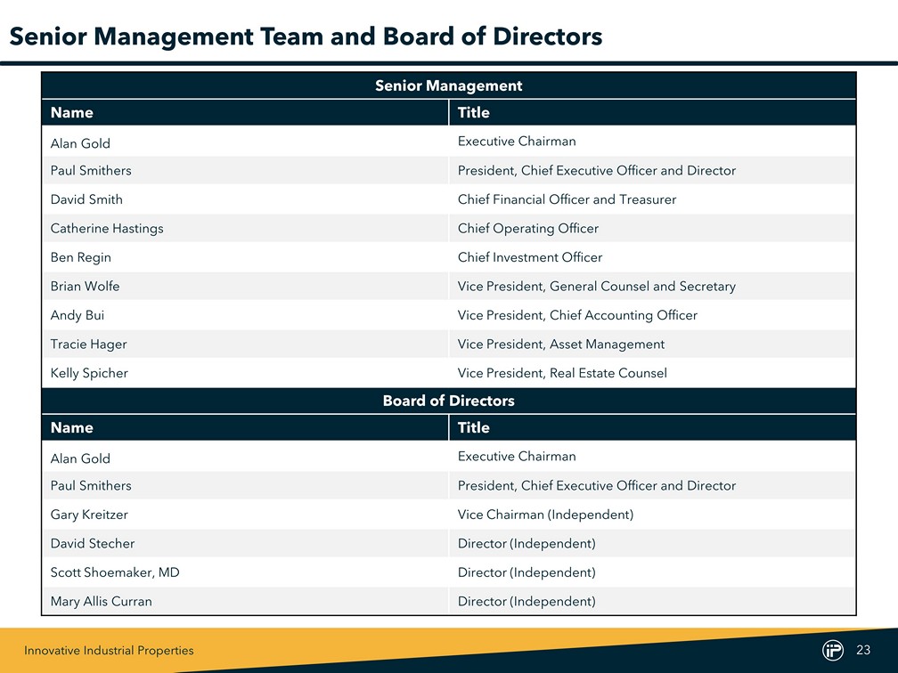 Innovative Industrial Properties 23 Senior Management Team and Board of Directors Senior Management Name Title Alan Gold Executive Chairman Paul Smithers President, Chief Executive Officer and Director David Smith Chief Financial Officer and Treasurer Catherine Hastings Chief Operating Officer Ben Regin Chief Investment Officer Brian Wolfe Vice President, General Counsel and Secretary Andy Bui Vice President, Chief Accounting Officer Tracie Hager Vice President, Asset Management Kelly Spicher Vice President, Real Estate Counsel Board of Directors Name Title Alan Gold Executive Chairman Paul Smithers President, Chief Executive Officer and Director Gary Kreitzer Vice Chairman (Independent) David Stecher Director (Independent) Scott Shoemaker, MD Director (Independent) Mary Allis Curran Director (Independent)