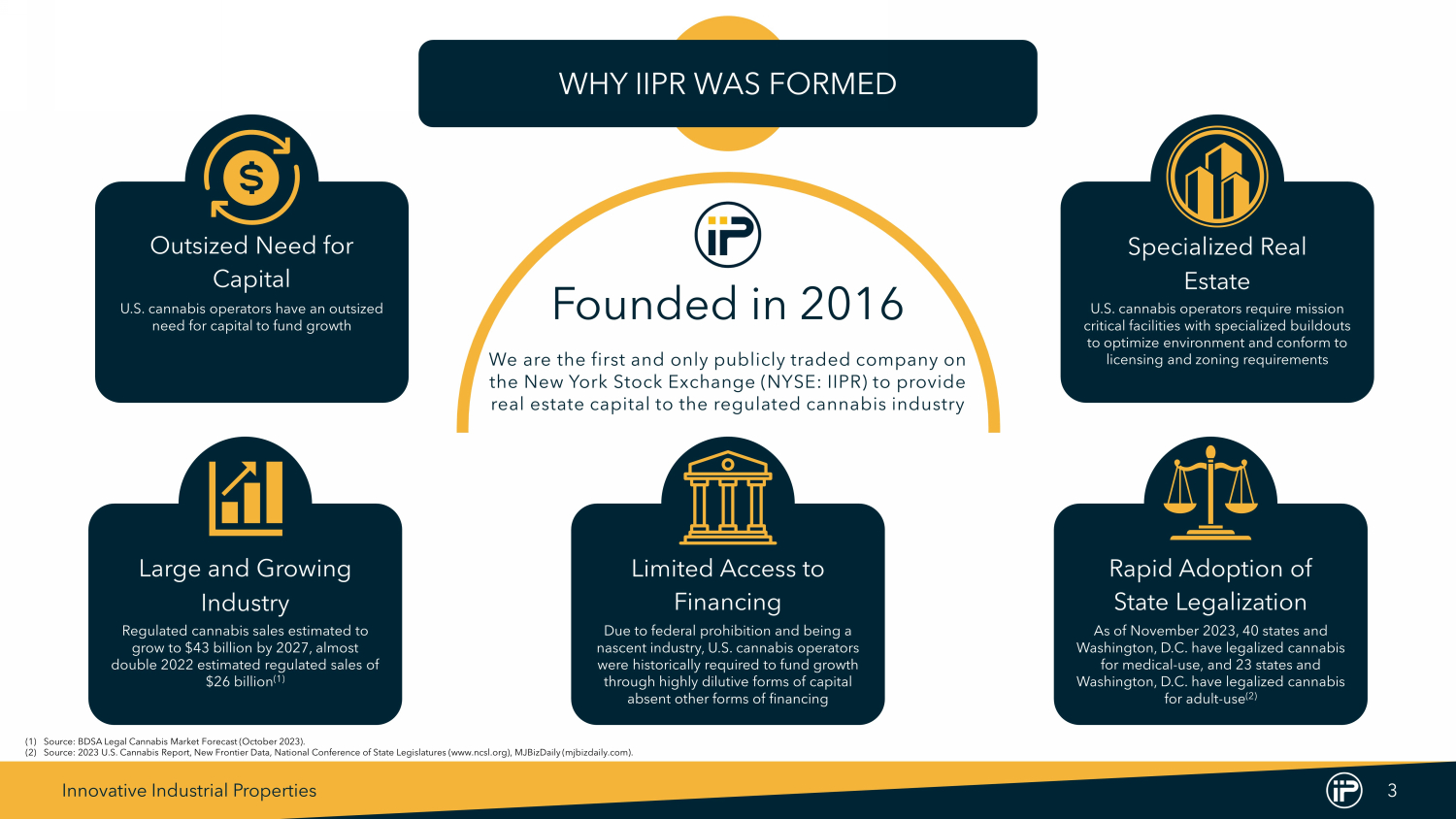 Innovative Industrial Properties 2 FORWARD LOOKING STATEMENTS This presentation and our associated comments include "forward - looking statements" (within the meaning of the Private Securities Litigation Reform Act of 1995, Section 27A of the Securities Act of 1933, as amended, and Section 21E of the Securities Exchange Act of 1934, as amended) that are subject to risks and uncertain tie s. In particular, statements pertaining to our capital resources, portfolio performance and results of operations contain forward - looking statements. Likewise, our statements regarding anticipated growth in our funds from operations and anticipated market and regulatory conditions, our strategic direction, our dividend rate and policy, demographics, results of operations, plans and objectives are forward - looking statements. Forward - looking statements involve numerous risks and uncertainties, and you should not rely on them as predictions of future events. Forward - looking statements depend on a ssumptions, data or methods which may be incorrect or imprecise, and we may not be able to realize them. We do not guarantee that the transactions and events described will happen as described ( or that they will happen at all). You can identify forward - looking statements by the use of forward - looking terminology such as "believes“, "expects“, "may“, "will“, "should“, "seeks“, "approximately“, "int ends“, "plans“, "estimates" or "anticipates" or the negative of these words and phrases or similar words or phrases. You can also identify forward - looking statements by discussions of strategy, plans or inten tions. The following factors, among others, could cause actual results and future events to differ materially from those set forth or contemplated in the forward - looking statements: rates of default on l eases for our assets; concentration of our portfolio of assets and limited number of tenants; the estimated growth in and evolving market dynamics of the regulated cannabis market; the demand for regu lat ed cannabis facilities; inflation dynamics; our ability to improve our internal control over financial reporting, including our inability to remediate an identified material weakness, and the cost s a nd the time associated with such efforts; the impact of pandemics on us, our business, our tenants, or the economy generally; war and other hostilities, including the conflicts in Ukraine and Israel; our business and investment strategy; our projected operating results; actions and initiatives of the U.S. or state governments and changes to government policies and the execution and impact of these actions , i nitiatives and policies, including the fact that cannabis remains illegal under federal law; availability of suitable investment opportunities in the regulated cannabis industry; our understanding of ou r competition and our potential tenants’ alternative financing sources; the expected medical - use or adult - use cannabis legalization in certain states; shifts in public opinion regarding regulated cannabis ; the potential impact on us from litigation matters, including rising liability and insurance costs; the additional risks that may be associated with certain of our tenants cultivating, processing and/or d isp ensing adult - use cannabis in our facilities; the state of the U.S. economy generally or in specific geographic areas; economic trends and economic recoveries; our ability to access equity or debt capi tal ; financing rates for our target assets; our level of indebtedness, which could reduce funds available for other business purposes and reduce our operational flexibility; covenants in our debt instru men ts, which may limit our flexibility and adversely affect our financial condition; our ability to maintain our investment grade credit rating; changes in the values of our assets; our expected port fol io of assets; our expected investments; interest rate mismatches between our assets and our borrowings used to fund such investments; changes in interest rates and the market value of our assets; th e d egree to which any interest rate or other hedging strategies may or may not protect us from interest rate volatility; the impact of and changes in governmental regulations, tax law and rates, accou nti ng guidance and similar matters; our ability to maintain our qualification as a real estate investment trust for U.S. federal income tax purposes; our ability to maintain our exemption from registration un der the Investment Company Act of 1940; availability of qualified personnel; and market trends in our industry, interest rates, real estate values, the securities markets or the general economy. The risks included here are not exhaustive, and additional factors could adversely affect our business and financial performa nce . In addition, we discussed a number of material risks in our most recent Annual Report on Form 10 - K and subsequent Quarterly Reports on Form 10 - Q. Those risks continue to be relevant to our performance and financial condition. Moreover, we operate in a very competitive and rapidly changing environment. New risk factors emerge from time to time and it is not possible for management to predict all such risk factors, nor can it assess the impact of all such risk factors on our business or the extent to which any factor, or combination of factors, may cause actual results to differ materially from th ose contained in any forward - looking statements. Any forward - looking statement made by us speaks only of the date on which we make it. We undertake no obligation to publicly update or revise any fo rward - looking statements, whether as a result of new information, future events or otherwise, except as may be required by law. Stockholders and investors are cautioned not to unduly rely on suc h forward - looking statements when evaluating the information presented in our filings and reports. Market and industry data are included in this presentation