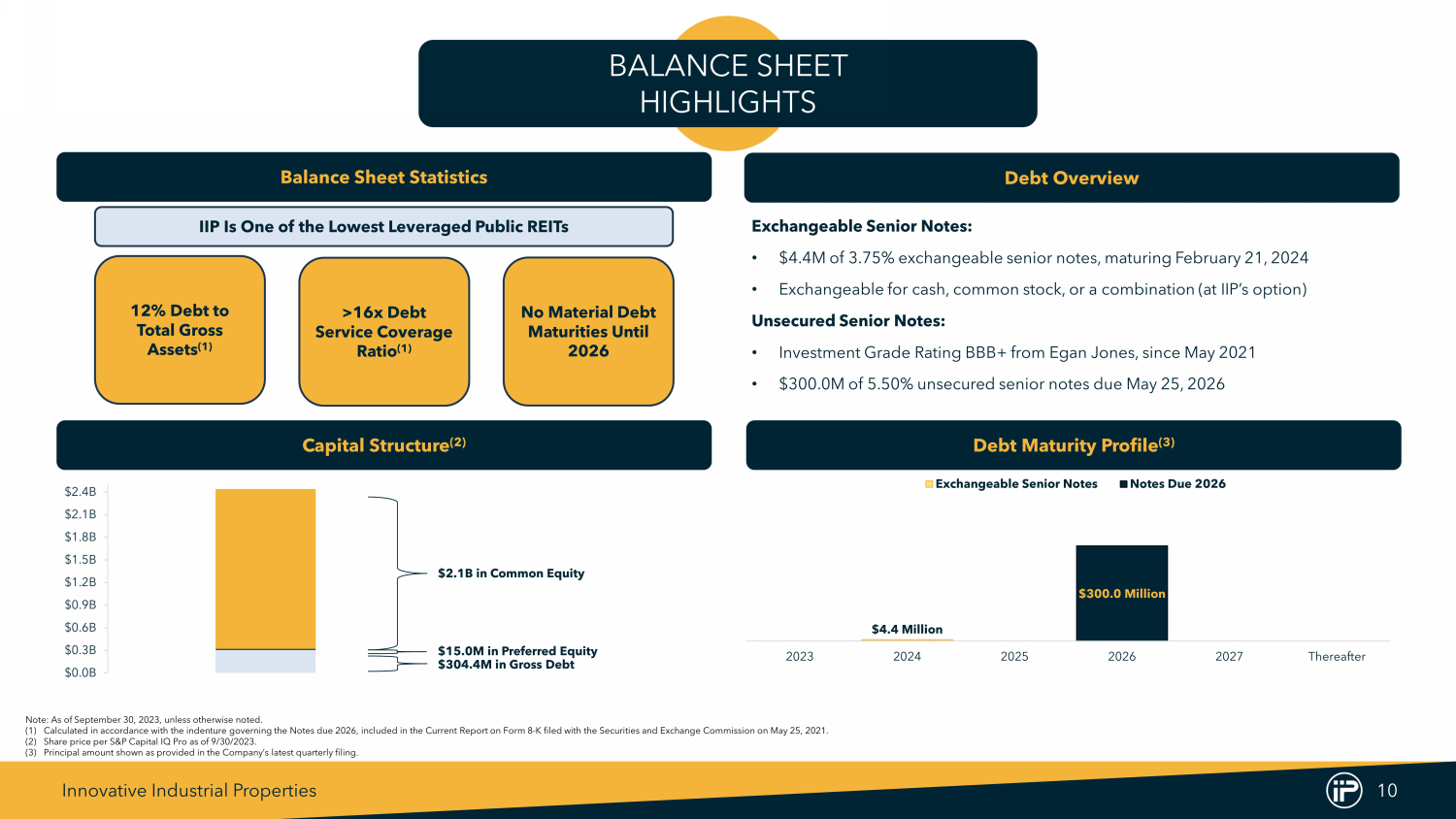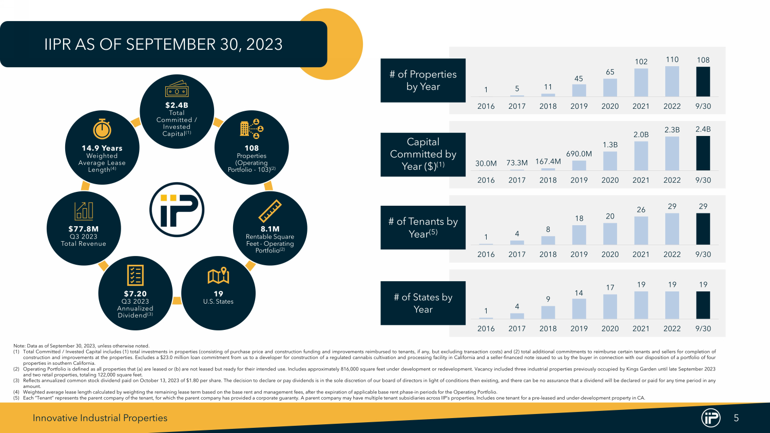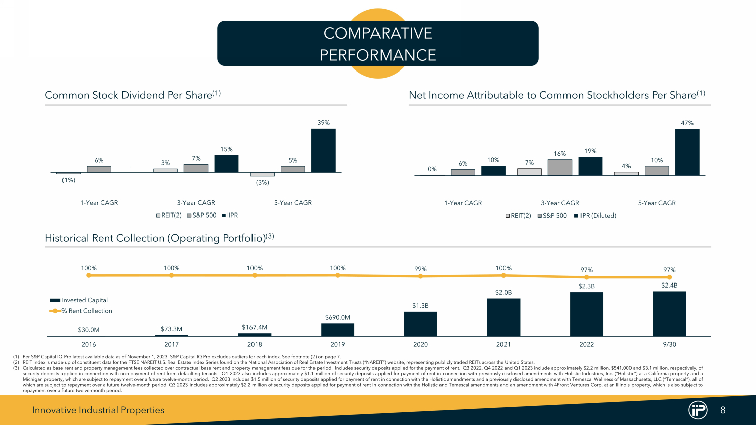 Innovative Industrial Properties 8 (1%) 3% (3%) 6% 7% 5% - 15% 39% 1-Year CAGR 3-Year CAGR 5-Year CAGR REIT(2) S&P 500 IIPR Common Stock Dividend Per Share (1) 0% 7% 4% 6% 16% 10% 10% 19% 47% 1-Year CAGR 3-Year CAGR 5-Year CAGR REIT(2) S&P 500 IIPR (Diluted) Net Income Attributable to Common Stockholders Per Share (1) COMPARATIVE PERFORMANCE (1) Per S&P Capital IQ Pro latest available data as of November 1 , 2023 . S&P Capital IQ Pro excludes outliers for each index . See footnote ( 2 ) on page 7 . (2) REIT index is made up of constituent data for the FTSE NAREIT U . S . Real Estate Index Series found on the National Association of Real Estate Investment Trusts (“NAREIT”) website, representing publicly traded REITs across the United States . (3) Calculated as base rent and property management fees collected over contractual base rent and property management fees due for the period . Includes security deposits applied for the payment of rent . Q 3 2022 , Q 4 2022 and Q 1 2023 include approximately $ 2 . 2 million, $ 541 , 000 and $ 3 . 1 million, respectively, of security deposits applied in connection with non - payment of rent from defaulting tenants . Q 1 2023 also includes approximately $ 1 . 1 million of security deposits applied for payment of rent in connection with previously disclosed amendments with Holistic Industries, Inc . (“Holistic”) at a California property and a Michigan property, which are subject to repayment over a future twelve - month period . Q 2 2023 includes $ 1 . 5 million of security deposits applied for payment of rent in connection with the Holistic amendments and a previously disclosed amendment with Temescal Wellness of Massachusetts, LLC (“Temescal”), all of which are subject to repayment over a future twelve - month period . Q 3 2023 includes approximately $ 2 . 2 million of security deposits applied for payment of rent in connection with the Holistic and Temescal amendments and an amendment with 4 Front Ventures Corp . at an Illinois property, which is also subject to repayment over a future twelve - month period . $30.0M $73.3M $167.4M $690.0M $1.3B $2.0B $2.3B $2.4B 100% 100% 100% 100% 99% 100% 97% 97% 2016 2017 2018 2019 2020 2021 2022 9/30 Invested Capital % Rent Collection Historical Rent Collection (Operating Portfolio) (3)