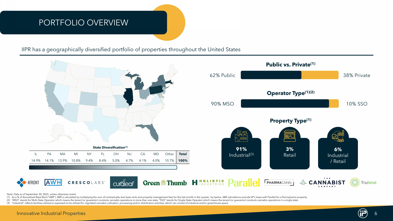 Innovative Industrial Properties 5 # of Tenants by Yea r (5) # of Properties by Year # of States by Year 1 4 9 14 17 19 19 19 2016 2017 2018 2019 2020 2021 2022 9/30 1 4 8 18 20 26 29 29 2016 2017 2018 2019 2020 2021 2022 9/30 Capital Committed by Year ($) (1) 30.0M 73.3M 167.4M 690.0M 1.3B 2.0B 2.3B 2.4B 2016 2017 2018 2019 2020 2021 2022 9/30 IIPR AS OF SEPTEMBER 30, 2023 Note : Data as of September 30 , 2023 , unless otherwise noted . (1) Total Committed / Invested Capital includes ( 1 ) total investments in properties (consisting of purchase price and construction funding and improvements reimbursed to tenants, if any, but excluding transaction costs) and ( 2 ) total additional commitments to reimburse certain tenants and sellers for completion of construction and improvements at the properties . Excludes a $ 23 . 0 million loan commitment from us to a developer for construction of a regulated cannabis cultivation and processing facility in California and a seller - financed note issued to us by the buyer in connection with our disposition of a portfolio of four properties in southern California . (2) Operating Portfolio is defined as all properties that (a) are leased or (b) are not leased but ready for their intended use . Includes approximately 816 , 000 square feet under development or redevelopment . Vacancy included three industrial properties previously occupied by Kings Garden until late September 2023 and two retail properties, totaling 122 , 000 square feet . (3) Reflects annualized common stock dividend paid on October 13 , 2023 of $ 1 . 80 per share . The decision to declare or pay dividends is in the sole discretion of our board of directors in light of conditions then existing, and there can be no assurance that a dividend will be declared or paid for any time period in any amount . (4) Weighted average lease length calculated by weighting the remaining lease term based on the base rent and management fees, after the expiration of applicable base rent phase - in periods for the Operating Portfolio . (5) Each “Tenant” represents the parent company of the tenant, for which the parent company has provided a corporate guaranty . A parent company may have multiple tenant subsidiaries across IIP’s properties . Includes one tenant for a pre - leased and under - development property in CA . $2.4B Total Committed / Invested Capital (1) 108 Properties (Operating Portfolio - 103) (2) 8.1M Rentable Square Feet - Operating Portfolio (2) 19 U.S. States $7.20 Q3 2023 Annualized Dividend (3) $77.8M Q3 2023 Total Revenue 14.9 Years Weighted Average Lease Length (4) 1 5 11 45 65 102 110 108 2016 2017 2018 2019 2020 2021 2022 9/30
