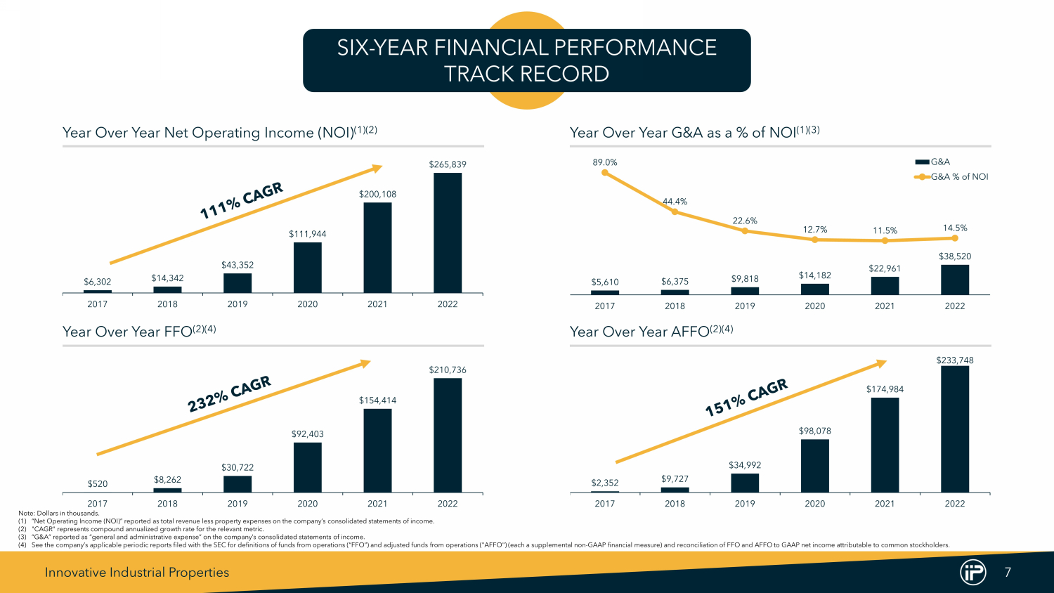 Innovative Industrial Properties 7 SIX - YEAR FINANCIAL PERFORMANCE TRACK RECORD Note : Dollars in thousands . (1) “Net Operating Income (NOI)” reported as total revenue less property expenses on the company’s consolidated statements of income . (2) "CAGR" represents compound annualized growth rate for the relevant metric . (3) “G&A” reported as “general and administrative expense” on the company’s consolidated statements of income . (4) See the company’s applicable periodic reports filed with the SEC for definitions of funds from operations (“FFO”) and adjusted funds from operations ("AFFO") (each a supplemental non - GAAP financial measure) and reconciliation of FFO and AFFO to GAAP net income attributable to common stockholders . $2,352 $9,727 $34,992 $98,078 $174,984 $233,748 2017 2018 2019 2020 2021 2022 Year Over Year AFFO (2)(4) Year Over Year G&A as a % of NOI (1)(3) $5,610 $6,375 $9,818 $14,182 $22,961 $38,520 89.0% 44.4% 22.6% 12.7% 11.5% 14.5% 2017 2018 2019 2020 2021 2022 G&A G&A % of NOI Year Over Year FFO (2)(4) $520 $8,262 $30,722 $92,403 $154,414 $210,736 2017 2018 2019 2020 2021 2022 Year Over Year Net Operating Income (NOI) (1)(2) $6,302 $14,342 $43,352 $111,944 $200,108 $265,839 2017 2018 2019 2020 2021 2022