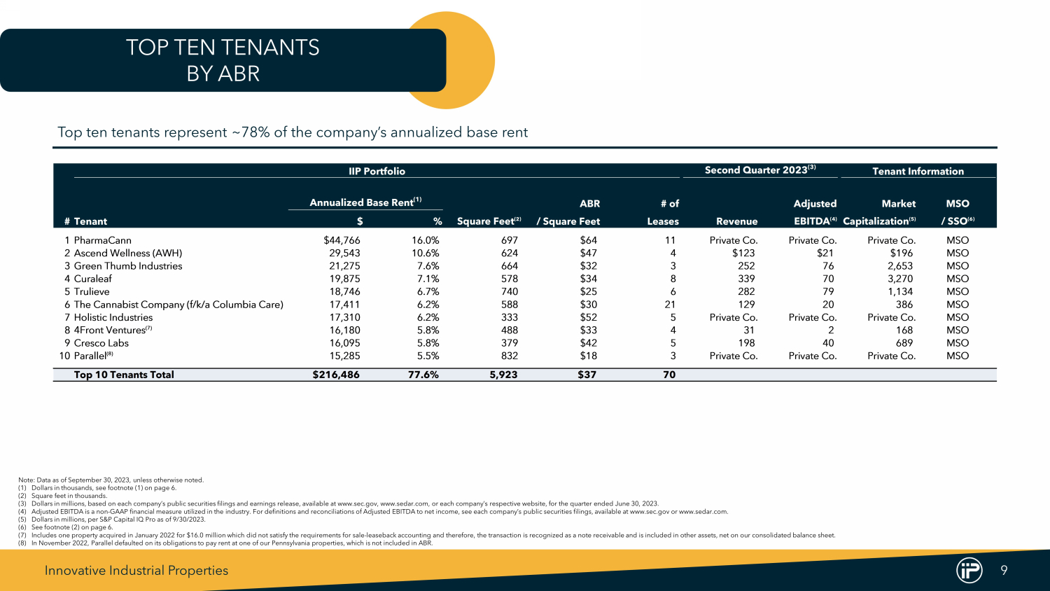 Innovative Industrial Properties 9 IIP Portfolio Second Quarter 2023 (3) Tenant Information Annualized Base Rent (1) ABR # of Adjusted Market MSO #Tenant $ % Square Feet (2) / Square Feet Leases Revenue EBITDA (4) Capitalization (5) / SSO (6) 1PharmaCann $44,766 16.0% 697 $64 11 Private Co. Private Co. Private Co. MSO 2Ascend Wellness (AWH) 29,543 10.6% 624 $47 4 $123 $21 $196 MSO 3Green Thumb Industries 21,275 7.6% 664 $32 3 252 76 2,653 MSO 4Curaleaf 19,875 7.1% 578 $34 8 339 70 3,270 MSO 5Trulieve 18,746 6.7% 740 $25 6 282 79 1,134 MSO 6The Cannabist Company (f/k/a Columbia Care) 17,411 6.2% 588 $30 21 129 20 386 MSO 7Holistic Industries 17,310 6.2% 333 $52 5 Private Co. Private Co. Private Co. MSO 8 4Front Ventures (7) 16,180 5.8% 488 $33 4 31 2 168 MSO 9Cresco Labs 16,095 5.8% 379 $42 5 198 40 689 MSO 10 Parallel (8) 15,285 5.5% 832 $18 3 Private Co. Private Co. Private Co. MSO Top 10 Tenants Total $216,486 77.6% 5,923 $37 70 TOP TEN TENANTS BY ABR Note : Data as of September 30 , 2023 , unless otherwise noted . (1) Dollars in thousands, see footnote ( 1 ) on page 6 . (2) Square feet in thousands . (3) Dollars in millions, based on each company’s public securities filings and earnings release, available at www . sec . gov, www . sedar . com, or each company’s respective website, for the quarter ended June 30 , 2023 . (4) Adjusted EBITDA is a non - GAAP financial measure utilized in the industry . For definitions and reconciliations of Adjusted EBITDA to net income, see each company’s public securities filings, available at www . sec . gov or www . sedar . com . (5) Dollars in millions, per S&P Capital IQ Pro as of 9 / 30 / 2023 . (6) See footnote ( 2 ) on page 6 . (7) Includes one property acquired in January 2022 for $ 16 . 0 million which did not satisfy the requirements for sale - leaseback accounting and therefore, the transaction is recognized as a note receivable and is included in other assets, net on our consolidated balance sheet . (8) In November 2022 , Parallel defaulted on its obligations to pay rent at one of our Pennsylvania properties, which is not included in ABR . Top ten tenants represent ~78% of the company’s annualized base rent