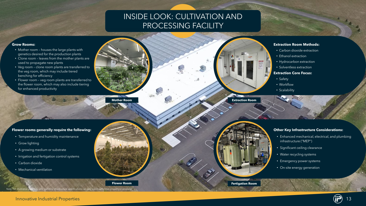 Innovative Industrial Properties 13 Grow Rooms: • Mother room – houses the large plants with genetics desired for the production plants • Clone room – leaves from the mother plants are used to propagate new plants • Veg room – clone room plants are transferred to the veg room, which may include tiered benching for efficiency • Flower room – veg room plants are transferred to the flower room, which may also include tiering for enhanced productivity Flower rooms generally require the following : • Temperature and humidity maintenance • Grow lighting • A growing medium or substrate • Irrigation and fertigation control systems • Carbon dioxide • Mechanical ventilation Other Key Infrastructure Considerations: • Enhanced mechanical, electrical, and plumbing infrastructure (“MEP”) • Significant ceiling clearance • Water recycling systems • Emergency power systems • On - site energy generation Note : For illustrative purposes only ; building infrastructure specifications can vary significantly from property to property . INSIDE LOOK: CULTIVATION AND PROCESSING FACILITY Mother Room Flower Room Fertigation Room Extraction Room Extraction Room Methods: • Carbon dioxide extraction • Ethanol extraction • Hydrocarbon extraction • Solventless extraction Extraction Core Focus: • Safety • Workflow • Scalability
