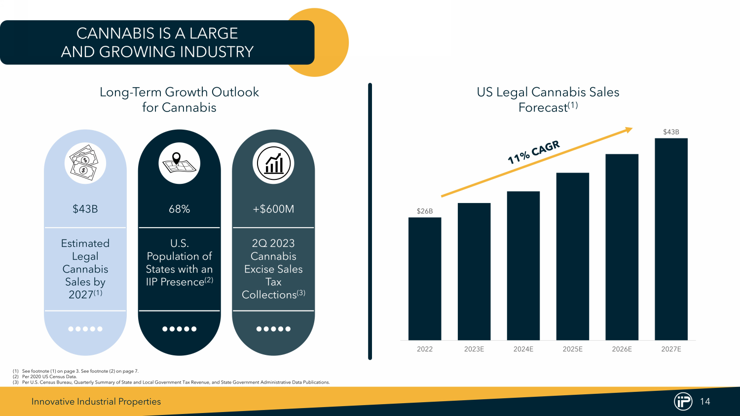 Innovative Industrial Properties 14 CANNABIS IS A LARGE AND GROWING INDUSTRY $26B $43B 2022 2023E 2024E 2025E 2026E 2027E Long - Term Growth Outlook for Cannabis $43B Estimated Legal Cannabis Sales by 2027 (1) 68% U.S. Population of States with an IIP Presence (2) +$600M 2Q 2023 Cannabis Excise Sales Tax Collections (3) (1) See footnote ( 1 ) on page 3 . See footnote ( 2 ) on page 7 . (2) Per 2020 US Census Data . (3) Per U . S . Census Bureau, Quarterly Summary of State and Local Government Tax Revenue, and State Government Administrative Data Publications . US Legal Cannabis Sales Forecast (1)