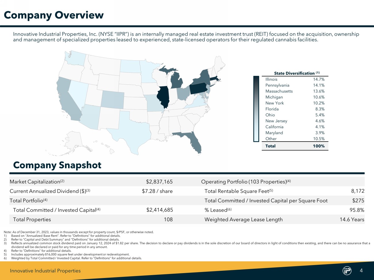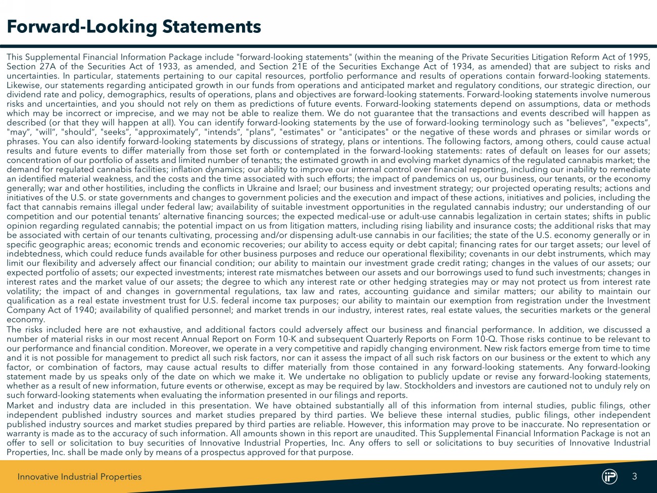Innovative Industrial Properties 3 Forward - Looking Statements This Supplemental Financial Information Package include "forward - looking statements" (within the meaning of the Private Securities Litigation Reform Act of 1995 , Section 27 A of the Securities Act of 1933 , as amended, and Section 21 E of the Securities Exchange Act of 1934 , as amended) that are subject to risks and uncertainties . In particular, statements pertaining to our capital resources, portfolio performance and results of operations contain forward - looking statements . Likewise, our statements regarding anticipated growth in our funds from operations and anticipated market and regulatory conditions, our strategic direction, our dividend rate and policy, demographics, results of operations, plans and objectives are forward - looking statements . Forward - looking statements involve numerous risks and uncertainties, and you should not rely on them as predictions of future events . Forward - looking statements depend on assumptions, data or methods which may be incorrect or imprecise, and we may not be able to realize them . We do not guarantee that the transactions and events described will happen as described (or that they will happen at all) . You can identify forward - looking statements by the use of forward - looking terminology such as "believes“, "expects“, "may“, "will“, "should“, "seeks“, "approximately“, "intends“, "plans“, "estimates" or "anticipates" or the negative of these words and phrases or similar words or phrases . You can also identify forward - looking statements by discussions of strategy, plans or intentions . The following factors, among others, could cause actual results and future events to differ materially from those set forth or contemplated in the forward - looking statements : rates of default on leases for our assets ; concentration of our portfolio of assets and limited number of tenants ; the estimated growth in and evolving market dynamics of the regulated cannabis market ; the demand for regulated cannabis facilities ; inflation dynamics ; our ability to improve our internal control over financial reporting, including our inability to remediate an identified material weakness, and the costs and the time associated with such efforts ; the impact of pandemics on us, our business, our tenants, or the economy generally ; war and other hostilities, including the conflicts in Ukraine and Israel ; our business and investment strategy ; our projected operating results ; actions and initiatives of the U . S . or state governments and changes to government policies and the execution and impact of these actions, initiatives and policies, including the fact that cannabis remains illegal under federal law ; availability of suitable investment opportunities in the regulated cannabis industry ; our understanding of our competition and our potential tenants’ alternative financing sources ; the expected medical - use or adult - use cannabis legalization in certain states ; shifts in public opinion regarding regulated cannabis ; the potential impact on us from litigation matters, including rising liability and insurance costs ; the additional risks that may be associated with certain of our tenants cultivating, processing and/or dispensing adult - use cannabis in our facilities ; the state of the U . S . economy generally or in specific geographic areas ; economic trends and economic recoveries ; our ability to access equity or debt capital ; financing rates for our target assets ; our level of indebtedness, which could reduce funds available for other business purposes and reduce our operational flexibility ; covenants in our debt instruments, which may limit our flexibility and adversely affect our financial condition ; our ability to maintain our investment grade credit rating ; changes in the values of our assets ; our expected portfolio of assets ; our expected investments ; interest rate mismatches between our assets and our borrowings used to fund such investments ; changes in interest rates and the market value of our assets ; the degree to which any interest rate or other hedging strategies may or may not protect us from interest rate volatility ; the impact of and changes in governmental regulations, tax law and rates, accounting guidance and similar matters ; our ability to maintain our qualification as a real estate investment trust for U . S . federal income tax purposes ; our ability to maintain our exemption from registration under the Investment Company Act of 1940 ; availability of qualified personnel ; and market trends in our industry, interest rates, real estate values, the securities markets or the general economy . The risks included here are not exhaustive, and additional factors could adversely affect our business and financial performance . In addition, we discussed a number of material risks in our most recent Annual Report on Form 10 - K and subsequent Quarterly Reports on Form 10 - Q . Those risks continue to be relevant to our performance and financial condition . Moreover, we operate in a very competitive and rapidly changing environment . New risk factors emerge from time to time and it is not possible for management to predict all such risk factors, nor can it assess the impact of all such risk factors on our business or the extent to which any factor, or combination of factors, may cause actual results to differ materially from those contained in any forward - looking statements . Any forward - looking statement made by us speaks only of the date on which we make it . We undertake no obligation to publicly update or revise any forward - looking statements, whether as a result of new information, future events or otherwise, except as may be required by law . Stockholders and investors are cautioned not to unduly rely on such forward - looking statements when evaluating the information presented in our filings and reports . Market and industry d