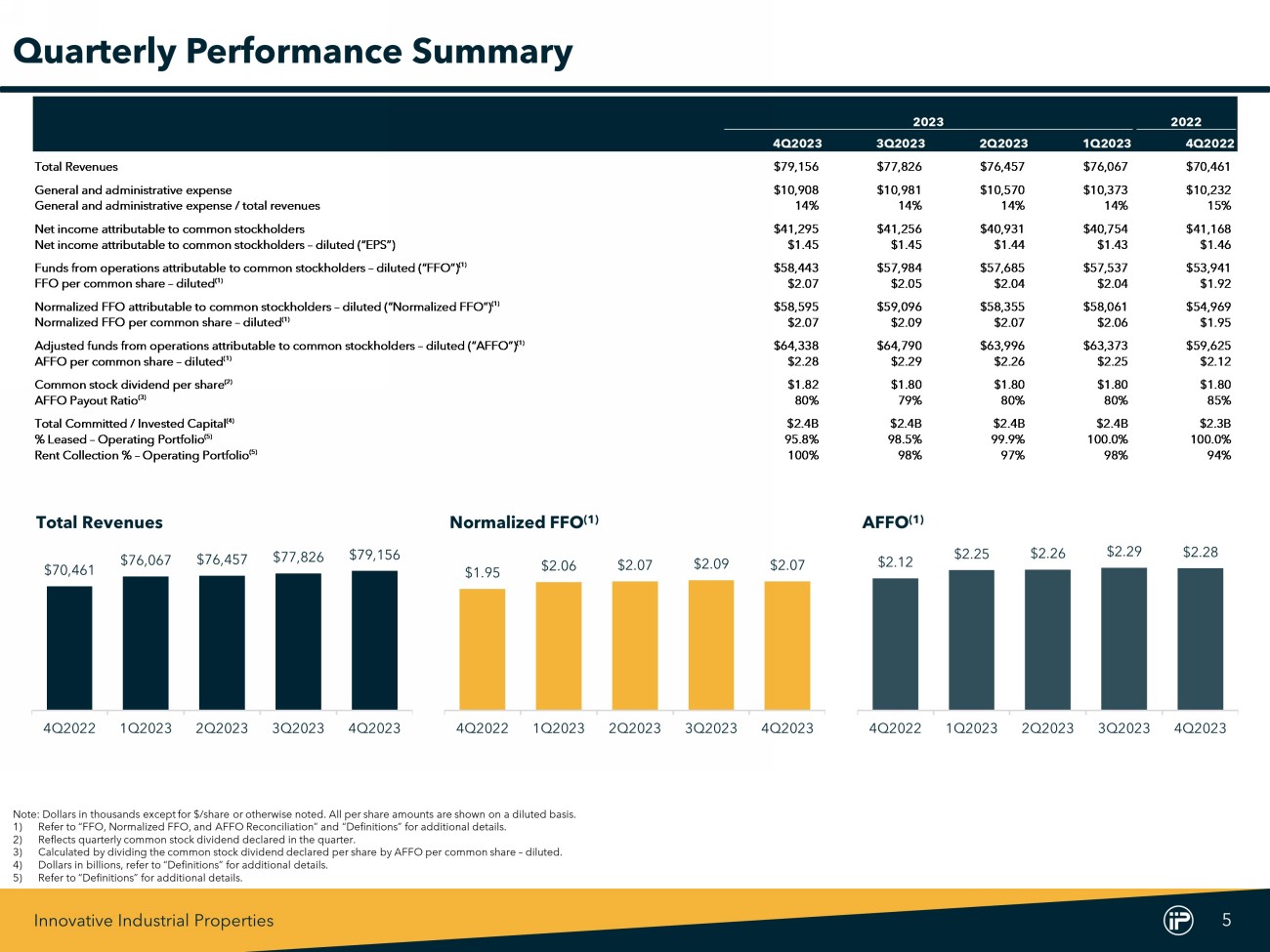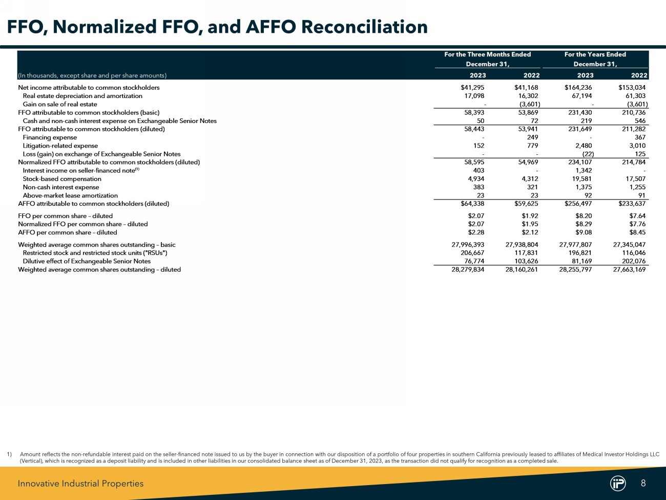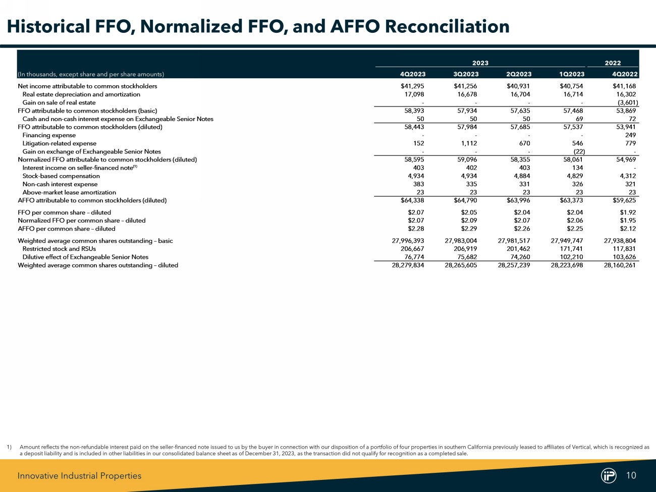 Innovative Industrial Properties 10 2023 2022 (In thousands, except share and per share amounts) 4Q2023 3Q2023 2Q2023 1Q2023 4Q2022 Net income attributable to common stockholders $41,295 $41,256 $40,931 $40,754 $41,168 Real estate depreciation and amortization 17,098 16,678 16,704 16,714 16,302 Gain on sale of real estate - - - - (3,601) FFO attributable to common stockholders (basic) 58,393 57,934 57,635 57,468 53,869 Cash and non-cash interest expense on Exchangeable Senior Notes 50 50 50 69 72 FFO attributable to common stockholders (diluted) 58,443 57,984 57,685 57,537 53,941 Financing expense - - - - 249 Litigation-related expense 152 1,112 670 546 779 Gain on exchange of Exchangeable Senior Notes - - - (22) - Normalized FFO attributable to common stockholders (diluted) 58,595 59,096 58,355 58,061 54,969 Interest income on seller-financed note (1) 403 402 403 134 - Stock-based compensation 4,934 4,934 4,884 4,829 4,312 Non-cash interest expense 383 335 331 326 321 Above-market lease amortization 23 23 23 23 23 AFFO attributable to common stockholders (diluted) $64,338 $64,790 $63,996 $63,373 $59,625 FFO per common share – diluted $2.07 $2.05 $2.04 $2.04 $1.92 Normalized FFO per common share – diluted $2.07 $2.09 $2.07 $2.06 $1.95 AFFO per common share – diluted $2.28 $2.29 $2.26 $2.25 $2.12 Weighted average common shares outstanding – basic 27,996,393 27,983,004 27,981,517 27,949,747 27,938,804 Restricted stock and RSUs 206,667 206,919 201,462 171,741 117,831 Dilutive effect of Exchangeable Senior Notes 76,774 75,682 74,260 102,210 103,626 Weighted average common shares outstanding – diluted 28,279,834 28,265,605 28,257,239 28,223,698 28,160,261 Historical FFO, Normalized FFO, and AFFO Reconciliation 1) Amount reflects the non - refundable interest paid on the seller - financed note issued to us by the buyer in connection with our disposition of a portfolio of four properties in southern California previously leased to affiliates of Vertical, which is recognized as a deposit liability and is included in other liabilities in our consolidated balance sheet as of December 31 , 2023 , as the transaction did not qualify for recognition as a completed sale .