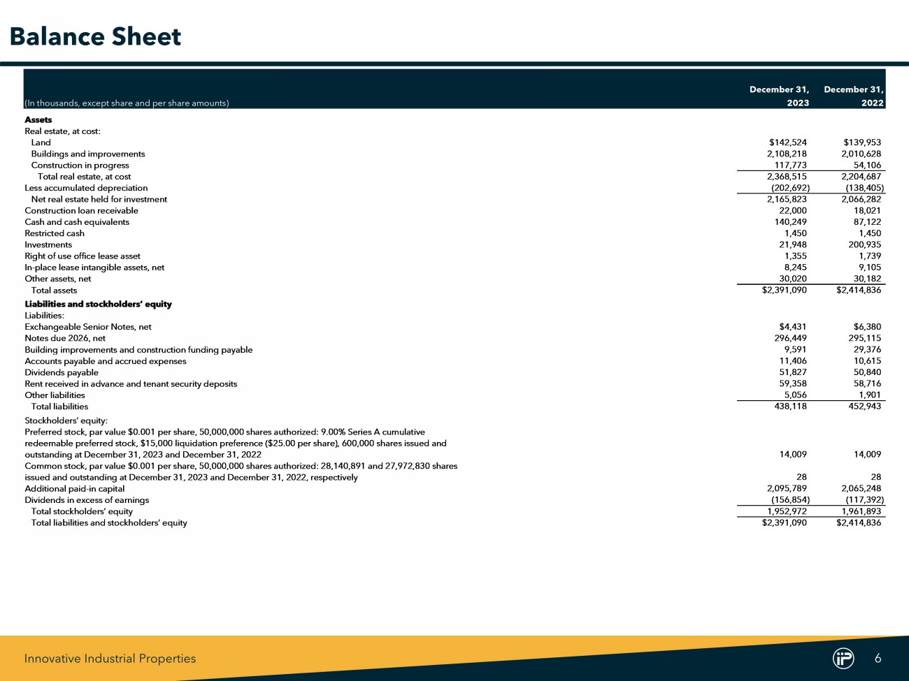 Innovative Industrial Properties 6 December 31, December 31, (In thousands, except share and per share amounts) 2023 2022 Assets Real estate, at cost: Land $142,524 $139,953 Buildings and improvements 2,108,218 2,010,628 Construction in progress 117,773 54,106 Total real estate, at cost 2,368,515 2,204,687 Less accumulated depreciation (202,692) (138,405) Net real estate held for investment 2,165,823 2,066,282 Construction loan receivable 22,000 18,021 Cash and cash equivalents 140,249 87,122 Restricted cash 1,450 1,450 Investments 21,948 200,935 Right of use office lease asset 1,355 1,739 In-place lease intangible assets, net 8,245 9,105 Other assets, net 30,020 30,182 Total assets $2,391,090 $2,414,836 Liabilities and stockholders’ equity Liabilities: Exchangeable Senior Notes, net $4,431 $6,380 Notes due 2026, net 296,449 295,115 Building improvements and construction funding payable 9,591 29,376 Accounts payable and accrued expenses 11,406 10,615 Dividends payable 51,827 50,840 Rent received in advance and tenant security deposits 59,358 58,716 Other liabilities 5,056 1,901 Total liabilities 438,118 452,943 Stockholders’ equity: Preferred stock, par value $0.001 per share, 50,000,000 shares authorized: 9.00% Series A cumulative redeemable preferred stock, $15,000 liquidation preference ($25.00 per share), 600,000 shares issued and outstanding at December 31, 2023 and December 31, 2022 14,009 14,009 Common stock, par value $0.001 per share, 50,000,000 shares authorized: 28,140,891 and 27,972,830 shares issued and outstanding at December 31, 2023 and December 31, 2022, respectively 28 28 Additional paid-in capital 2,095,789 2,065,248 Dividends in excess of earnings (156,854) (117,392) Total stockholders’ equity 1,952,972 1,961,893 Total liabilities and stockholders’ equity $2,391,090 $2,414,836 Balance Sheet