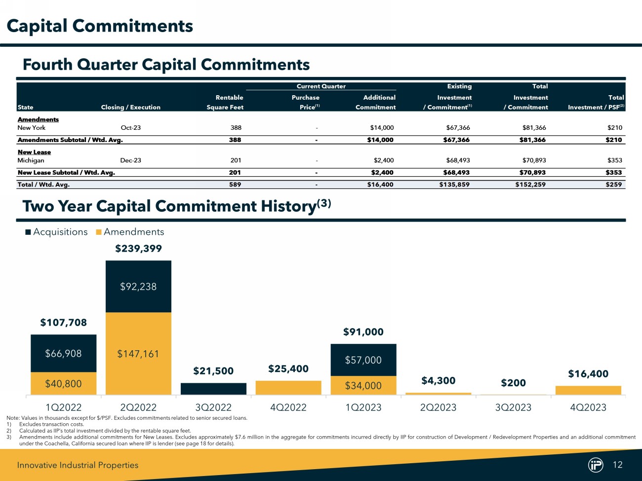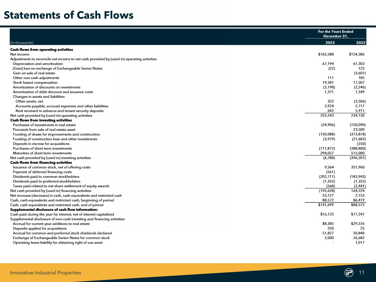 Innovative Industrial Properties 11 For the Years Ended December 31, (In thousands) 2023 2022 Cash flows from operating activities Net income $165,588 $154,386 Adjustments to reconcile net income to net cash provided by (used in) operating activities Depreciation and amortization 67,194 61,303 (Gain) loss on exchange of Exchangeable Senior Notes (22) 125 Gain on sale of real estate - (3,601) Other non-cash adjustments 111 185 Stock-based compensation 19,581 17,507 Amortization of discounts on investments (3,198) (2,246) Amortization of debt discount and issuance costs 1,371 1,349 Changes in assets and liabilities Other assets, net 352 (3,506) Accounts payable, accrued expenses and other liabilities 3,924 2,717 Rent received in advance and tenant security deposits 642 5,911 Net cash provided by (used in) operating activities 255,543 234,130 Cash flows from investing activities Purchases of investments in real estate (34,906) (150,090) Proceeds from sale of real estate asset - 23,500 Funding of draws for improvements and construction (150,088) (373,878) Funding of construction loan and other investments (3,979) (21,683) Deposits in escrow for acquisitions - (250) Purchases of short-term investments (111,872) (388,800) Maturities of short-term investments 294,057 515,000 Net cash provided by (used in) investing activities (6,788) (396,201) Cash flows from financing activities Issuance of common stock, net of offering costs 9,564 351,960 Payment of deferred financing costs (561) - Dividends paid to common stockholders (202,711) (183,943) Dividends paid to preferred stockholders (1,352) (1,352) Taxes paid related to net share settlement of equity awards (568) (2,441) Net cash provided by (used in) financing activities (195,628) 164,224 Net increase (decrease) in cash, cash equivalents and restricted cash 53,127 2,153 Cash, cash equivalents and restricted cash, beginning of period 88,572 86,419 Cash, cash equivalents and restricted cash, end of period $141,699 $88,572 Supplemental disclosure of cash flow information: Cash paid during the year for interest, net of interest capitalized $16,125 $17,247 Supplemental disclosure of non-cash investing and financing activities: Accrual for current-year additions to real estate $8,385 $29,376 Deposits applied for acquisitions 250 25 Accrual for common and preferred stock dividends declared 51,827 50,840 Exchange of Exchangeable Senior Notes for common stock 2,000 26,682 Operating lease liability for obtaining right of use asset - 1,017 Statements of Cash Flows