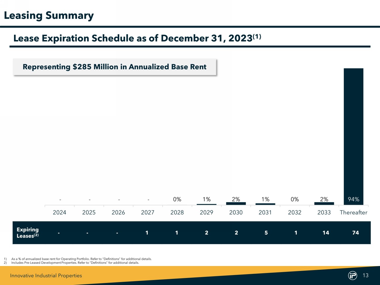 Innovative Industrial Properties 12 Current Quarter Existing Total Rentable Purchase Additional Investment Investment Total State Closing / Execution Square Feet Price (1) Commitment / Commitment (1) / Commitment Investment / PSF (2) Amendments New York Oct-23 388 - $14,000 $67,366 $81,366 $210 Amendments Subtotal / Wtd. Avg. 388 - $14,000 $67,366 $81,366 $210 New Lease Michigan Dec-23 201 - $2,400 $68,493 $70,893 $353 New Lease Subtotal / Wtd. Avg. 201 - $2,400 $68,493 $70,893 $353 Total / Wtd. Avg. 589 - $16,400 $135,859 $152,259 $259 Capital Commitments Note : Values in thousands except for $ /PSF . Excludes commitments related to senior secured loans . 1) Excludes transaction costs . 2) Calculated as IIP’s total investment divided by the rentable square feet . 3) Amendments include additional commitments for New Leases . Excludes approximately $ 7 . 6 million in the aggregate for commitments incurred directly by IIP for construction of Development / Redevelopment Properties and an additional commitment under the Coachella, California secured loan where IIP is lender (see page 18 for details) . $40,800 $147,161 $34,000 $66,908 $92,238 $57,000 $107,708 $239,399 $21,500 $25,400 $91,000 $4,300 $200 $16,400 1Q2022 2Q2022 3Q2022 4Q2022 1Q2023 2Q2023 3Q2023 4Q2023 Acquisitions Amendments Fourth Quarter Capital Commitments Two Year Capital Commitment History (3)