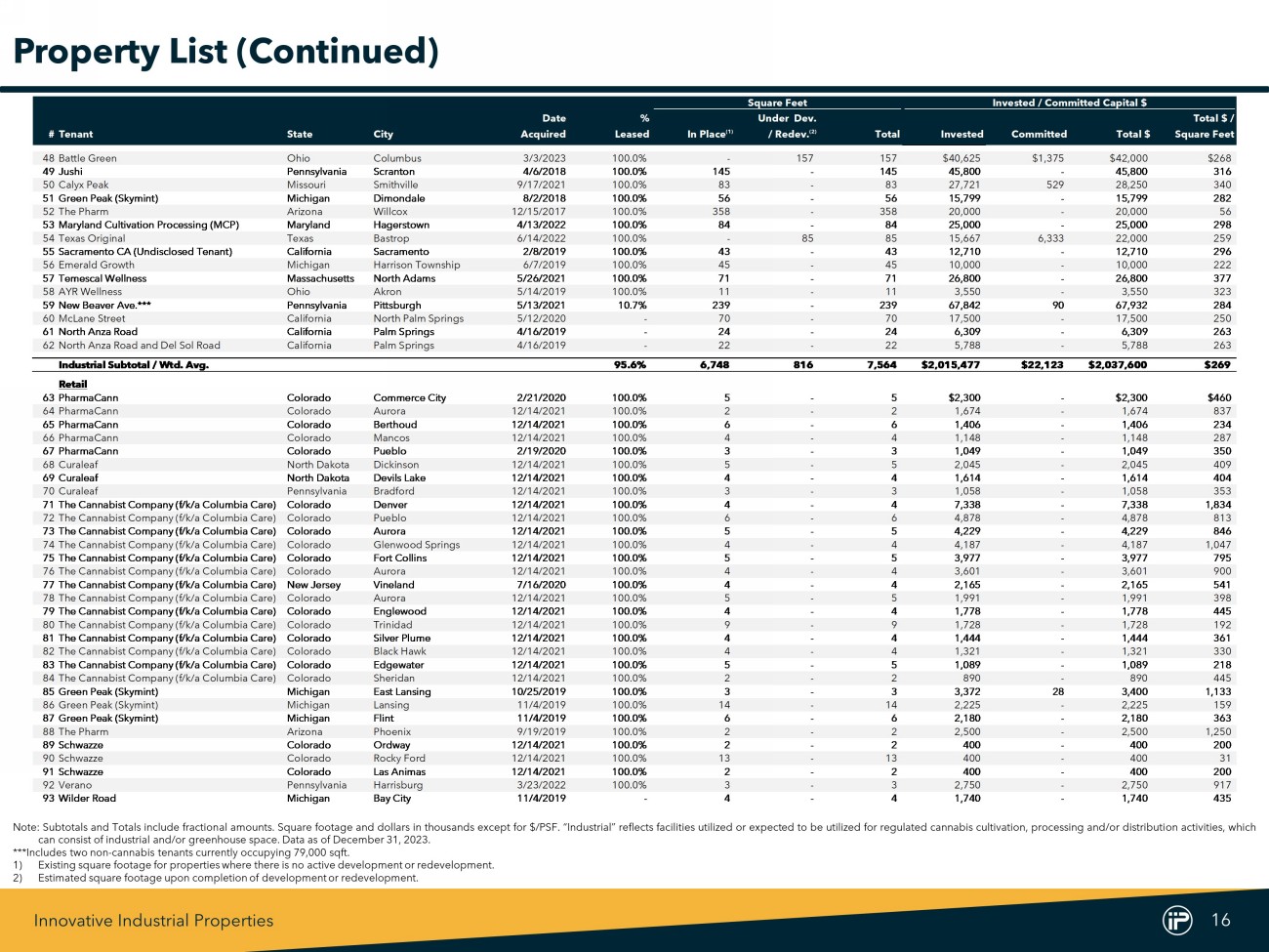 Innovative Industrial Properties 15 Square Feet Invested / Committed Capital $ Date % Under Dev. Total $ / #Tenant State City Acquired Leased In Place (1) / Redev. (2) Total Invested Committed Total $ Square Feet Industrial 1PharmaCann New York Hamptonburgh 12/19/2016 100.0% 234 - 234 $122,959 $541 $123,500 $528 2PharmaCann Michigan Warren 10/9/2019 100.0% 205 - 205 83,045 550 83,595 408 3PharmaCann Massachusetts Holliston 5/31/2018 100.0% 58 - 58 30,500 - 30,500 526 4PharmaCann Pennsylvania Scott Township 8/7/2019 100.0% 56 - 56 28,000 - 28,000 500 5PharmaCann Illinois Dwight 10/30/2019 100.0% 66 - 66 28,000 - 28,000 424 6PharmaCann Ohio Buckeye Lake Village 3/13/2019 100.0% 58 - 58 20,000 - 20,000 345 7Ascend Wellness Holdings Illinois Barry 12/21/2018 100.0% 166 - 166 71,000 - 71,000 428 8Ascend Wellness Holdings Massachusetts Athol 4/2/2020 100.0% 199 - 199 63,900 - 63,900 321 9Ascend Wellness Holdings New Jersey Franklin 2/10/2022 100.0% 114 - 114 54,500 500 55,000 482 10Ascend Wellness Holdings Michigan Lansing 7/2/2019 100.0% 145 - 145 24,150 - 24,150 167 11Green Thumb Industries Pennsylvania Danville 11/12/2019 100.0% 300 - 300 94,600 - 94,600 315 12Green Thumb Industries Illinois Oglesby 3/6/2020 100.0% 266 - 266 50,000 - 50,000 188 13Green Thumb Industries Ohio Toledo 1/31/2020 100.0% 98 - 98 32,200 - 32,200 329 14Curaleaf Pennsylvania Chambersburg 12/20/2019 100.0% 179 - 179 60,889 751 61,640 344 15Curaleaf Illinois Litchfield 10/30/2019 100.0% 127 - 127 40,000 - 40,000 315 16Curaleaf New Jersey Blue Anchor 7/13/2020 100.0% 123 - 123 35,000 - 35,000 285 17Curaleaf Massachusetts Webster 9/1/2022 100.0% 104 - 104 21,500 - 21,500 207 18Curaleaf North Dakota Fargo 12/20/2019 100.0% 33 - 33 12,190 - 12,190 369 19Trulieve Massachusetts Holyoke 7/26/2019 100.0% 150 - 150 43,500 - 43,500 290 20Trulieve Florida Alachua 1/22/2021 100.0% 295 - 295 41,650 - 41,650 141 21Trulieve Maryland Hancock 8/13/2021 100.0% 115 - 115 29,294 221 29,515 257 22Trulieve Florida Quincy 10/23/2019 100.0% 120 - 120 17,000 - 17,000 142 23Trulieve* Nevada Las Vegas 7/12/2019 100.0% 43 - 43 9,600 - 9,600 223 24Trulieve Arizona Cottonwood 4/27/2022 100.0% 17 - 17 5,238 - 5,238 308 25The Cannabist Company (f/k/a Columbia Care) Pennsylvania Saxton 5/20/2019 100.0% 270 - 270 42,891 109 43,000 159 26The Cannabist Company (f/k/a Columbia Care) Virginia Richmond 1/15/2020 100.0% 82 - 82 19,750 - 19,750 241 27The Cannabist Company (f/k/a Columbia Care) New Jersey Vineland 7/16/2020 100.0% 50 - 50 11,820 - 11,820 236 28The Cannabist Company (f/k/a Columbia Care) Colorado Denver 10/30/2018 100.0% 58 - 58 11,250 - 11,250 194 29The Cannabist Company (f/k/a Columbia Care) Colorado Denver 12/14/2021 100.0% 18 - 18 9,917 - 9,917 551 30The Cannabist Company (f/k/a Columbia Care) Colorado Denver 12/14/2021 100.0% 12 - 12 3,276 - 3,276 273 31Holistic Industries Maryland Capitol Heights 5/26/2017 100.0% 72 - 72 33,719 31 33,750 469 32Holistic Industries Pennsylvania New Castle 6/10/2020 100.0% 108 - 108 25,130 520 25,650 238 33Holistic Industries Massachusetts Monson 7/12/2018 100.0% 55 - 55 19,750 - 19,750 359 344Front Ventures Illinois Matteson 8/3/2021 100.0% - 250 250 66,910 3,240 70,150 281 354Front Ventures Washington Olympia 12/17/2020 100.0% 114 - 114 17,500 - 17,500 154 364Front Ventures** Massachusetts Holliston 1/28/2022 100.0% 57 - 57 16,000 - 16,000 281 374Front Ventures Massachusetts Georgetown 12/17/2020 100.0% 67 - 67 15,500 - 15,500 231 38Cresco Labs Michigan Marshall 4/22/2020 100.0% 115 - 115 32,000 - 32,000 278 39Cresco Labs Illinois Kankakee 10/22/2019 100.0% 51 - 51 25,496 104 25,600 502 40Cresco Labs Illinois Joliet 10/22/2019 100.0% 39 - 39 20,950 - 20,950 537 41Cresco Labs Ohio Yellow Springs 1/24/2020 100.0% 50 - 50 12,927 618 13,545 271 42Parallel Florida Lakeland 9/18/2020 100.0% 220 - 220 56,400 - 56,400 256 43Parallel Florida Wimauma 3/11/2020 100.0% 373 - 373 51,500 - 51,500 138 44Goodness Growth (f/k/a Vireo Health) New York Perth 10/23/2017 100.0% 64 324 388 75,254 6,112 81,366 210 45Goodness Growth (f/k/a Vireo Health) Minnesota Otsego 11/8/2017 100.0% 89 - 89 9,710 - 9,710 109 46Gold Flora California Desert Hot Springs 10/15/2021 100.0% 204 - 204 63,000 500 63,500 311 47TILT Holdings Pennsylvania White Haven 2/15/2023 100.0% 58 - 58 15,000 - 15,000 259 Note : Subtotals and Totals include fractional amounts . Square footage and dollars in thousands except for $ /PSF . “Industrial” reflects facilities utilized or expected to be utilized for regulated cannabis cultivation, processing and/or distribution activities, which can consist of industrial and/or greenhouse space . Data as of December 31 , 2023 . * Harvest Health & Recreation Inc . , which is a subsidiary of Trulieve Inc . , executed a lease guaranty in favor of IIP for tenant’s obligations at the property . **The acquisition of the property did not satisfy the requirements for sale - leaseback accounting and therefore, the transaction is recognized as a note receivable and is included in other assets, net on our consolidated balance sheet . 1) Existing square footage for properties where there is no active development or redevelopment . 2) Estimated square footage upon completion of development or redevelopment . Property List