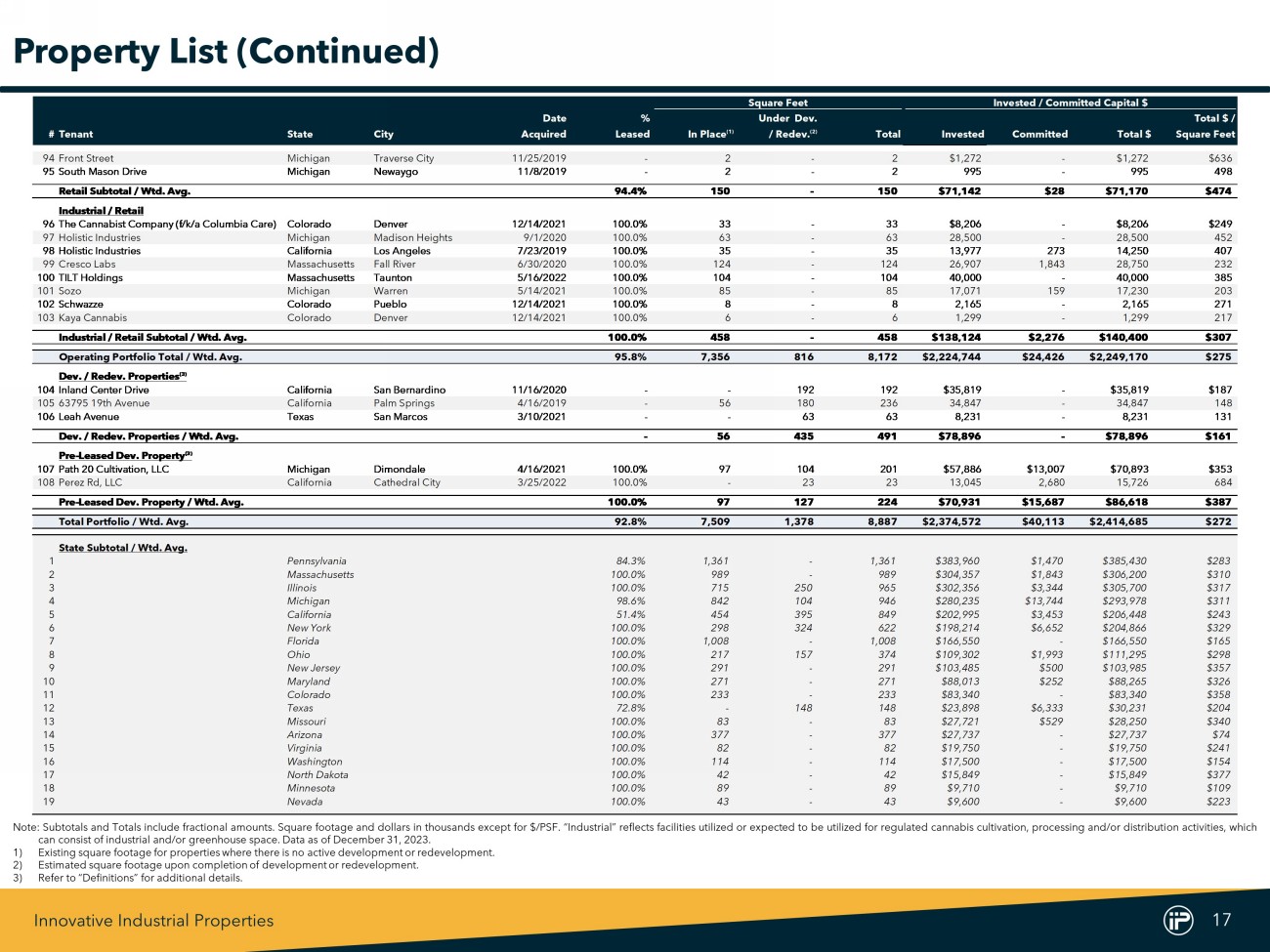 Innovative Industrial Properties 16 Square Feet Invested / Committed Capital $ Date % Under Dev. Total $ / #Tenant State City Acquired Leased In Place (1) / Redev. (2) Total Invested Committed Total $ Square Feet 48Battle Green Ohio Columbus 3/3/2023 100.0% - 157 157 $40,625 $1,375 $42,000 $268 49Jushi Pennsylvania Scranton 4/6/2018 100.0% 145 - 145 45,800 - 45,800 316 50Calyx Peak Missouri Smithville 9/17/2021 100.0% 83 - 83 27,721 529 28,250 340 51Green Peak (Skymint) Michigan Dimondale 8/2/2018 100.0% 56 - 56 15,799 - 15,799 282 52The Pharm Arizona Willcox 12/15/2017 100.0% 358 - 358 20,000 - 20,000 56 53Maryland Cultivation Processing (MCP) Maryland Hagerstown 4/13/2022 100.0% 84 - 84 25,000 - 25,000 298 54Texas Original Texas Bastrop 6/14/2022 100.0% - 85 85 15,667 6,333 22,000 259 55Sacramento CA (Undisclosed Tenant) California Sacramento 2/8/2019 100.0% 43 - 43 12,710 - 12,710 296 56Emerald Growth Michigan Harrison Township 6/7/2019 100.0% 45 - 45 10,000 - 10,000 222 57Temescal Wellness Massachusetts North Adams 5/26/2021 100.0% 71 - 71 26,800 - 26,800 377 58AYR Wellness Ohio Akron 5/14/2019 100.0% 11 - 11 3,550 - 3,550 323 59New Beaver Ave.*** Pennsylvania Pittsburgh 5/13/2021 10.7% 239 - 239 67,842 90 67,932 284 60McLane Street California North Palm Springs 5/12/2020 - 70 - 70 17,500 - 17,500 250 61North Anza Road California Palm Springs 4/16/2019 - 24 - 24 6,309 - 6,309 263 62North Anza Road and Del Sol Road California Palm Springs 4/16/2019 - 22 - 22 5,788 - 5,788 263 Industrial Subtotal / Wtd. Avg. 95.6% 6,748 816 7,564 $2,015,477 $22,123 $2,037,600 $269 Retail 63PharmaCann Colorado Commerce City 2/21/2020 100.0% 5 - 5 $2,300 - $2,300 $460 64PharmaCann Colorado Aurora 12/14/2021 100.0% 2 - 2 1,674 - 1,674 837 65PharmaCann Colorado Berthoud 12/14/2021 100.0% 6 - 6 1,406 - 1,406 234 66PharmaCann Colorado Mancos 12/14/2021 100.0% 4 - 4 1,148 - 1,148 287 67PharmaCann Colorado Pueblo 2/19/2020 100.0% 3 - 3 1,049 - 1,049 350 68Curaleaf North Dakota Dickinson 12/14/2021 100.0% 5 - 5 2,045 - 2,045 409 69Curaleaf North Dakota Devils Lake 12/14/2021 100.0% 4 - 4 1,614 - 1,614 404 70Curaleaf Pennsylvania Bradford 12/14/2021 100.0% 3 - 3 1,058 - 1,058 353 71The Cannabist Company (f/k/a Columbia Care) Colorado Denver 12/14/2021 100.0% 4 - 4 7,338 - 7,338 1,834 72The Cannabist Company (f/k/a Columbia Care) Colorado Pueblo 12/14/2021 100.0% 6 - 6 4,878 - 4,878 813 73The Cannabist Company (f/k/a Columbia Care) Colorado Aurora 12/14/2021 100.0% 5 - 5 4,229 - 4,229 846 74The Cannabist Company (f/k/a Columbia Care) Colorado Glenwood Springs 12/14/2021 100.0% 4 - 4 4,187 - 4,187 1,047 75The Cannabist Company (f/k/a Columbia Care) Colorado Fort Collins 12/14/2021 100.0% 5 - 5 3,977 - 3,977 795 76The Cannabist Company (f/k/a Columbia Care) Colorado Aurora 12/14/2021 100.0% 4 - 4 3,601 - 3,601 900 77The Cannabist Company (f/k/a Columbia Care) New Jersey Vineland 7/16/2020 100.0% 4 - 4 2,165 - 2,165 541 78The Cannabist Company (f/k/a Columbia Care) Colorado Aurora 12/14/2021 100.0% 5 - 5 1,991 - 1,991 398 79The Cannabist Company (f/k/a Columbia Care) Colorado Englewood 12/14/2021 100.0% 4 - 4 1,778 - 1,778 445 80The Cannabist Company (f/k/a Columbia Care) Colorado Trinidad 12/14/2021 100.0% 9 - 9 1,728 - 1,728 192 81The Cannabist Company (f/k/a Columbia Care) Colorado Silver Plume 12/14/2021 100.0% 4 - 4 1,444 - 1,444 361 82The Cannabist Company (f/k/a Columbia Care) Colorado Black Hawk 12/14/2021 100.0% 4 - 4 1,321 - 1,321 330 83The Cannabist Company (f/k/a Columbia Care) Colorado Edgewater 12/14/2021 100.0% 5 - 5 1,089 - 1,089 218 84The Cannabist Company (f/k/a Columbia Care) Colorado Sheridan 12/14/2021 100.0% 2 - 2 890 - 890 445 85Green Peak (Skymint) Michigan East Lansing 10/25/2019 100.0% 3 - 3 3,372 28 3,400 1,133 86Green Peak (Skymint) Michigan Lansing 11/4/2019 100.0% 14 - 14 2,225 - 2,225 159 87Green Peak (Skymint) Michigan Flint 11/4/2019 100.0% 6 - 6 2,180 - 2,180 363 88The Pharm Arizona Phoenix 9/19/2019 100.0% 2 - 2 2,500 - 2,500 1,250 89Schwazze Colorado Ordway 12/14/2021 100.0% 2 - 2 400 - 400 200 90Schwazze Colorado Rocky Ford 12/14/2021 100.0% 13 - 13 400 - 400 31 91Schwazze Colorado Las Animas 12/14/2021 100.0% 2 - 2 400 - 400 200 92Verano Pennsylvania Harrisburg 3/23/2022 100.0% 3 - 3 2,750 - 2,750 917 93Wilder Road Michigan Bay City 11/4/2019 - 4 - 4 1,740 - 1,740 435 Property List (Continued) Note : Subtotals and Totals include fractional amounts . Square footage and dollars in thousands except for $ /PSF . “Industrial” reflects facilities utilized or expected to be utilized for regulated cannabis cultivation, processing and/or distribution activities, which can consist of industrial and/or greenhouse space . Data as of December 31 , 2023 . ***Includes two non - cannabis tenants currently occupying 79 , 000 sqft . 1) Existing square footage for properties where there is no active development or redevelopment . 2) Estimated square footage upon completion of development or redevelopment .