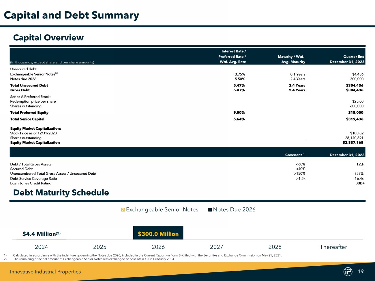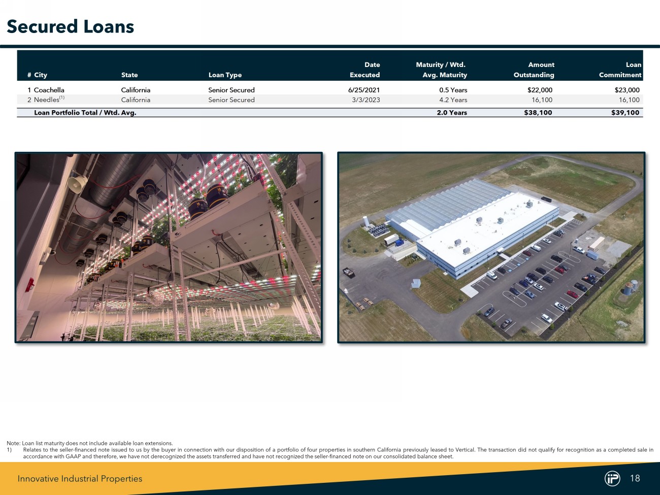 Innovative Industrial Properties 18 Date Maturity / Wtd. Amount Loan #City State Loan Type Executed Avg. Maturity Outstanding Commitment 1Coachella California Senior Secured 6/25/2021 0.5 Years $22,000 $23,000 2 Needles (1) California Senior Secured 3/3/2023 4.2 Years 16,100 16,100 Loan Portfolio Total / Wtd. Avg. 2.0 Years $38,100 $39,100 Secured Loans Note : Loan list maturity does not include available loan extensions . 1) Relates to the seller - financed note issued to us by the buyer in connection with our disposition of a portfolio of four properties in southern California previously leased to Vertical . The transaction did not qualify for recognition as a completed sale in accordance with GAAP and therefore, we have not derecognized the assets transferred and have not recognized the seller - financed note on our consolidated balance sheet .