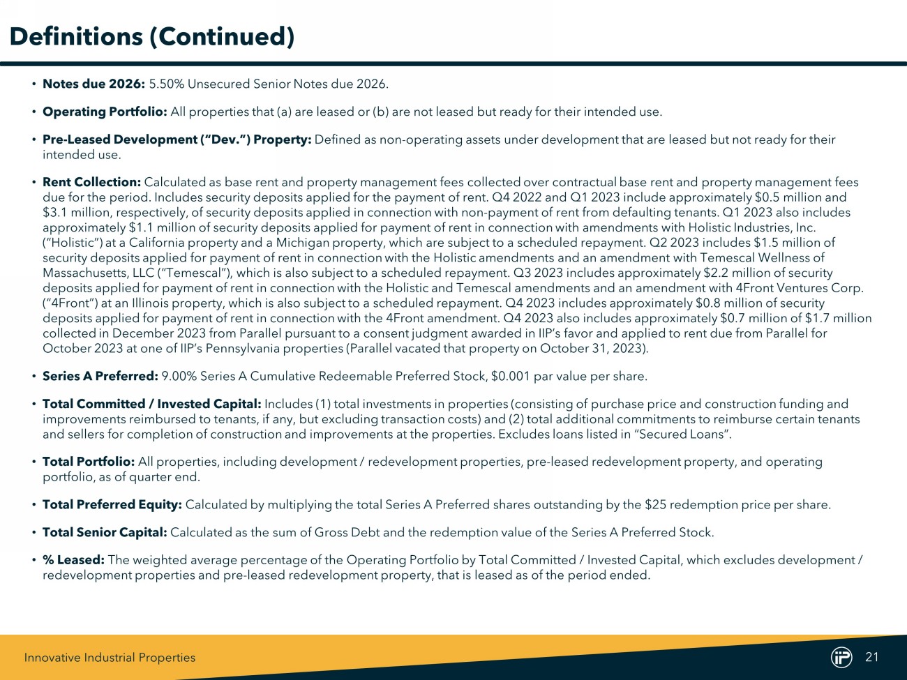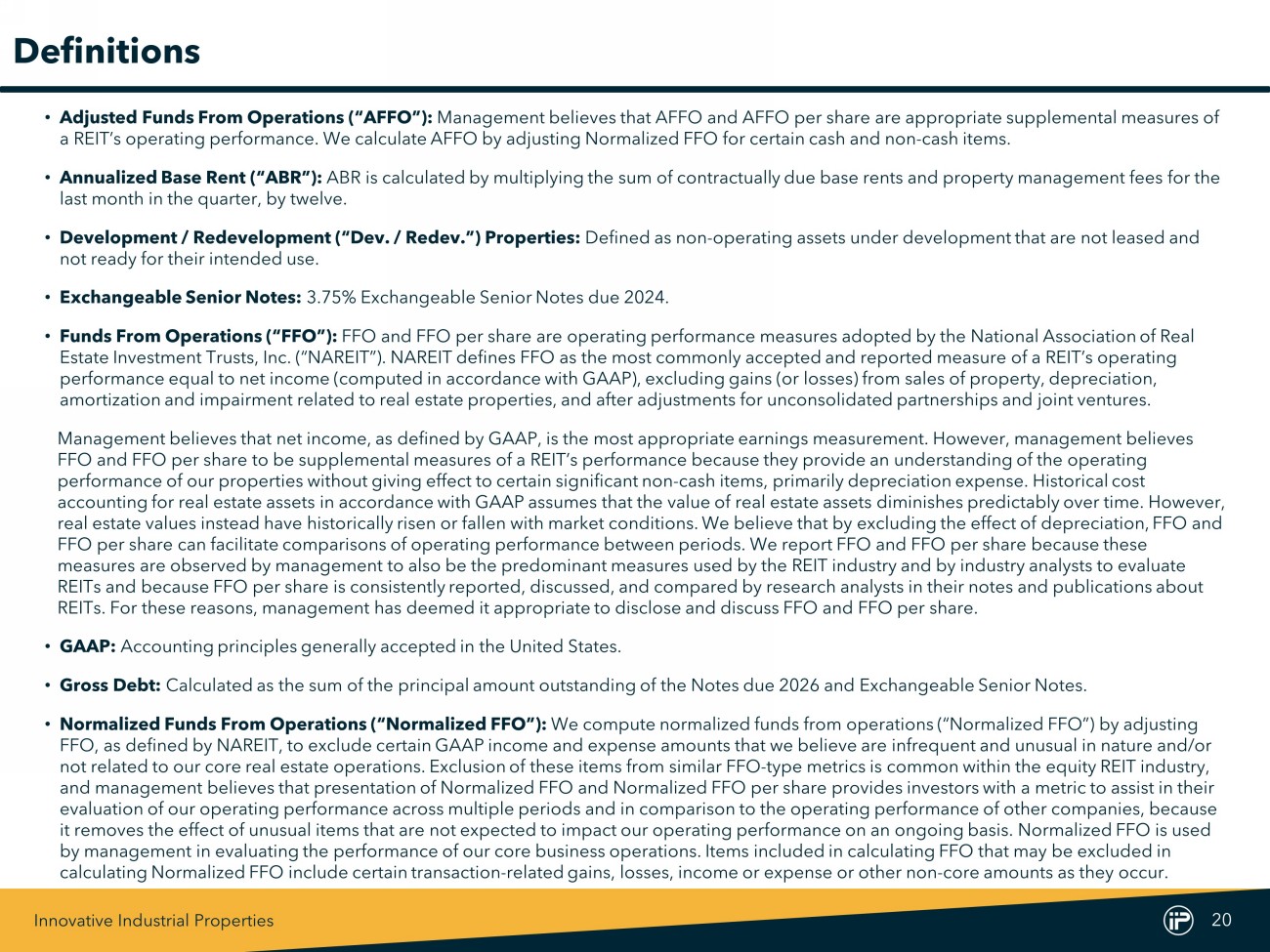 Innovative Industrial Properties 20 Definitions • Adjusted Funds From Operations (“AFFO”): Management believes that AFFO and AFFO per share are appropriate supplemental measures of a REIT’s operating performance. We calculate AFFO by adjusting Normalized FFO for certain cash and non - cash items. • Annualized Base Rent (“ABR”): ABR is calculated by multiplying the sum of contractually due base rents and property management fees for the last month in the quarter, by twelve. • Development / Redevelopment (“Dev. / Redev.”) Properties: Defined as non - operating assets under development that are not leased and not ready for their intended use. • Exchangeable Senior Notes: 3.75% E xchangeable Senior Notes due 2024. • Funds From Operations (“FFO”): FFO and FFO per share are operating performance measures adopted by the National Association of Real Estate Investment Trusts, Inc. (“NAREIT”). NAREIT defines FFO as the most commonly accepted and reported measure of a REIT’s ope rating performance equal to net income (computed in accordance with GAAP), excluding gains (or losses) from sales of property, depre cia tion, amortization and impairment related to real estate properties, and after adjustments for unconsolidated partnerships and join t v entures. Management believes that net income, as defined by GAAP, is the most appropriate earnings measurement. However, management be lie ves FFO and FFO per share to be supplemental measures of a REIT’s performance because they provide an understanding of the operat ing performance of our properties without giving effect to certain significant non - cash items, primarily depreciation expense. Histo rical cost accounting for real estate assets in accordance with GAAP assumes that the value of real estate assets diminishes predictably ov er time. However, real estate values instead have historically risen or fallen with market conditions. We believe that by excluding the effect of depreciation, FFO and FFO per share can facilitate comparisons of operating performance between periods. We report FFO and FFO per share because th ese measures are observed by management to also be the predominant measures used by the REIT industry and by industry analysts to ev aluate REITs and because FFO per share is consistently reported, discussed, and compared by research analysts in their notes and pub lic ations about REITs. For these reasons, management has deemed it appropriate to disclose and discuss FFO and FFO per share. • GAAP: Accounting principles generally accepted in the United States. • Gross Debt: Calculated as the sum of the principal amount outstanding of the Notes due 2026 and Exchangeable Senior Notes. • Normalized Funds From Operations (“Normalized FFO”): We compute normalized funds from operations (“Normalized FFO”) by adjusting FFO, as defined by NAREIT, to exclude certain GAAP income and expense amounts that we believe are infrequent and unusual in n atu re and/or not related to our core real estate operations. Exclusion of these items from similar FFO - type metrics is common within the equi ty REIT industry, and management believes that presentation of Normalized FFO and Normalized FFO per share provides investors with a metric to ass ist in their evaluation of our operating performance across multiple periods and in comparison to the operating performance of other compa nie s, because it removes the effect of unusual items that are not expected to impact our operating performance on an ongoing basis. Normali zed FFO is used by management in evaluating the performance of our core business operations. Items included in calculating FFO that may be ex clu ded in calculating Normalized FFO include certain transaction - related gains, losses, income or expense or other non - core amounts as the y occur.