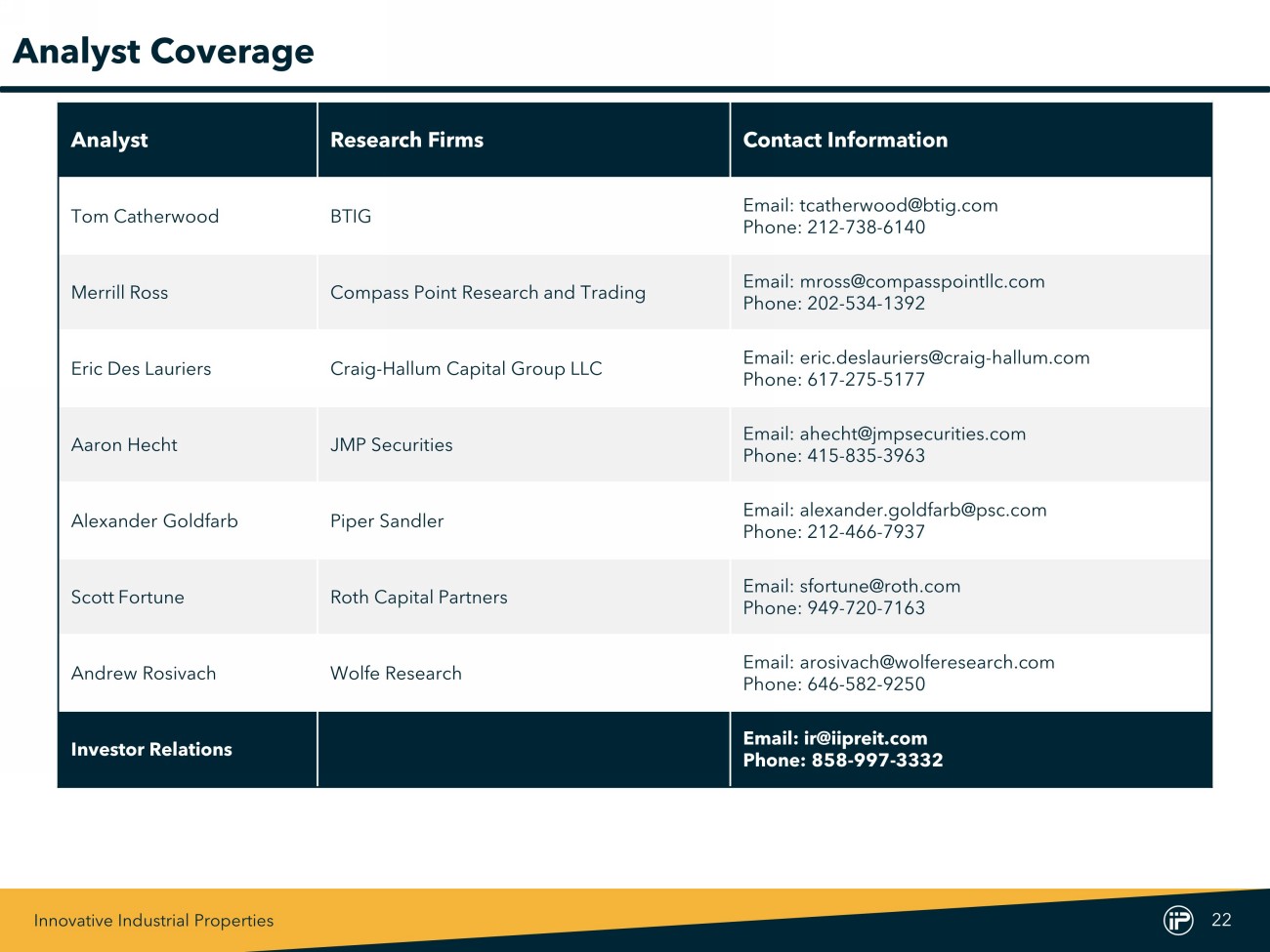 Innovative Industrial Properties 22 Analyst Coverage Analyst Research Firms Contact Information Tom Catherwood BTIG Email: tcatherwood@btig.com Phone: 212 - 738 - 6140 Merrill Ross Compass Point Research and Trading Email: mross@compasspointllc.com Phone: 202 - 534 - 1392 Eric Des Lauriers Craig - Hallum Capital Group LLC Email: eric.deslauriers@craig - hallum.com Phone: 617 - 275 - 5177 Aaron Hecht JMP Securities Email: ahecht@jmpsecurities.com Phone: 415 - 835 - 3963 Alexander Goldfarb Piper Sandler Email: alexander.goldfarb@psc.com Phone: 212 - 466 - 7937 Scott Fortune Roth Capital Partners Email: sfortune@roth.com Phone: 949 - 720 - 7163 Andrew Rosivach Wolfe Research Email: arosivach@wolferesearch.com Phone: 646 - 582 - 9250 Investor Relations Email: ir@iipreit.com Phone: 858 - 997 - 3332