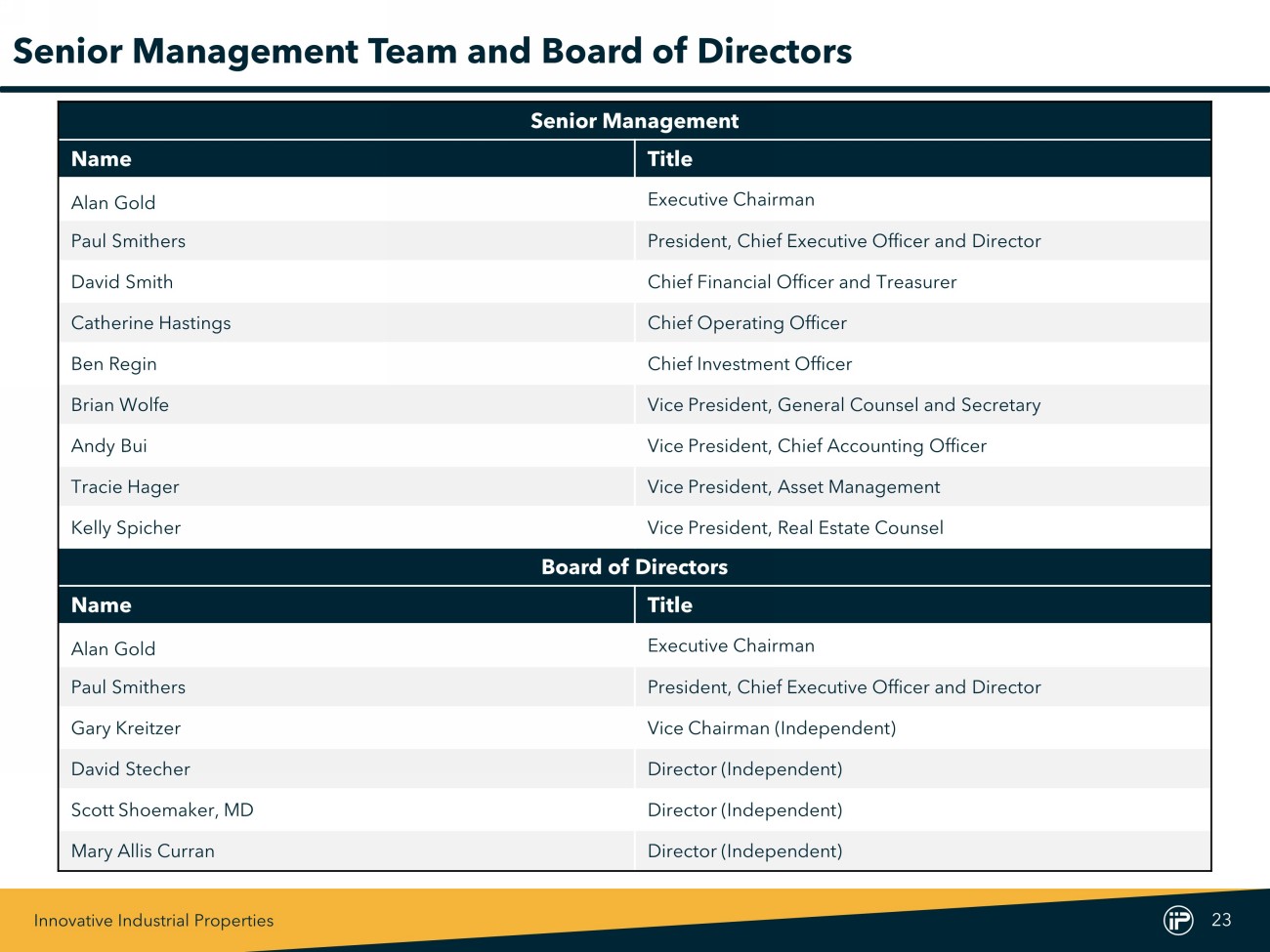 Innovative Industrial Properties 23 Senior Management Team and Board of Directors Senior Management Name Title Alan Gold Executive Chairman Paul Smithers President, Chief Executive Officer and Director David Smith Chief Financial Officer and Treasurer Catherine Hastings Chief Operating Officer Ben Regin Chief Investment Officer Brian Wolfe Vice President, General Counsel and Secretary Andy Bui Vice President, Chief Accounting Officer Tracie Hager Vice President, Asset Management Kelly Spicher Vice President, Real Estate Counsel Board of Directors Name Title Alan Gold Executive Chairman Paul Smithers President, Chief Executive Officer and Director Gary Kreitzer Vice Chairman (Independent) David Stecher Director (Independent) Scott Shoemaker, MD Director (Independent) Mary Allis Curran Director (Independent)