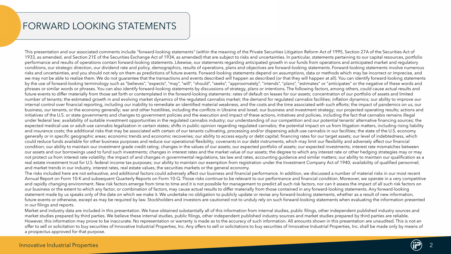 Innovative Industrial Properties 2 This presentation and our associated comments include "forward - looking statements" (within the meaning of the Private Securities Litigation Reform Act of 1995, Section 27A of the Securities Act of 1933, as amended, and Section 21E of the Securities Exchange Act of 1934, as amended) that are subject to risks and uncertain tie s. In particular, statements pertaining to our capital resources, portfolio performance and results of operations contain forward - looking statements. Likewise, our statements regarding anticipated growth in our funds from operations and anticipated market and regulatory conditions, our strategic direction, our dividend rate and policy, demographics, results of operations, plans and objectives are forward - looking statements. Forward - looking statements involve numerous risks and uncertainties, and you should not rely on them as predictions of future events. Forward - looking statements depend on a ssumptions, data or methods which may be incorrect or imprecise, and we may not be able to realize them. We do not guarantee that the transactions and events described will happen as described ( or that they will happen at all). You can identify forward - looking statements by the use of forward - looking terminology such as "believes“, "expects“, "may“, "will“, "should“, "seeks“, "approximately“, "int ends“, "plans“, "estimates" or "anticipates" or the negative of these words and phrases or similar words or phrases. You can also identify forward - looking statements by discussions of strategy, plans or inten tions. The following factors, among others, could cause actual results and future events to differ materially from those set forth or contemplated in the forward - looking statements: rates of default on l eases for our assets; concentration of our portfolio of assets and limited number of tenants; the estimated growth in and evolving market dynamics of the regulated cannabis market; the demand for regu lat ed cannabis facilities; inflation dynamics; our ability to improve our internal control over financial reporting, including our inability to remediate an identified material weakness, and the cost s a nd the time associated with such efforts; the impact of pandemics on us, our business, our tenants, or the economy generally; war and other hostilities, including the conflicts in Ukraine and Israel; ou r b usiness and investment strategy; our projected operating results; actions and initiatives of the U.S. or state governments and changes to government policies and the execution and impact of these actions , i nitiatives and policies, including the fact that cannabis remains illegal under federal law; availability of suitable investment opportunities in the regulated cannabis industry; our understanding of ou r competition and our potential tenants’ alternative financing sources; the expected medical - use or adult - use cannabis legalization in certain states; shifts in public opinion regarding regulated cannabis ; the potential impact on us from litigation matters, including rising liability and insurance costs; the additional risks that may be associated with certain of our tenants cultivating, processing and/or d isp ensing adult - use cannabis in our facilities; the state of the U.S. economy generally or in specific geographic areas; economic trends and economic recoveries; our ability to access equity or debt capi tal ; financing rates for our target assets; our level of indebtedness, which could reduce funds available for other business purposes and reduce our operational flexibility; covenants in our debt instru men ts, which may limit our flexibility and adversely affect our financial condition; our ability to maintain our investment grade credit rating; changes in the values of our assets; our expected port fol io of assets; our expected investments; interest rate mismatches between our assets and our borrowings used to fund such investments; changes in interest rates and the market value of our assets; th e d egree to which any interest rate or other hedging strategies may or may not protect us from interest rate volatility; the impact of and changes in governmental regulations, tax law and rates, accou nti ng guidance and similar matters; our ability to maintain our qualification as a real estate investment trust for U.S. federal income tax purposes; our ability to maintain our exemption from registration un der the Investment Company Act of 1940; availability of qualified personnel; and market trends in our industry, interest rates, real estate values, the securities markets or the general economy. The risks included here are not exhaustive, and additional factors could adversely affect our business and financial performa nce . In addition, we discussed a number of material risks in our most recent Annual Report on Form 10 - K and subsequent Quarterly Reports on Form 10 - Q. Those risks continue to be relevant to our performance and financial condition. Moreover, we operate in a very competitive and rapidly changing environment. New risk factors emerge from time to time and it is not possible for management to predict all such risk factors, nor can it assess the impact of all such risk factors on our business or the extent to which any factor, or combination of factors, may cause actual results to differ materially from th ose contained in any forward - looking statements. Any forward - looking statement made by us speaks only of the date on which we make it. We undertake no obligation to publicly update or revise any fo rward - looking statements, whether as a result of new information, future events or otherwise, except as may be required by law. Stockholders and investors are cautioned not to unduly rely on suc h forward - looking statements when evaluating the information presented in our filings and reports. Market and industry data are included in this presentation. We have obtained substa