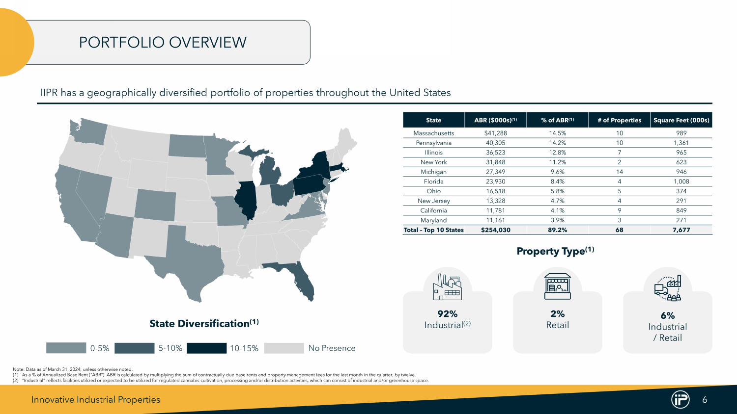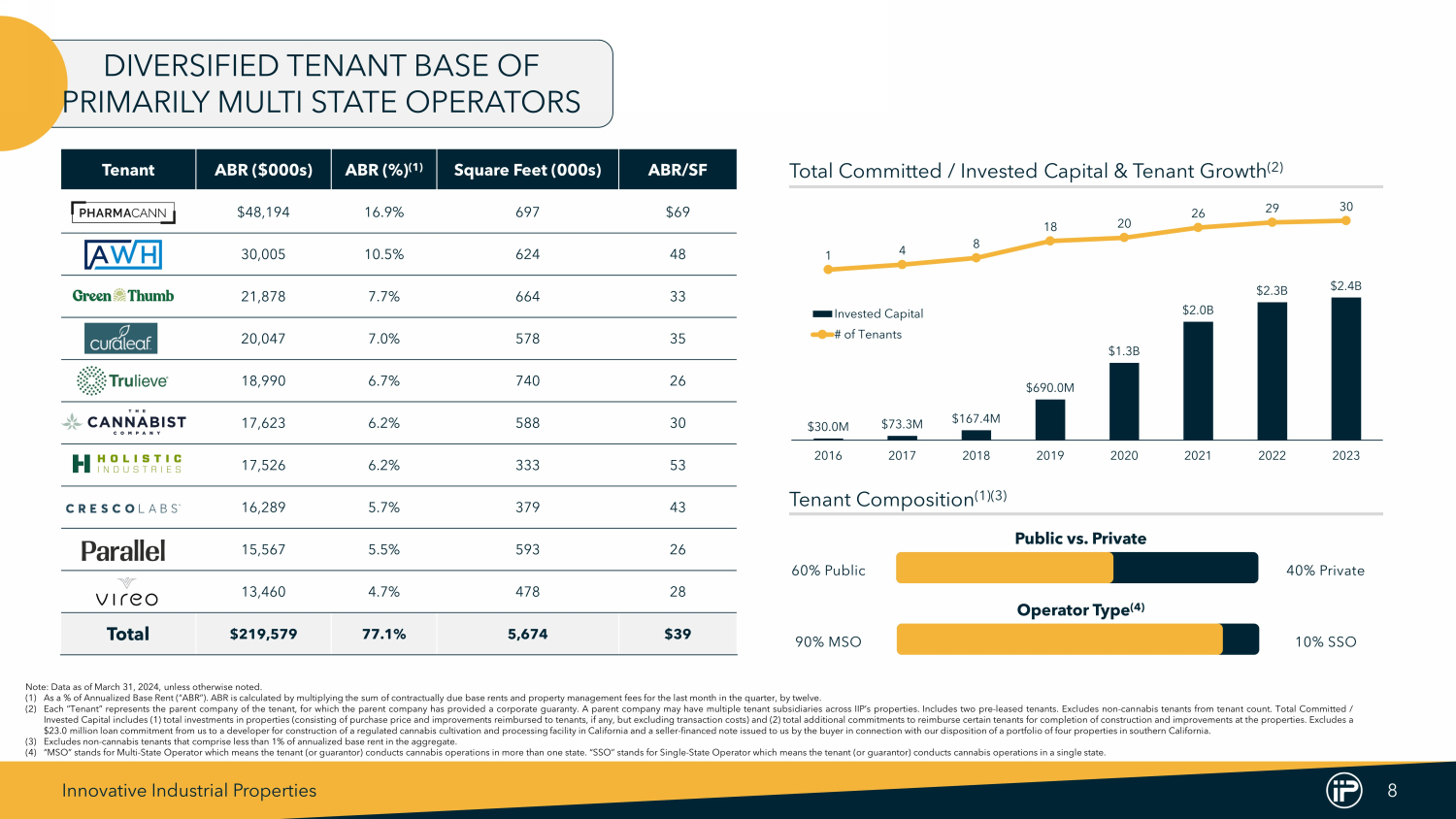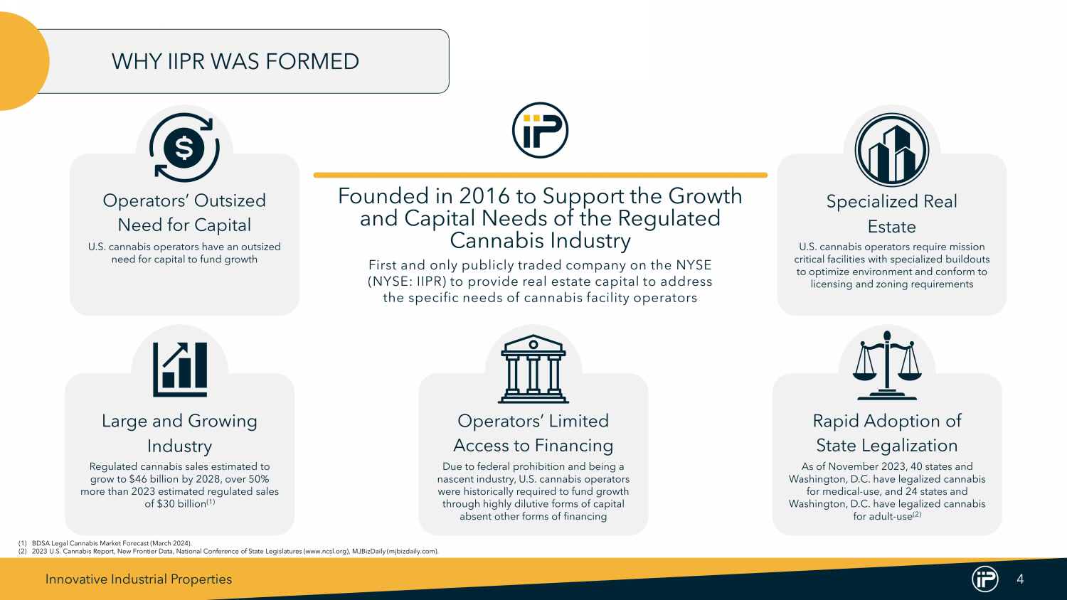 Innovative Industrial Properties 3 NNN cannabis REIT • Large diversified portfolio of over $2.4B of cannabis real estate • Diversified across 19 states and 30 tenants (4) • Contractual, annual escalations provide built in cash flow growth History of providing value to shareholders • Consistent dividend and AFFO per share performance • One of the lowest leveraged publicly traded REITs • Demonstrated access to multiple capital markets IIPR provides direct investment exposure to cannabis with the stability of real estate • The only NYSE - listed cannabis REIT • High growth industry with an estimated 9% CAGR over next 5 years (5) • Diversified exposure to numerous cannabis markets and tenants Seasoned management team with significant REIT experience • Our founder, Alan Gold, has a history of establishing real estate companies • Senior management team with long term public REIT experience Note : Data as of March 31 , 2024 , unless otherwise noted . (1) Total Committed / Invested Capital includes ( 1 ) total investments in properties (consisting of purchase price and improvements reimbursed to tenants, if any, but excluding transaction costs) and ( 2 ) total additional commitments to reimburse certain tenants for completion of construction and improvements at the properties . Excludes a $ 23 . 0 million loan commitment from us to a developer for construction of a regulated cannabis cultivation and processing facility in California and a seller - financed note issued to us by the buyer in connection with our disposition of a portfolio of four properties in southern California . (2) Reflects annualized common stock dividend paid on April 15 , 2024 of $ 1 . 82 per share . The decision to declare or pay dividends is in the sole discretion of our board of directors in light of conditions then existing, and there can be no assurance that a dividend will be declared or paid for any time period in any amount . (3) Weighted average lease length calculated by weighting the remaining lease term based on the base rent and management fees, after the expiration of applicable base rent phase - in periods for the Operating Portfolio . (4) Each “Tenant” represents the parent company of the tenant, for which the parent company has provided a corporate guaranty . A parent company may have multiple tenant subsidiaries across IIPR’s properties . Includes two pre - leased tenants . Excludes non - cannabis tenants . (5) BDSA Legal Cannabis Market Forecast (March 2024 ) . IIPR AT A GLANCE $2. 4 B Total Committed / Invested Capital (1) 108 Properties 8.9M Rentable Square Feet 19 U.S. States $7.28 Q1 2024 Annualized Dividend (2) $75.5M Q1 2024 Total Revenue 14.8 Years Weighted Average Lease Length (3) COMPANY VALUE SPOTLIGHT