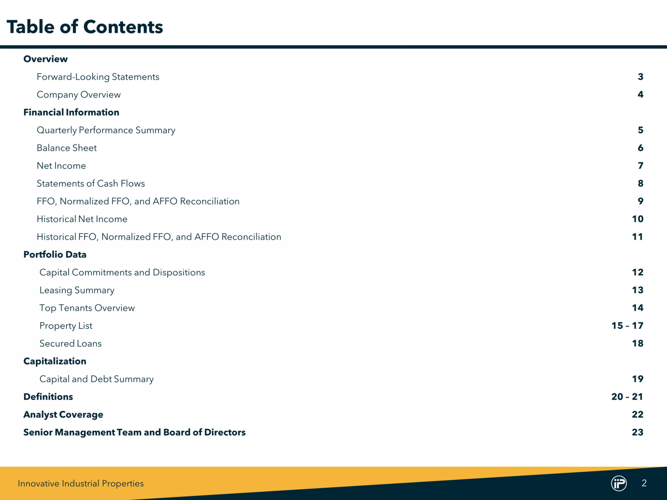 Innovative Industrial Properties 2 Overview Forward - Looking Statements 3 Company Overview 4 Financial Information Quarterly Performance Summary 5 Balance Sheet 6 Net Income 7 Statements of Cash Flows 8 FFO, Normalized FFO, and AFFO Reconciliation 9 Historical Net Income 10 Historical FFO, Normalized FFO, and AFFO Reconciliation 11 Portfolio Data Capital Commitments and Dispositions 12 Leasing Summary 13 Top Tenants Overview 14 Property List 15 – 17 Secured Loans 18 Capitalization Capital and Debt Summary 19 Definitions 20 – 21 Analyst Coverage 22 Senior Management Team and Board of Directors 23 Table of Contents