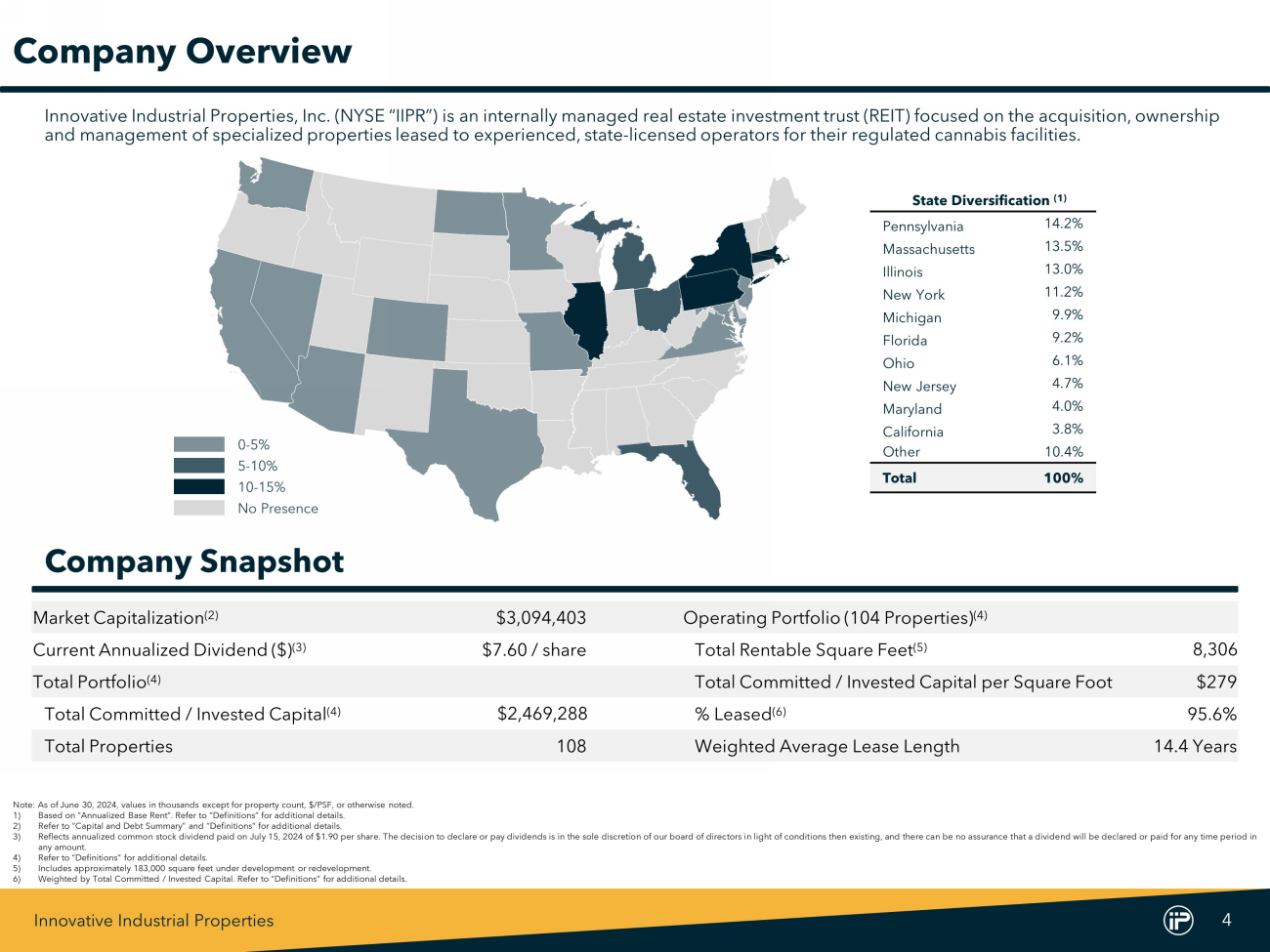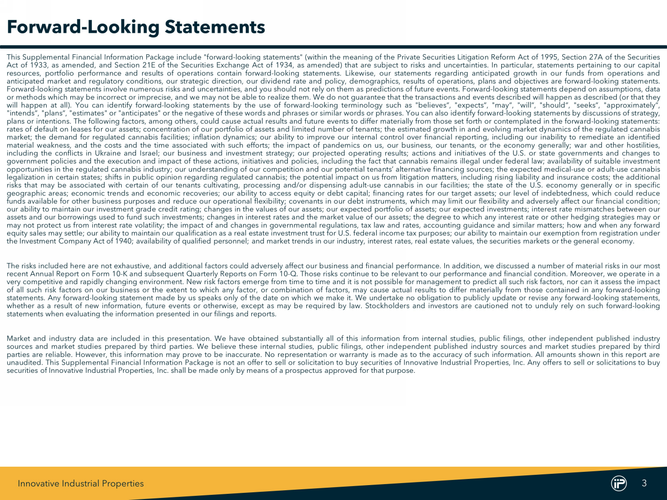 Innovative Industrial Properties 3 Forward - Looking Statements This Supplemental Financial Information Package include "forward - looking statements" (within the meaning of the Private Securities Litigation Reform Act of 1995 , Section 27 A of the Securities Act of 1933 , as amended, and Section 21 E of the Securities Exchange Act of 1934 , as amended) that are subject to risks and uncertainties . In particular, statements pertaining to our capital resources, portfolio performance and results of operations contain forward - looking statements . Likewise, our statements regarding anticipated growth in our funds from operations and anticipated market and regulatory conditions, our strategic direction, our dividend rate and policy, demographics, results of operations, plans and objectives are forward - looking statements . Forward - looking statements involve numerous risks and uncertainties, and you should not rely on them as predictions of future events . Forward - looking statements depend on assumptions, data or methods which may be incorrect or imprecise, and we may not be able to realize them . We do not guarantee that the transactions and events described will happen as described (or that they will happen at all) . You can identify forward - looking statements by the use of forward - looking terminology such as "believes“, "expects“, "may“, "will“, "should“, "seeks“, "approximately“, "intends“, "plans“, "estimates" or "anticipates" or the negative of these words and phrases or similar words or phrases . You can also identify forward - looking statements by discussions of strategy, plans or intentions . The following factors, among others, could cause actual results and future events to differ materially from those set forth or contemplated in the forward - looking statements : rates of default on leases for our assets ; concentration of our portfolio of assets and limited number of tenants ; the estimated growth in and evolving market dynamics of the regulated cannabis market ; the demand for regulated cannabis facilities ; inflation dynamics ; our ability to improve our internal control over financial reporting, including our inability to remediate an identified material weakness, and the costs and the time associated with such efforts ; the impact of pandemics on us, our business, our tenants, or the economy generally ; war and other hostilities, including the conflicts in Ukraine and Israel ; our business and investment strategy ; our projected operating results ; actions and initiatives of the U . S . or state governments and changes to government policies and the execution and impact of these actions, initiatives and policies, including the fact that cannabis remains illegal under federal law ; availability of suitable investment opportunities in the regulated cannabis industry ; our understanding of our competition and our potential tenants’ alternative financing sources ; the expected medical - use or adult - use cannabis legalization in certain states ; shifts in public opinion regarding regulated cannabis ; the potential impact on us from litigation matters, including rising liability and insurance costs ; the additional risks that may be associated with certain of our tenants cultivating, processing and/or dispensing adult - use cannabis in our facilities ; the state of the U . S . economy generally or in specific geographic areas ; economic trends and economic recoveries ; our ability to access equity or debt capital ; financing rates for our target assets ; our level of indebtedness, which could reduce funds available for other business purposes and reduce our operational flexibility ; covenants in our debt instruments, which may limit our flexibility and adversely affect our financial condition ; our ability to maintain our investment grade credit rating ; changes in the values of our assets ; our expected portfolio of assets ; our expected investments ; interest rate mismatches between our assets and our borrowings used to fund such investments ; changes in interest rates and the market value of our assets ; the degree to which any interest rate or other hedging strategies may or may not protect us from interest rate volatility ; the impact of and changes in governmental regulations, tax law and rates, accounting guidance and similar matters ; how and when any forward equity sales may settle ; our ability to maintain our qualification as a real estate investment trust for U . S . federal income tax purposes ; our ability to maintain our exemption from registration under the Investment Company Act of 1940 ; availability of qualified personnel ; and market trends in our industry, interest rates, real estate values, the securities markets or the general economy . The risks included here are not exhaustive, and additional factors could adversely affect our business and financial performance . In addition, we discussed a number of material risks in our most recent Annual Report on Form 10 - K and subsequent Quarterly Reports on Form 10 - Q . Those risks continue to be relevant to our performance and financial condition . Moreover, we operate in a very competitive and rapidly changing environment . New risk factors emerge from time to time and it is not possible for management to predict all such risk factors, nor can it assess the impact of all such risk factors on our business or the extent to which any factor, or combination of factors, may cause actual results to differ materially from those contained in any forward - looking statements . Any forward - looking statement made by us speaks only of the date on which we make it . We undertake no obligation to publicly update or revise any forward - looking statements, whether as a result of new information, future events or otherwise, except as may be required by law . Stockholders and investors are cautioned not to unduly rely on such forward - looking statements when evaluating the information presented