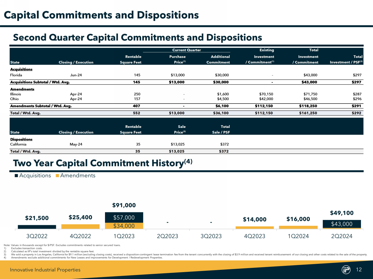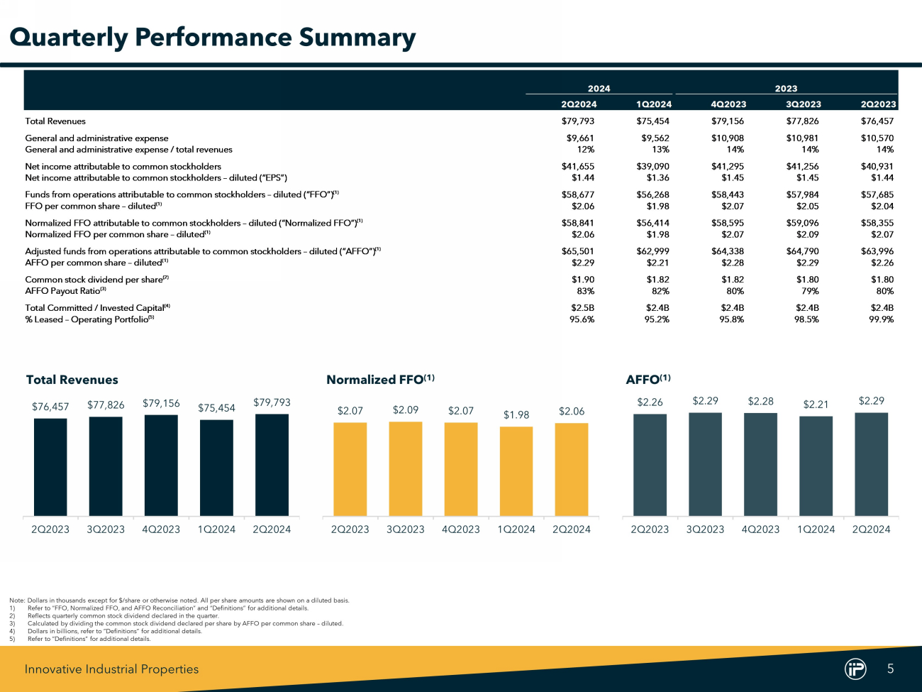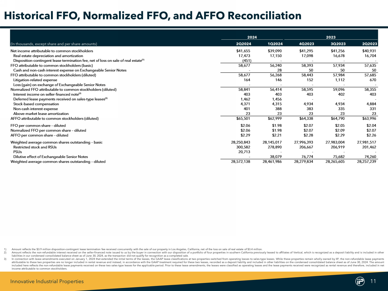 Innovative Industrial Properties 11 2024 2023 (In thousands, except share and per share amounts) 2Q2024 1Q2024 4Q2023 3Q2023 2Q2023 Net income attributable to common stockholders $41,655 $39,090 $41,295 $41,256 $40,931 Real estate depreciation and amortization 17,473 17,150 17,098 16,678 16,704 Disposition-contingent lease termination fee, net of loss on sale of real estate (1) (451) - - - - FFO attributable to common stockholders (basic) 58,677 56,240 58,393 57,934 57,635 Cash and non-cash interest expense on Exchangeable Senior Notes - 28 50 50 50 FFO attributable to common stockholders (diluted) 58,677 56,268 58,443 57,984 57,685 Litigation-related expense 164 146 152 1,112 670 Loss (gain) on exchange of Exchangeable Senior Notes - - - - - Normalized FFO attributable to common stockholders (diluted) 58,841 56,414 58,595 59,096 58,355 Interest income on seller-financed note (2) 403 403 403 402 403 Deferred lease payments received on sales-type leases (3) 1,462 1,456 - - - Stock-based compensation 4,371 4,315 4,934 4,934 4,884 Non-cash interest expense 401 388 383 335 331 Above-market lease amortization 23 23 23 23 23 AFFO attributable to common stockholders (diluted) $65,501 $62,999 $64,338 $64,790 $63,996 FFO per common share – diluted $2.06 $1.98 $2.07 $2.05 $2.04 Normalized FFO per common share – diluted $2.06 $1.98 $2.07 $2.09 $2.07 AFFO per common share – diluted $2.29 $2.21 $2.28 $2.29 $2.26 Weighted average common shares outstanding – basic 28,250,843 28,145,017 27,996,393 27,983,004 27,981,517 Restricted stock and RSUs 300,582 278,890 206,667 206,919 201,462 PSUs 20,713 - - - - Dilutive effect of Exchangeable Senior Notes - 38,079 76,774 75,682 74,260 Weighted average common shares outstanding – diluted 28,572,138 28,461,986 28,279,834 28,265,605 28,257,239 Historical FFO, Normalized FFO, and AFFO Reconciliation 1) Amount reflects the $ 3 . 9 million disposition - contingent lease termination fee received concurrently with the sale of our property in Los Angeles, California, net of the loss on sale of real estate of $ 3 . 4 million . 2) Amount reflects the non - refundable interest received on the seller - financed note issued to us by the buyer in connection with our disposition of a portfolio of four properties in southern California previously leased to affiliates of Vertical, which is recognized as a deposit liability and is included in other liabilities in our condensed consolidated balance sheet as of June 30 , 2024 , as the transaction did not qualify for recognition as a completed sale . 3) In connection with lease amendments executed on January 1 , 2024 that extended the initial terms of the leases, the GAAP lease classifications at two properties switched from operating leases to sales - type leases . While these properties remain wholly owned by IIP, the non - refundable lease payments attributable to these two properties are no longer included in rental revenue and instead, in accordance with the GAAP treatment required for these two leases, recorded as a deposit liability and included in other liabilities on the condensed consolidated balance sheet as of June 30 , 2024 . The amount included here reflects the non - refundable lease payments received on these two sales - type leases for the applicable period . Prior to these lease amendments, the leases were classified as operating leases and the lease payments received were recognized as rental revenue and therefore, included in net income attributable to common stockholders .