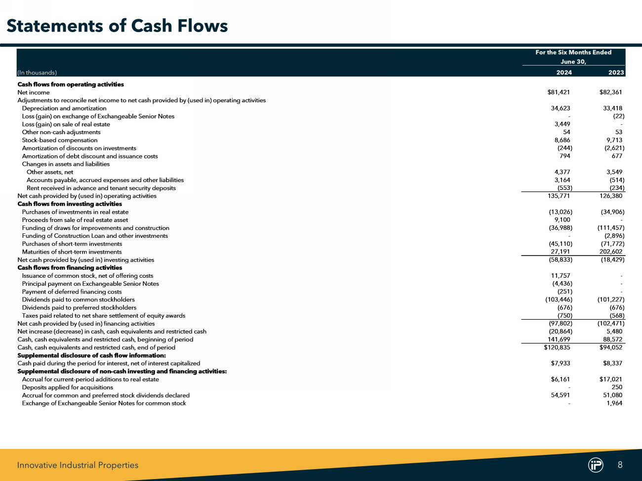 Innovative Industrial Properties 8 For the Six Months Ended June 30, (In thousands) 2024 2023 Cash flows from operating activities Net income $81,421 $82,361 Adjustments to reconcile net income to net cash provided by (used in) operating activities Depreciation and amortization 34,623 33,418 Loss (gain) on exchange of Exchangeable Senior Notes - (22) Loss (gain) on sale of real estate 3,449 - Other non-cash adjustments 54 53 Stock-based compensation 8,686 9,713 Amortization of discounts on investments (244) (2,621) Amortization of debt discount and issuance costs 794 677 Changes in assets and liabilities Other assets, net 4,377 3,549 Accounts payable, accrued expenses and other liabilities 3,164 (514) Rent received in advance and tenant security deposits (553) (234) Net cash provided by (used in) operating activities 135,771 126,380 Cash flows from investing activities Purchases of investments in real estate (13,026) (34,906) Proceeds from sale of real estate asset 9,100 - Funding of draws for improvements and construction (36,988) (111,457) Funding of Construction Loan and other investments - (2,896) Purchases of short-term investments (45,110) (71,772) Maturities of short-term investments 27,191 202,602 Net cash provided by (used in) investing activities (58,833) (18,429) Cash flows from financing activities Issuance of common stock, net of offering costs 11,757 - Principal payment on Exchangeable Senior Notes (4,436) - Payment of deferred financing costs (251) - Dividends paid to common stockholders (103,446) (101,227) Dividends paid to preferred stockholders (676) (676) Taxes paid related to net share settlement of equity awards (750) (568) Net cash provided by (used in) financing activities (97,802) (102,471) Net increase (decrease) in cash, cash equivalents and restricted cash (20,864) 5,480 Cash, cash equivalents and restricted cash, beginning of period 141,699 88,572 Cash, cash equivalents and restricted cash, end of period $120,835 $94,052 Supplemental disclosure of cash flow information: Cash paid during the period for interest, net of interest capitalized $7,933 $8,337 Supplemental disclosure of non-cash investing and financing activities: Accrual for current-period additions to real estate $6,161 $17,021 Deposits applied for acquisitions - 250 Accrual for common and preferred stock dividends declared 54,591 51,080 Exchange of Exchangeable Senior Notes for common stock - 1,964 Statements of Cash Flows