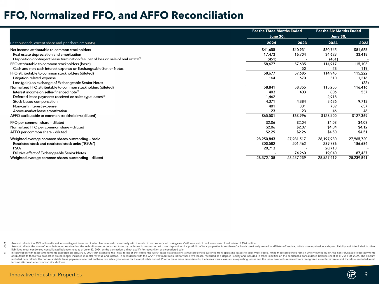 Innovative Industrial Properties 9 For the Three Months Ended For the Six Months Ended June 30, June 30, (In thousands, except share and per share amounts) 2024 2023 2024 2023 Net income attributable to common stockholders $41,655 $40,931 $80,745 $81,685 Real estate depreciation and amortization 17,473 16,704 34,623 33,418 Disposition-contingent lease termination fee, net of loss on sale of real estate (1) (451) - (451) - FFO attributable to common stockholders (basic) 58,677 57,635 114,917 115,103 Cash and non-cash interest expense on Exchangeable Senior Notes - 50 28 119 FFO attributable to common stockholders (diluted) 58,677 57,685 114,945 115,222 Litigation-related expense 164 670 310 1,216 Loss (gain) on exchange of Exchangeable Senior Notes - - - (22) Normalized FFO attributable to common stockholders (diluted) 58,841 58,355 115,255 116,416 Interest income on seller-financed note (2) 403 403 806 537 Deferred lease payments received on sales-type leases (3) 1,462 - 2,918 - Stock-based compensation 4,371 4,884 8,686 9,713 Non-cash interest expense 401 331 789 657 Above-market lease amortization 23 23 46 46 AFFO attributable to common stockholders (diluted) $65,501 $63,996 $128,500 $127,369 FFO per common share – diluted $2.06 $2.04 $4.03 $4.08 Normalized FFO per common share – diluted $2.06 $2.07 $4.04 $4.12 AFFO per common share – diluted $2.29 $2.26 $4.50 $4.51 Weighted average common shares outstanding – basic 28,250,843 27,981,517 28,197,930 27,965,720 Restricted stock and restricted stock units ("RSUs") 300,582 201,462 289,736 186,684 PSUs 20,713 - 20,713 - Dilutive effect of Exchangeable Senior Notes - 74,260 19,040 87,437 Weighted average common shares outstanding – diluted 28,572,138 28,257,239 28,527,419 28,239,841 FFO, Normalized FFO, and AFFO Reconciliation 1) Amount reflects the $ 3 . 9 million disposition - contingent lease termination fee received concurrently with the sale of our property in Los Angeles, California, net of the loss on sale of real estate of $ 3 . 4 million . 2) Amount reflects the non - refundable interest received on the seller - financed note issued to us by the buyer in connection with our disposition of a portfolio of four properties in southern California previously leased to affiliates of Vertical, which is recognized as a deposit liability and is included in other liabilities in our condensed consolidated balance sheet as of June 30 , 2024 , as the transaction did not qualify for recognition as a completed sale . 3) In connection with lease amendments executed on January 1 , 2024 that extended the initial terms of the leases, the GAAP lease classifications at two properties switched from operating leases to sales - type leases . While these properties remain wholly owned by IIP, the non - refundable lease payments attributable to these two properties are no longer included in rental revenue and instead, in accordance with the GAAP treatment required for these two leases, recorded as a deposit liability and included in other liabilities on the condensed consolidated balance sheet as of June 30 , 2024 . The amount included here reflects the non - refundable lease payments received on these two sales - type leases for the applicable period . Prior to these lease amendments, the leases were classified as operating leases and the lease payments received were recognized as rental revenue and therefore, included in net income attributable to common stockholders .