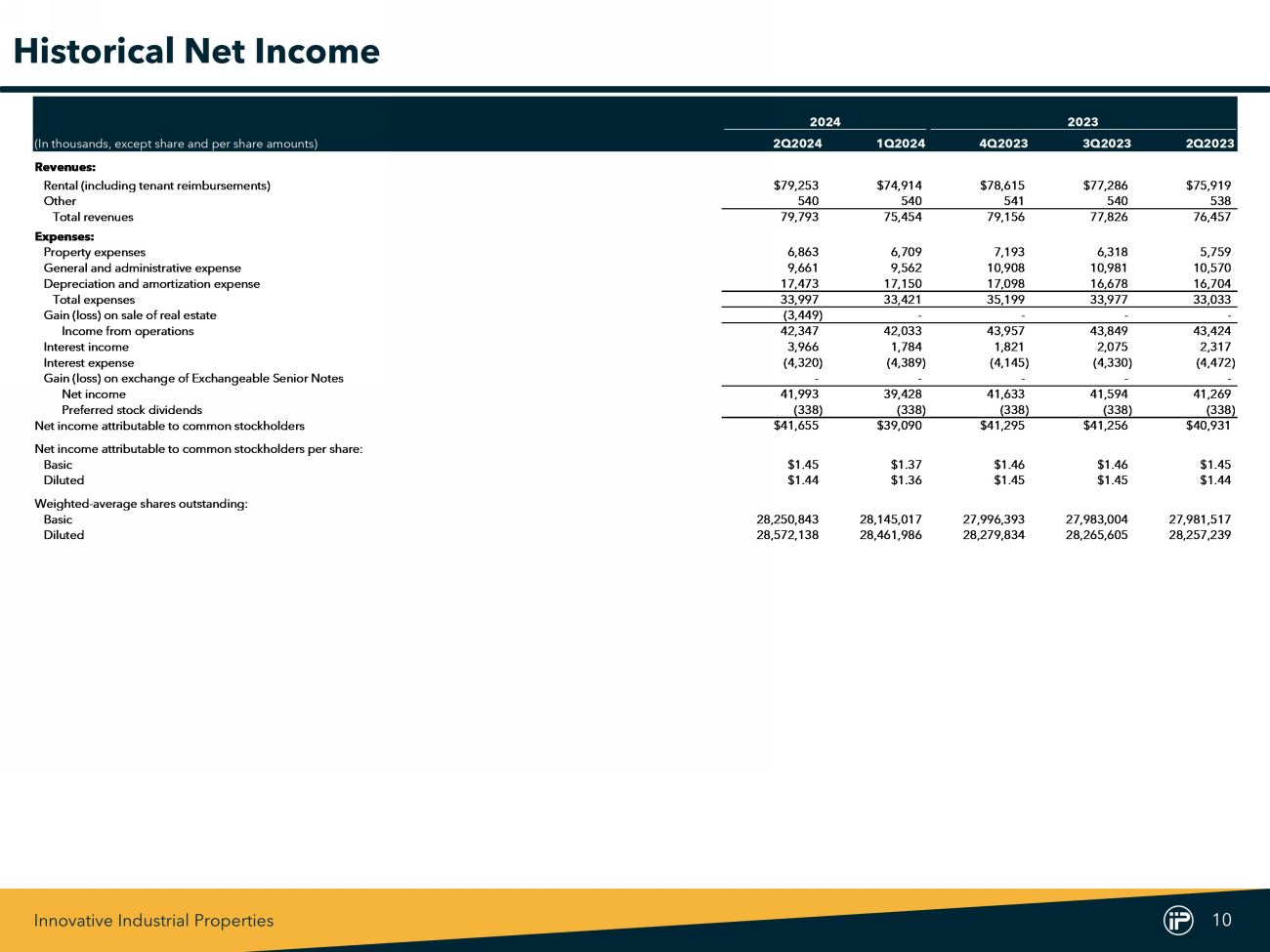 Innovative Industrial Properties 10 2024 2023 (In thousands, except share and per share amounts) 2Q2024 1Q2024 4Q2023 3Q2023 2Q2023 Revenues: Rental (including tenant reimbursements) $79,253 $74,914 $78,615 $77,286 $75,919 Other 540 540 541 540 538 Total revenues 79,793 75,454 79,156 77,826 76,457 Expenses: Property expenses 6,863 6,709 7,193 6,318 5,759 General and administrative expense 9,661 9,562 10,908 10,981 10,570 Depreciation and amortization expense 17,473 17,150 17,098 16,678 16,704 Total expenses 33,997 33,421 35,199 33,977 33,033 Gain (loss) on sale of real estate (3,449) - - - - Income from operations 42,347 42,033 43,957 43,849 43,424 Interest income 3,966 1,784 1,821 2,075 2,317 Interest expense (4,320) (4,389) (4,145) (4,330) (4,472) Gain (loss) on exchange of Exchangeable Senior Notes - - - - - Net income 41,993 39,428 41,633 41,594 41,269 Preferred stock dividends (338) (338) (338) (338) (338) Net income attributable to common stockholders $41,655 $39,090 $41,295 $41,256 $40,931 Net income attributable to common stockholders per share: Basic $1.45 $1.37 $1.46 $1.46 $1.45 Diluted $1.44 $1.36 $1.45 $1.45 $1.44 Weighted-average shares outstanding: Basic 28,250,843 28,145,017 27,996,393 27,983,004 27,981,517 Diluted 28,572,138 28,461,986 28,279,834 28,265,605 28,257,239 Historical Net Income