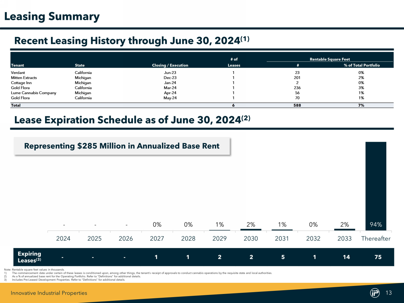 Innovative Industrial Properties 12 Current Quarter Existing Total Rentable Purchase Additional Investment Investment Total State Closing / Execution Square Feet Price (1) Commitment / Commitment (1) / Commitment Investment / PSF (2) Acquisitions Florida Jun-24 145 $13,000 $30,000 - $43,000 $297 Acquisitions Subtotal / Wtd. Avg. 145 $13,000 $30,000 - $43,000 $297 Amendments Illinois Apr-24 250 - $1,600 $70,150 $71,750 $287 Ohio Apr-24 157 - $4,500 $42,000 $46,500 $296 Amendments Subtotal / Wtd. Avg. 407 - $6,100 $112,150 $118,250 $291 Total / Wtd. Avg. 552 $13,000 $36,100 $112,150 $161,250 $292 Rentable Sale Total State Closing / Execution Square Feet Price (3) Sale / PSF Dispositions California May-24 35 $13,025 $372 Total / Wtd. Avg. 35 $13,025 $372 Capital Commitments and Dispositions Note : Values in thousands except for $ /PSF . Excludes commitments related to senior secured loans . 1) Excludes transaction costs . 2) Calculated as IIP’s total investment divided by the rentable square feet . 3) We sold a property in Los Angeles, California for $ 9 . 1 million (excluding closing costs), received a disposition - contingent lease termination fee from the tenant concurrently with the closing of $ 3 . 9 million and received tenant reimbursement of our closing and other costs related to the sale of the property . 4) Amendments exclude additional commitments for New Leases and improvements for Development / Redevelopment Properties . $34,000 $57,000 $43,000 $21,500 $25,400 $91,000 - - $14,000 $16,000 $49,100 3Q2022 4Q2022 1Q2023 2Q2023 3Q2023 4Q2023 1Q2024 2Q2024 Acquisitions Amendments Second Quarter Capital Commitments and Dispositions Two Year Capital Commitment History (4)