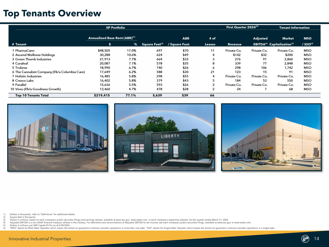 Innovative Industrial Properties 14 IIP Portfolio First Quarter 2024 (3) Tenant Information Annualized Base Rent (ABR) (1) ABR # of Adjusted Market MSO #Tenant $ % Square Feet (2) / Square Foot Leases Revenue EBITDA (4) Capitalization (5) / SSO (6) 1PharmaCann $48,505 17.0% 697 $70 11 Private Co. Private Co. Private Co. MSO 2Ascend Wellness Holdings 30,288 10.6% 624 $49 4 $142 $32 $200 MSO 3Green Thumb Industries 21,913 7.7% 664 $33 3 276 91 2,860 MSO 4Curaleaf 20,087 7.1% 578 $35 8 339 77 2,848 MSO 5Trulieve 18,990 6.7% 740 $26 6 298 106 1,742 MSO 6The Cannabist Company (f/k/a Columbia Care) 17,649 6.2% 588 $30 21 123 15 91 MSO 7Holistic Industries 16,485 5.8% 298 $55 4 Private Co. Private Co. Private Co. MSO 8Cresco Labs 16,402 5.8% 379 $43 5 184 53 550 MSO 9Parallel 15,636 5.5% 593 $26 2 Private Co. Private Co. Private Co. MSO 10Vireo (f/k/a Goodness Growth) 13,460 4.7% 478 $28 2 24 7 68 MSO Top 10 Tenants Total $219,415 77.1% 5,639 $39 66 Top Tenants Overview 1) Dollars in thousands, r efer to “Definitions” for additional details . 2) Square feet in thousands . 3) Dollars in millions, based on each company’s public securities filings and earnings release, available at www . sec . gov, www . sedar . com, or each company’s respective website, for the quarter ended March 31 , 2024 . 4) Adjusted EBITDA is a non - GAAP financial measure utilized in the industry . For definitions and reconciliations of Adjusted EBITDA to net income, see each company’s public securities filings, available at www . sec . gov or www . sedar . com . 5) Dollars in millions, per S&P Capital IQ Pro as of 6 / 30 / 2024 . 6) “MSO” stands for Multi - State Operator which means the tenant (or guarantor) conducts cannabis operations in more than one state . “SSO” stands for Single - State O perator which means the tenant (or guarantor) conducts cannabis operations in a single state .