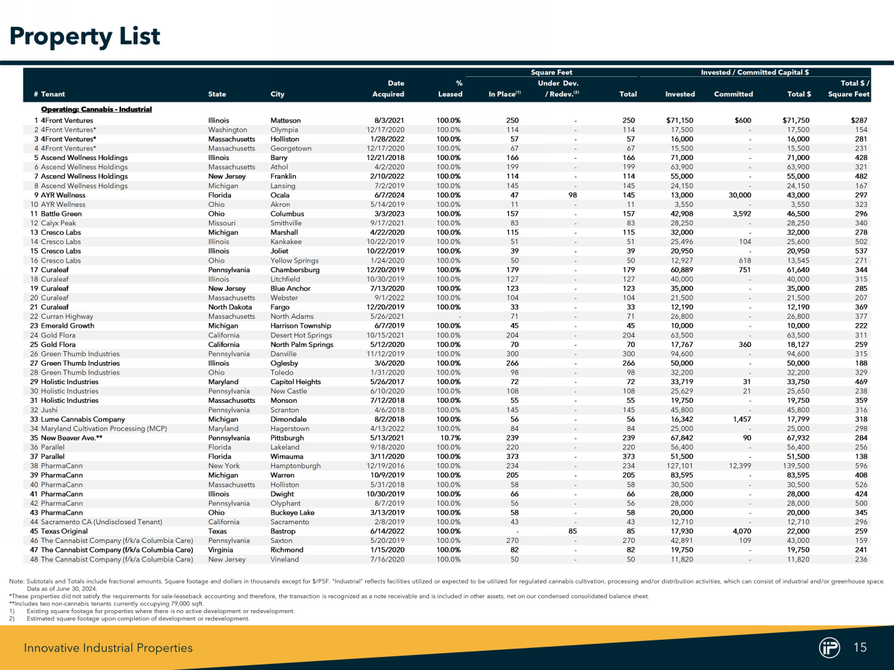 Innovative Industrial Properties 15 Square Feet Invested / Committed Capital $ Date % Under Dev. Total $ / #Tenant State City Acquired Leased In Place (1) / Redev. (2) Total Invested Committed Total $ Square Feet Operating: Cannabis - Industrial 14Front Ventures Illinois Matteson 8/3/2021 100.0% 250 - 250 $71,150 $600 $71,750 $287 24Front Ventures* Washington Olympia 12/17/2020 100.0% 114 - 114 17,500 - 17,500 154 34Front Ventures* Massachusetts Holliston 1/28/2022 100.0% 57 - 57 16,000 - 16,000 281 44Front Ventures* Massachusetts Georgetown 12/17/2020 100.0% 67 - 67 15,500 - 15,500 231 5Ascend Wellness Holdings Illinois Barry 12/21/2018 100.0% 166 - 166 71,000 - 71,000 428 6Ascend Wellness Holdings Massachusetts Athol 4/2/2020 100.0% 199 - 199 63,900 - 63,900 321 7Ascend Wellness Holdings New Jersey Franklin 2/10/2022 100.0% 114 - 114 55,000 - 55,000 482 8Ascend Wellness Holdings Michigan Lansing 7/2/2019 100.0% 145 - 145 24,150 - 24,150 167 9AYR Wellness Florida Ocala 6/7/2024 100.0% 47 98 145 13,000 30,000 43,000 297 10AYR Wellness Ohio Akron 5/14/2019 100.0% 11 - 11 3,550 - 3,550 323 11Battle Green Ohio Columbus 3/3/2023 100.0% 157 - 157 42,908 3,592 46,500 296 12Calyx Peak Missouri Smithville 9/17/2021 100.0% 83 - 83 28,250 - 28,250 340 13Cresco Labs Michigan Marshall 4/22/2020 100.0% 115 - 115 32,000 - 32,000 278 14Cresco Labs Illinois Kankakee 10/22/2019 100.0% 51 - 51 25,496 104 25,600 502 15Cresco Labs Illinois Joliet 10/22/2019 100.0% 39 - 39 20,950 - 20,950 537 16Cresco Labs Ohio Yellow Springs 1/24/2020 100.0% 50 - 50 12,927 618 13,545 271 17Curaleaf Pennsylvania Chambersburg 12/20/2019 100.0% 179 - 179 60,889 751 61,640 344 18Curaleaf Illinois Litchfield 10/30/2019 100.0% 127 - 127 40,000 - 40,000 315 19Curaleaf New Jersey Blue Anchor 7/13/2020 100.0% 123 - 123 35,000 - 35,000 285 20Curaleaf Massachusetts Webster 9/1/2022 100.0% 104 - 104 21,500 - 21,500 207 21Curaleaf North Dakota Fargo 12/20/2019 100.0% 33 - 33 12,190 - 12,190 369 22Curran Highway Massachusetts North Adams 5/26/2021 - 71 - 71 26,800 - 26,800 377 23Emerald Growth Michigan Harrison Township 6/7/2019 100.0% 45 - 45 10,000 - 10,000 222 24Gold Flora California Desert Hot Springs 10/15/2021 100.0% 204 - 204 63,500 - 63,500 311 25Gold Flora California North Palm Springs 5/12/2020 100.0% 70 - 70 17,767 360 18,127 259 26Green Thumb Industries Pennsylvania Danville 11/12/2019 100.0% 300 - 300 94,600 - 94,600 315 27Green Thumb Industries Illinois Oglesby 3/6/2020 100.0% 266 - 266 50,000 - 50,000 188 28Green Thumb Industries Ohio Toledo 1/31/2020 100.0% 98 - 98 32,200 - 32,200 329 29Holistic Industries Maryland Capitol Heights 5/26/2017 100.0% 72 - 72 33,719 31 33,750 469 30Holistic Industries Pennsylvania New Castle 6/10/2020 100.0% 108 - 108 25,629 21 25,650 238 31Holistic Industries Massachusetts Monson 7/12/2018 100.0% 55 - 55 19,750 - 19,750 359 32Jushi Pennsylvania Scranton 4/6/2018 100.0% 145 - 145 45,800 - 45,800 316 33Lume Cannabis Company Michigan Dimondale 8/2/2018 100.0% 56 - 56 16,342 1,457 17,799 318 34Maryland Cultivation Processing (MCP) Maryland Hagerstown 4/13/2022 100.0% 84 - 84 25,000 - 25,000 298 35New Beaver Ave.** Pennsylvania Pittsburgh 5/13/2021 10.7% 239 - 239 67,842 90 67,932 284 36Parallel Florida Lakeland 9/18/2020 100.0% 220 - 220 56,400 - 56,400 256 37Parallel Florida Wimauma 3/11/2020 100.0% 373 - 373 51,500 - 51,500 138 38PharmaCann New York Hamptonburgh 12/19/2016 100.0% 234 - 234 127,101 12,399 139,500 596 39PharmaCann Michigan Warren 10/9/2019 100.0% 205 - 205 83,595 - 83,595 408 40PharmaCann Massachusetts Holliston 5/31/2018 100.0% 58 - 58 30,500 - 30,500 526 41PharmaCann Illinois Dwight 10/30/2019 100.0% 66 - 66 28,000 - 28,000 424 42PharmaCann Pennsylvania Olyphant 8/7/2019 100.0% 56 - 56 28,000 - 28,000 500 43PharmaCann Ohio Buckeye Lake 3/13/2019 100.0% 58 - 58 20,000 - 20,000 345 44Sacramento CA (Undisclosed Tenant) California Sacramento 2/8/2019 100.0% 43 - 43 12,710 - 12,710 296 45Texas Original Texas Bastrop 6/14/2022 100.0% - 85 85 17,930 4,070 22,000 259 46The Cannabist Company (f/k/a Columbia Care) Pennsylvania Saxton 5/20/2019 100.0% 270 - 270 42,891 109 43,000 159 47The Cannabist Company (f/k/a Columbia Care) Virginia Richmond 1/15/2020 100.0% 82 - 82 19,750 - 19,750 241 48The Cannabist Company (f/k/a Columbia Care) New Jersey Vineland 7/16/2020 100.0% 50 - 50 11,820 - 11,820 236 Note : Subtotals and Totals include fractional amounts . Square footage and dollars in thousands except for $ /PSF . “Industrial” reflects facilities utilized or expected to be utilized for regulated cannabis cultivation, processing and/or distribution activities, which can consist of industrial and/or greenhouse space . Data as of June 30 , 2024 . * These properties did not satisfy the requirements for sale - leaseback accounting and therefore, the transaction is recognized as a note receivable and is included in other assets, net on our condensed consolidated balance sheet . **Includes two non - cannabis tenants currently occupying 79 , 000 sqft . 1) Existing square footage for properties where there is no active development or redevelopment . 2) Estimated square footage upon completion of development or redevelopment . Property List