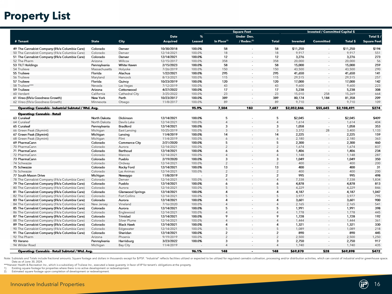 Innovative Industrial Properties 16 Square Feet Invested / Committed Capital $ Date % Under Dev. Total $ / #Tenant State City Acquired Leased In Place (1) / Redev. (2) Total Invested Committed Total $ Square Feet 49The Cannabist Company (f/k/a Columbia Care) Colorado Denver 10/30/2018 100.0% 58 - 58 $11,250 - $11,250 $194 50The Cannabist Company (f/k/a Columbia Care) Colorado Denver 12/14/2021 100.0% 18 - 18 9,917 - 9,917 551 51The Cannabist Company (f/k/a Columbia Care) Colorado Denver 12/14/2021 100.0% 12 - 12 3,276 - 3,276 273 52The Pharm Arizona Willcox 12/15/2017 100.0% 358 - 358 20,000 - 20,000 56 53TILT Holdings Pennsylvania White Haven 2/15/2023 100.0% 58 - 58 15,000 - 15,000 259 54Trulieve Massachusetts Holyoke 7/26/2019 100.0% 150 - 150 43,500 - 43,500 290 55Trulieve Florida Alachua 1/22/2021 100.0% 295 - 295 41,650 - 41,650 141 56Trulieve Maryland Hancock 8/13/2021 100.0% 115 - 115 29,515 - 29,515 257 57Trulieve Florida Quincy 10/23/2019 100.0% 120 - 120 17,000 - 17,000 142 58Trulieve*** Nevada Las Vegas 7/12/2019 100.0% 43 - 43 9,600 - 9,600 223 59Trulieve Arizona Cottonwood 4/27/2022 100.0% 17 - 17 5,238 - 5,238 308 60Verdant California Cathedral City 3/25/2022 100.0% 23 - 23 15,010 258 15,269 664 61Vireo (f/k/a Goodness Growth) New York Perth 10/23/2017 100.0% 389 - 389 80,174 1,184 81,358 209 62Vireo (f/k/a Goodness Growth) Minnesota Otsego 11/8/2017 100.0% 89 - 89 9,710 - 9,710 109 Operating: Cannabis - Industrial Subtotal / Wtd. Avg. 95.9% 7,504 183 7,687 $2,052,846 $55,645 $2,108,491 $274 Operating: Cannabis - Retail 63Curaleaf North Dakota Dickinson 12/14/2021 100.0% 5 - 5 $2,045 - $2,045 $409 64Curaleaf North Dakota Devils Lake 12/14/2021 100.0% 4 - 4 1,614 - 1,614 404 65Curaleaf Pennsylvania Bradford 12/14/2021 100.0% 3 - 3 1,058 - 1,058 353 66Green Peak (Skymint) Michigan East Lansing 10/25/2019 100.0% 3 - 3 3,372 28 3,400 1,133 67Green Peak (Skymint) Michigan Lansing 11/4/2019 100.0% 14 - 14 2,225 - 2,225 159 68Green Peak (Skymint) Michigan Flint 11/4/2019 100.0% 6 - 6 2,180 - 2,180 363 69PharmaCann Colorado Commerce City 2/21/2020 100.0% 5 - 5 2,300 - 2,300 460 70PharmaCann Colorado Aurora 12/14/2021 100.0% 2 - 2 1,674 - 1,674 837 71PharmaCann Colorado Berthoud 12/14/2021 100.0% 6 - 6 1,406 - 1,406 234 72PharmaCann Colorado Mancos 12/14/2021 100.0% 4 - 4 1,148 - 1,148 287 73PharmaCann Colorado Pueblo 2/19/2020 100.0% 3 - 3 1,049 - 1,049 350 74Schwazze Colorado Ordway 12/14/2021 100.0% 2 - 2 400 - 400 200 75Schwazze Colorado Rocky Ford 12/14/2021 100.0% 13 - 13 400 - 400 31 76Schwazze Colorado Las Animas 12/14/2021 100.0% 2 - 2 400 - 400 200 77South Mason Drive Michigan Newaygo 11/8/2019 - 2 - 2 995 - 995 498 78The Cannabist Company (f/k/a Columbia Care) Colorado Denver 12/14/2021 100.0% 4 - 4 7,338 - 7,338 1,834 79The Cannabist Company (f/k/a Columbia Care) Colorado Pueblo 12/14/2021 100.0% 6 - 6 4,878 - 4,878 813 80The Cannabist Company (f/k/a Columbia Care) Colorado Aurora 12/14/2021 100.0% 5 - 5 4,229 - 4,229 846 81The Cannabist Company (f/k/a Columbia Care) Colorado Glenwood Springs 12/14/2021 100.0% 4 - 4 4,187 - 4,187 1,047 82The Cannabist Company (f/k/a Columbia Care) Colorado Fort Collins 12/14/2021 100.0% 5 - 5 3,977 - 3,977 795 83The Cannabist Company (f/k/a Columbia Care) Colorado Aurora 12/14/2021 100.0% 4 - 4 3,601 - 3,601 900 84The Cannabist Company (f/k/a Columbia Care) New Jersey Vineland 7/16/2020 100.0% 4 - 4 2,165 - 2,165 541 85The Cannabist Company (f/k/a Columbia Care) Colorado Aurora 12/14/2021 100.0% 5 - 5 1,991 - 1,991 398 86The Cannabist Company (f/k/a Columbia Care) Colorado Englewood 12/14/2021 100.0% 4 - 4 1,778 - 1,778 445 87The Cannabist Company (f/k/a Columbia Care) Colorado Trinidad 12/14/2021 100.0% 9 - 9 1,728 - 1,728 192 88The Cannabist Company (f/k/a Columbia Care) Colorado Silver Plume 12/14/2021 100.0% 4 - 4 1,444 - 1,444 361 89The Cannabist Company (f/k/a Columbia Care) Colorado Black Hawk 12/14/2021 100.0% 4 - 4 1,321 - 1,321 330 90The Cannabist Company (f/k/a Columbia Care) Colorado Edgewater 12/14/2021 100.0% 5 - 5 1,089 - 1,089 218 91The Cannabist Company (f/k/a Columbia Care) Colorado Sheridan 12/14/2021 100.0% 2 - 2 890 - 890 445 92The Pharm Arizona Phoenix 9/19/2019 100.0% 2 - 2 2,500 - 2,500 1,250 93Verano Pennsylvania Harrisburg 3/23/2022 100.0% 3 - 3 2,750 - 2,750 917 94Wilder Road Michigan Bay City 11/4/2019 - 4 - 4 1,740 - 1,740 435 Operating: Cannabis - Retail Subtotal / Wtd. Avg. 96.1% 148 - 148 $69,870 $28 $69,898 $472 Note : Subtotals and Totals include fractional amounts . Square footage and dollars in thousands except for $ /PSF . “Industrial” reflects facilities utilized or expected to be utilized for regulated cannabis cultivation, processing and/or distribution activities, which can consist of industrial and/or greenhouse space . Data as of June 30 , 2024 . *** Harvest Health & Recreation Inc . , which is a subsidiary of Trulieve Inc . , executed a lease guaranty in favor of IIP for tenant’s obligations at the property . 1) Existing square footage for properties where there is no active development or redevelopment . 2) Estimated square footage upon completion of development or redevelopment . Property List