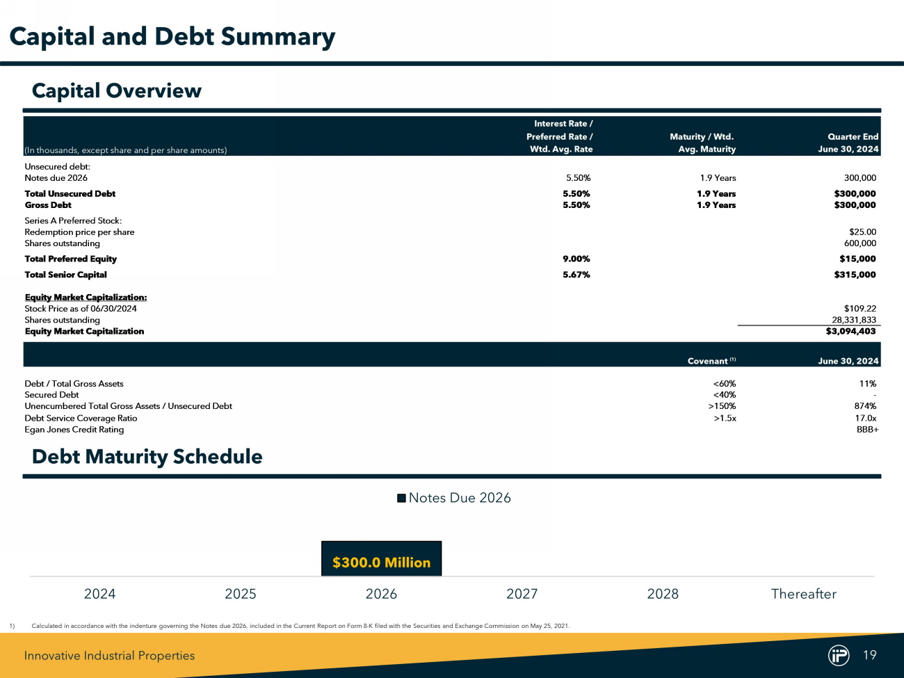 Innovative Industrial Properties 19 Interest Rate / Preferred Rate / Maturity / Wtd. Quarter End (In thousands, except share and per share amounts) Wtd. Avg. Rate Avg. Maturity June 30, 2024 Unsecured debt: Notes due 2026 5.50% 1.9 Years 300,000 Total Unsecured Debt 5.50% 1.9 Years $300,000 Gross Debt 5.50% 1.9 Years $300,000 Series A Preferred Stock: Redemption price per share $25.00 Shares outstanding 600,000 Total Preferred Equity 9.00% $15,000 Total Senior Capital 5.67% $315,000 Equity Market Capitalization: Stock Price as of 06/30/2024 $109.22 Shares outstanding 28,331,833 Equity Market Capitalization $3,094,403 Covenant (1) June 30, 2024 Debt / Total Gross Assets <60% 11% Secured Debt <40% - Unencumbered Total Gross Assets / Unsecured Debt >150% 874% Debt Service Coverage Ratio >1.5x 17.0x Egan Jones Credit Rating BBB+ Debt Maturity Schedule Capital and Debt Summary $300.0 Million 2024 2025 2026 2027 2028 Thereafter Notes Due 2026 Capital Overview 1) Calculated in accordance with the indenture governing the Notes due 2026 , included in the Current Report on Form 8 - K filed with the Securities and Exchange Commission on May 25 , 2021 .