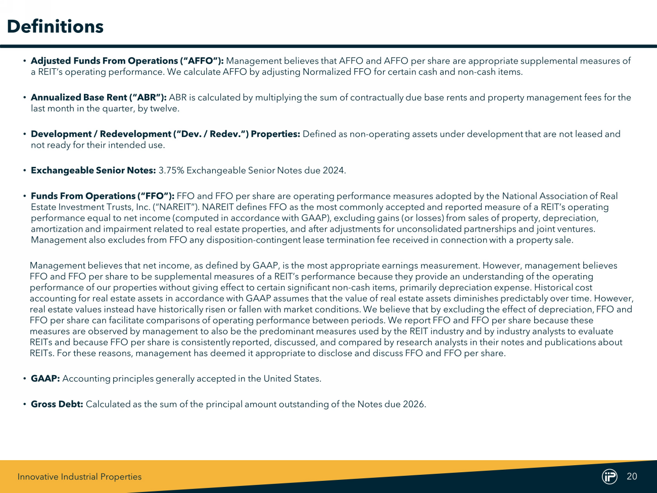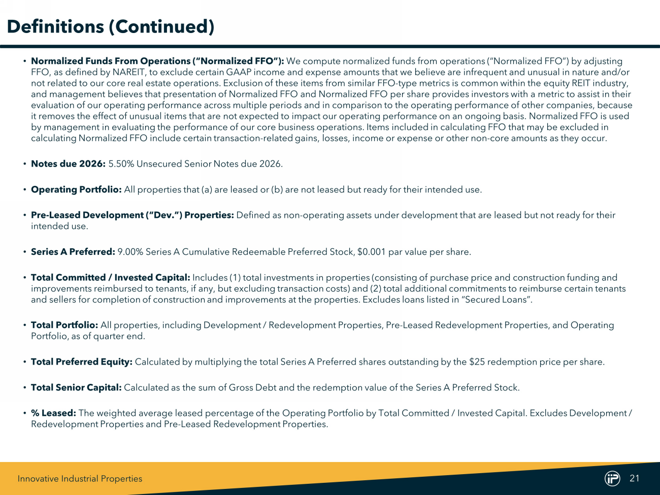 Innovative Industrial Properties 20 Definitions • Adjusted Funds From Operations (“AFFO”): Management believes that AFFO and AFFO per share are appropriate supplemental measures of a REIT’s operating performance. We calculate AFFO by adjusting Normalized FFO for certain cash and non - cash items. • Annualized Base Rent (“ABR”): ABR is calculated by multiplying the sum of contractually due base rents and property management fees for the last month in the quarter, by twelve. • Development / Redevelopment (“Dev. / Redev.”) Properties: Defined as non - operating assets under development that are not leased and not ready for their intended use. • Exchangeable Senior Notes: 3.75% E xchangeable Senior Notes due 2024. • Funds From Operations (“FFO”): FFO and FFO per share are operating performance measures adopted by the National Association of Real Estate Investment Trusts, Inc. (“NAREIT”). NAREIT defines FFO as the most commonly accepted and reported measure of a REIT’s ope rating performance equal to net income (computed in accordance with GAAP), excluding gains (or losses) from sales of property, depre cia tion, amortization and impairment related to real estate properties, and after adjustments for unconsolidated partnerships and join t v entures. Management also excludes from FFO any disposition - contingent lease termination fee received in connection with a property sale. Management believes that net income, as defined by GAAP, is the most appropriate earnings measurement. However, management be lie ves FFO and FFO per share to be supplemental measures of a REIT’s performance because they provide an understanding of the operat ing performance of our properties without giving effect to certain significant non - cash items, primarily depreciation expense. Histo rical cost accounting for real estate assets in accordance with GAAP assumes that the value of real estate assets diminishes predictably ov er time. However, real estate values instead have historically risen or fallen with market conditions. We believe that by excluding the effect of depreciation, FFO and FFO per share can facilitate comparisons of operating performance between periods. We report FFO and FFO per share because th ese measures are observed by management to also be the predominant measures used by the REIT industry and by industry analysts to ev aluate REITs and because FFO per share is consistently reported, discussed, and compared by research analysts in their notes and pub lic ations about REITs. For these reasons, management has deemed it appropriate to disclose and discuss FFO and FFO per share. • GAAP: Accounting principles generally accepted in the United States. • Gross Debt: Calculated as the sum of the principal amount outstanding of the Notes due 2026.