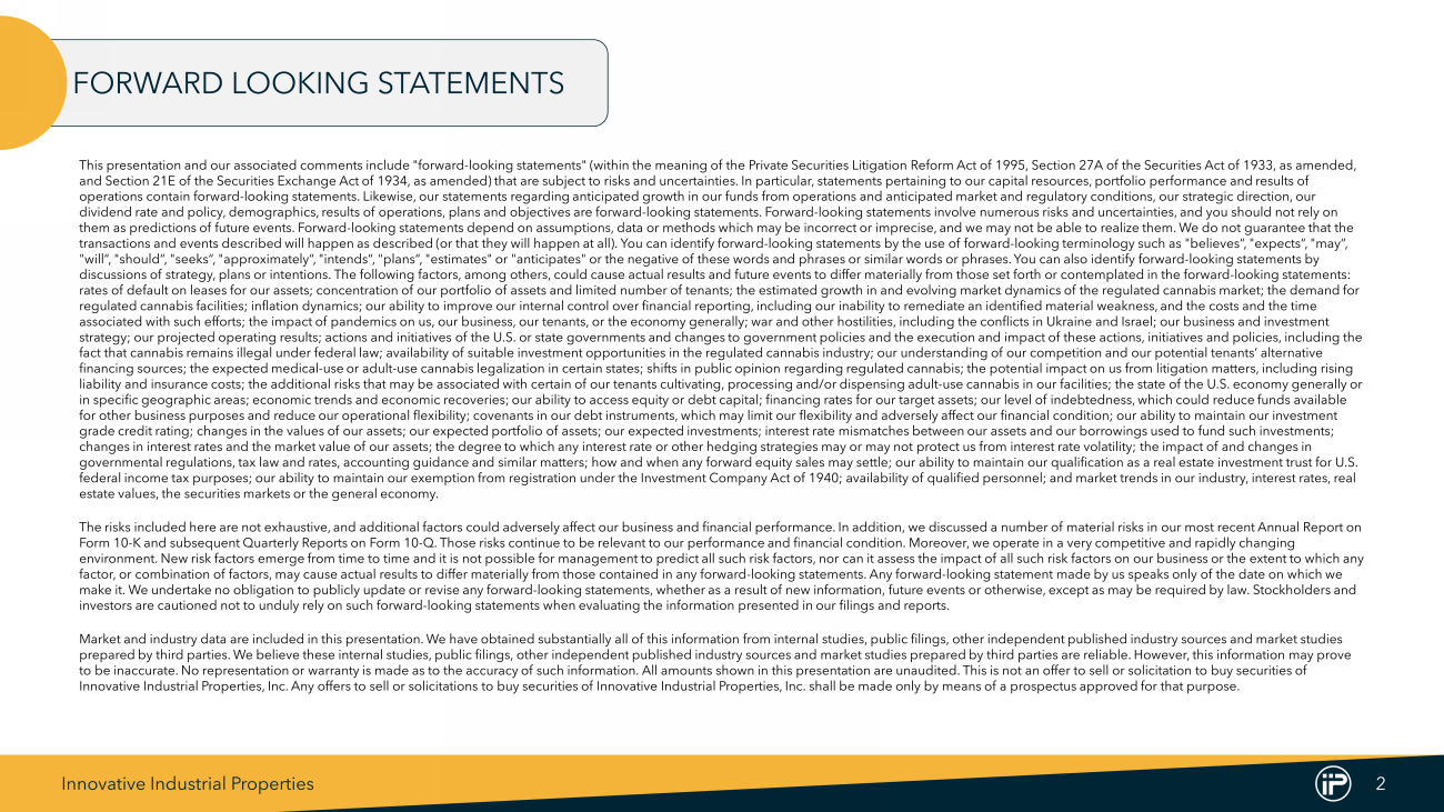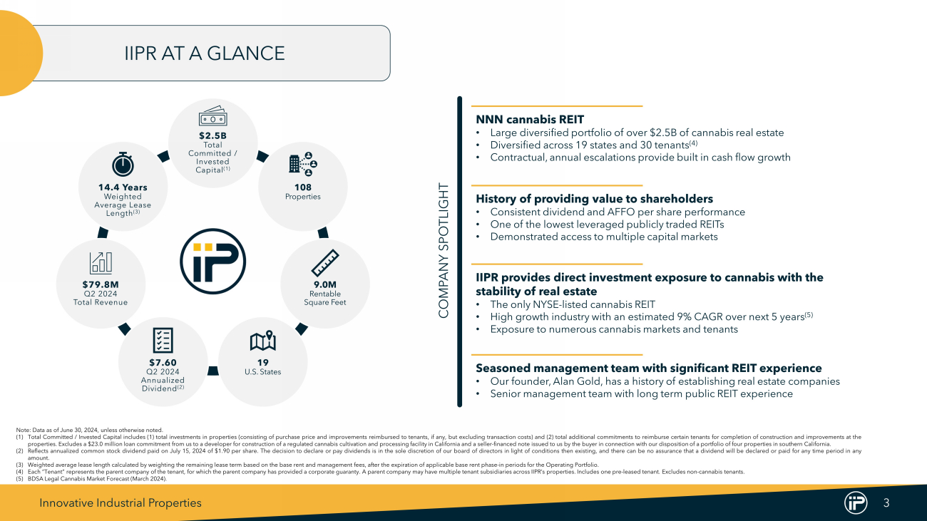 Innovative Industrial Properties 2 This presentation and our associated comments include "forward - looking statements" (within the meaning of the Private Securities Litigation Reform Act of 1995, Section 27A of the Securities Act of 1933, as amended, and Section 21E of the Securities Exchange Act of 1934, as amended) that are subject to risks and uncertainties. In particula r, statements pertaining to our capital resources, portfolio performance and results of operations contain forward - looking statements. Likewise, our statements regarding anticipated growth in our funds from operation s and anticipated market and regulatory conditions, our strategic direction, our dividend rate and policy, demographics, results of operations, plans and objectives are forward - looking statements. Forward - look ing statements involve numerous risks and uncertainties, and you should not rely on them as predictions of future events. Forward - looking statements depend on assumptions, data or methods which may be incorrect o r imprecise, and we may not be able to realize them. We do not guarantee that the transactions and events described will happen as described (or that they will happen at all). You can identify forward - looking s tatements by the use of forward - looking terminology such as "believes“, "expects“, "may“, "will“, "should“, "seeks“, "approximately“, "intends“, "plans“, "estimates" or "anticipates" or the negative of these words a nd phrases or similar words or phrases. You can also identify forward - looking statements by discussions of strategy, plans or intentions. The following factors, among others, could cause actual results and future even ts to differ materially from those set forth or contemplated in the forward - looking statements: rates of default on leases for our assets; concentration of our portfolio of assets and limited number of tenants; the estima ted growth in and evolving market dynamics of the regulated cannabis market; the demand for regulated cannabis facilities; inflation dynamics; our ability to improve our internal control over financial reporting, incl udi ng our inability to remediate an identified material weakness, and the costs and the time associated with such efforts; the impact of pandemics on us, our business, our tenants, or the economy generally; war and oth er hostilities, including the conflicts in Ukraine and Israel; our business and investment strategy; our projected operating results; actions and initiatives of the U.S. or state governments and changes to government po licies and the execution and impact of these actions, initiatives and policies, including the fact that cannabis remains illegal under federal law; availability of suitable investment opportunities in the regulated cann abi s industry; our understanding of our competition and our potential tenants’ alternative financing sources; the expected medical - use or adult - use cannabis legalization in certain states; shifts in public opinion regar ding regulated cannabis; the potential impact on us from litigation matters, including rising liability and insurance costs; the additional risks that may be associated with certain of our tenants cultivating, processin g a nd/or dispensing adult - use cannabis in our facilities; the state of the U.S. economy generally or in specific geographic areas; economic trends and economic recoveries; our ability to access equity or debt capital; financin g r ates for our target assets; our level of indebtedness, which could reduce funds available for other business purposes and reduce our operational flexibility; covenants in our debt instruments, which may limit our fl exi bility and adversely affect our financial condition; our ability to maintain our investment grade credit rating; changes in the values of our assets; our expected portfolio of assets; our expected investments; interes t r ate mismatches between our assets and our borrowings used to fund such investments; changes in interest rates and the market value of our assets; the degree to which any interest rate or other hedging strategi es may or may not protect us from interest rate volatility; the impact of and changes in governmental regulations, tax law and rates, accounting guidance and similar matters; how and when any forward equity sales m ay settle; our ability to maintain our qualification as a real estate investment trust for U.S. federal income tax purposes; our ability to maintain our exemption from registration under the Investment Company Act of 1940 ; a vailability of qualified personnel; and market trends in our industry, interest rates, real estate values, the securities markets or the general economy. The risks included here are not exhaustive, and additional factors could adversely affect our business and financial performa nce . In addition, we discussed a number of material risks in our most recent Annual Report on Form 10 - K and subsequent Quarterly Reports on Form 10 - Q. Those risks continue to be relevant to our performance and financial co ndition. Moreover, we operate in a very competitive and rapidly changing environment. New risk factors emerge from time to time and it is not possible for management to predict all such risk factors , n or can it assess the impact of all such risk factors on our business or the extent to which any factor, or combination of factors, may cause actual results to differ materially from those contained in any forward - looking sta tements. Any forward - looking statement made by us speaks only of the date on which we make it. We undertake no obligation to publicly update or revise any forward - looking statements, whether as a result of new info rmation, future events or otherwise, except as may be required by law. Stockholders and investors are cautioned not to unduly rely on such forward - looking statements when evaluating the information presented in our f ilings and reports. Market and industry data are incl