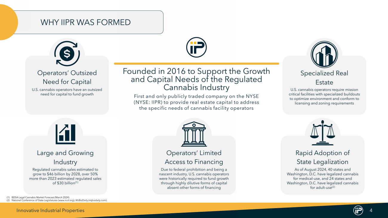 Innovative Industrial Properties 3 NNN cannabis REIT • Large diversified portfolio of over $2.5B of cannabis real estate • Diversified across 19 states and 30 tenants (4) • Contractual, annual escalations provide built in cash flow growth History of providing value to shareholders • Consistent dividend and AFFO per share performance • One of the lowest leveraged publicly traded REITs • Demonstrated access to multiple capital markets IIPR provides direct investment exposure to cannabis with the stability of real estate • The only NYSE - listed cannabis REIT • High growth industry with an estimated 9% CAGR over next 5 years (5) • Exposure to numerous cannabis markets and tenants Seasoned management team with significant REIT experience • Our founder, Alan Gold, has a history of establishing real estate companies • Senior management team with long term public REIT experience Note : Data as of June 30 , 2024 , unless otherwise noted . (1) Total Committed / Invested Capital includes ( 1 ) total investments in properties (consisting of purchase price and improvements reimbursed to tenants, if any, but excluding transaction costs) and ( 2 ) total additional commitments to reimburse certain tenants for completion of construction and improvements at the properties . Excludes a $ 23 . 0 million loan commitment from us to a developer for construction of a regulated cannabis cultivation and processing facility in California and a seller - financed note issued to us by the buyer in connection with our disposition of a portfolio of four properties in southern California . (2) Reflects annualized common stock dividend paid on July 15 , 2024 of $ 1 . 90 per share . The decision to declare or pay dividends is in the sole discretion of our board of directors in light of conditions then existing, and there can be no assurance that a dividend will be declared or paid for any time period in any amount . (3) Weighted average lease length calculated by weighting the remaining lease term based on the base rent and management fees, after the expiration of applicable base rent phase - in periods for the Operating Portfolio . (4) Each “Tenant” represents the parent company of the tenant, for which the parent company has provided a corporate guaranty . A parent company may have multiple tenant subsidiaries across IIPR’s properties . Includes one pre - leased tenant . Excludes non - cannabis tenants . (5) BDSA Legal Cannabis Market Forecast (March 2024 ) . IIPR AT A GLANCE $2.5B Total Committed / Invested Capital (1) 108 Properties 9 .0M Rentable Square Feet 19 U.S. States $7.60 Q2 2024 Annualized Dividend (2) $79.8M Q2 2024 Total Revenue 14.4 Years Weighted Average Lease Length (3) COMPANY SPOTLIGHT