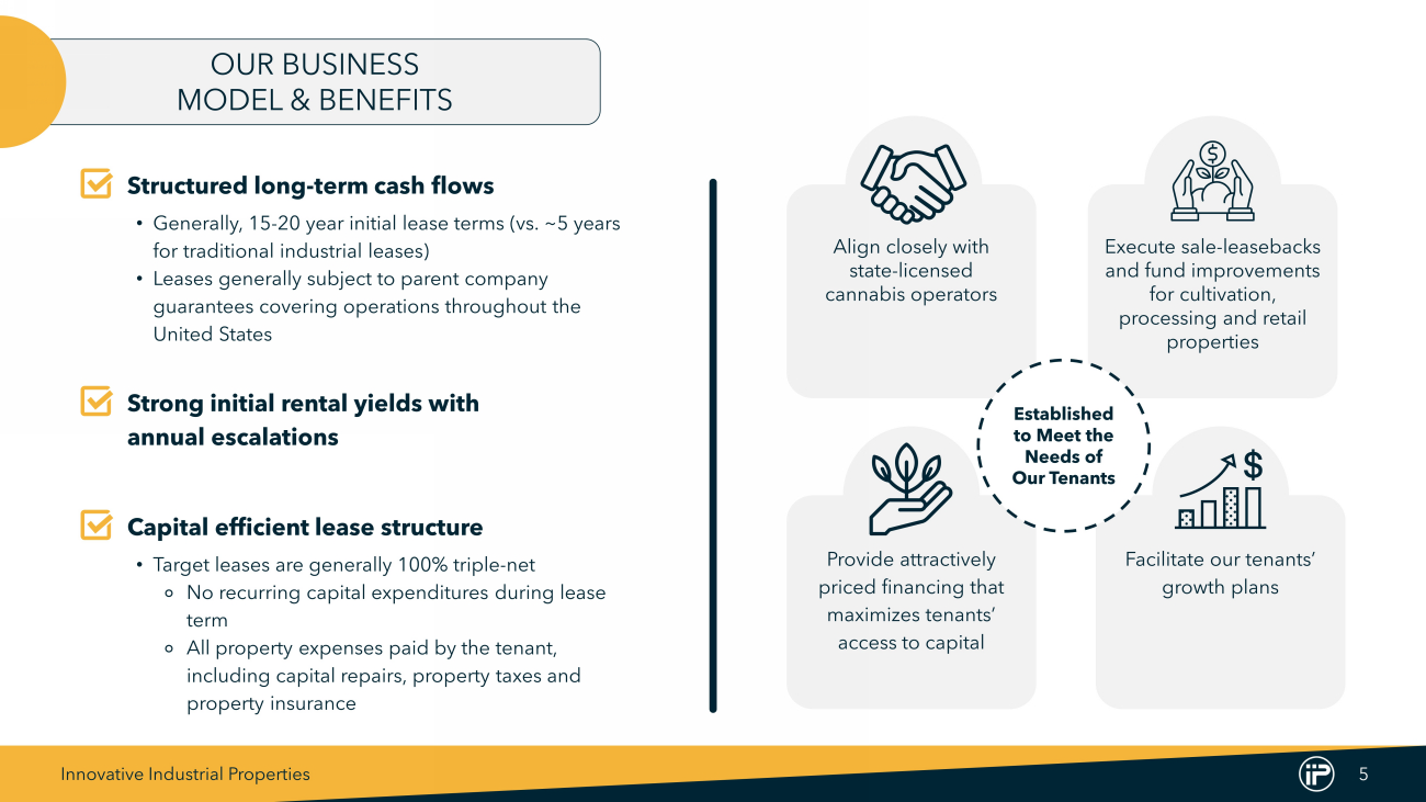 Innovative Industrial Properties 4 Founded in 2016 to Support the Growth and Capital Needs of the Regulated Cannabis Industry First and only publicly traded company on the NYSE (NYSE: IIPR) to provide real estate capital to address the specific needs of cannabis facility operators Specialized Real Estate U.S. cannabis operators require mission critical facilities with specialized buildouts to optimize environment and conform to licensing and zoning requirements Operators’ Outsized Need for Capital U.S. cannabis operators have an outsized need for capital to fund growth Rapid Adoption of State Legalization As of August 2024, 40 states and Washington, D.C. have legalized cannabis for medical - use, and 24 states and Washington, D.C. have legalized cannabis for adult - use (2) Large and Growing Industry Regulated cannabis sales estimated to grow to $46 billion by 2028, over 50% more than 2023 estimated regulated sales of $30 billion (1) Operators’ Limited Access to Financing Due to federal prohibition and being a nascent industry, U.S. cannabis operators were historically required to fund growth through highly dilutive forms of capital absent other forms of financing (1) BDSA Legal Cannabis Market Forecast (March 2024 ) . (2) National Conference of State Legislatures (www . ncsl . org), MJBizDaily (mjbizdaily . com) . WHY IIPR WAS FORMED