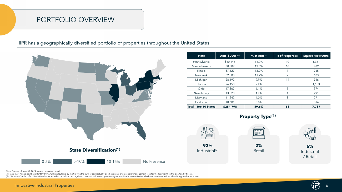 Innovative Industrial Properties 5 Structured long - term cash flows • Generally, 15 - 20 year initial lease terms (vs. ~5 years for traditional industrial leases) • Leases generally subject to parent company guarantees covering operations throughout the United States Capital efficient lease structure • Target leases are generally 100% triple - net ⚬ No recurring capital expenditures during lease term ⚬ All property expenses paid by the tenant, including capital repairs, property taxes and property insurance Strong initial rental yields with annual escalations Align closely with state - licensed cannabis operators Provide attractively priced financing that maximizes tenants’ access to capital Facilitate our tenants’ growth plans Execute sale - leasebacks and fund improvements for cultivation, processing and retail properties OUR BUSINESS MODEL & BENEFITS Established to Meet the Needs of Our Tenants