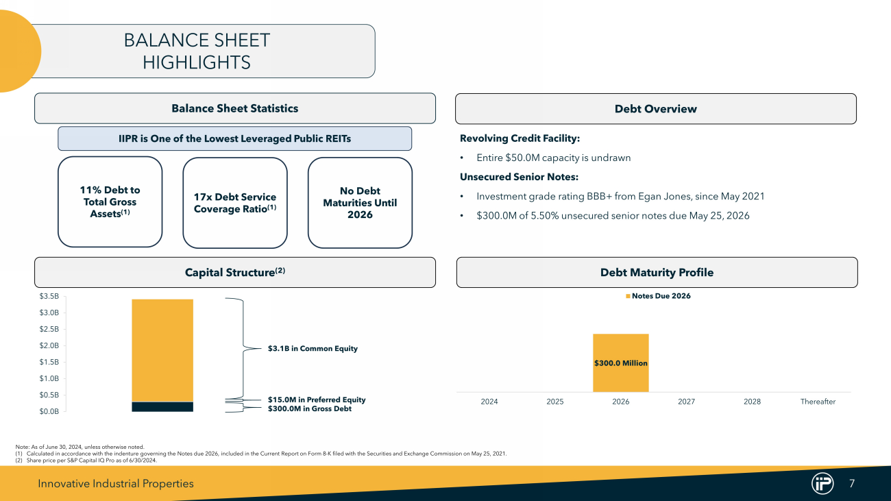Innovative Industrial Properties 6 PORTFOLIO OVERVIEW IIPR has a geographically diversified portfolio of properties throughout the United States Note : Data as of June 30 , 2024 , unless otherwise noted . (1) As a % of Annualized Base Rent (“ABR”) . ABR is calculated by multiplying the sum of contractually due base rents and property management fees for the last month in the quarter, by twelve . (2) “Industrial” reflects facilities utilized or expected to be utilized for regulated cannabis cultivation, processing and/or distribution activities, which can consist of industrial and/or greenhouse space . Property Type (1) State Diversification (1) State ABR ($000s) (1) % of ABR (1) # of Properties Square Feet (000s) Pennsylvania $40,446 14.2% 10 1,361 Massachusetts 38,309 13.5% 10 989 Illinois 37,127 13.0% 7 965 New York 32,008 11.2% 2 623 Michigan 28,192 9.9% 14 946 Florida 26,158 9.2% 5 1,153 Ohio 17,307 6.1% 5 374 New Jersey 13,328 4.7% 4 291 Maryland 11,242 4.0% 3 271 California 10,681 3.8% 8 814 Total – Top 10 States $254,798 89.6% 68 7,787 10 - 15% No Presence 0 - 5% 5 - 10% 2% Retail 92% Industrial (2) 6% Industrial / Retail