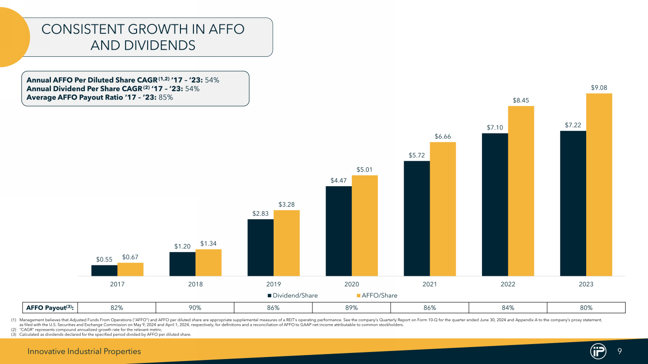 Innovative Industrial Properties 8 DIVERSIFIED TENANT BASE Note : Data as of June 30 , 2024 , unless otherwise noted . (1) As a % of Annualized Base Rent (“ABR”) . ABR is calculated by multiplying the sum of contractually due base rents and property management fees for the last month in the quarter, by twelve . (2) Each “Tenant” represents the parent company of the tenant, for which the parent company has provided a corporate guaranty . A parent company may have multiple tenant subsidiaries across IIP’s properties . Includes two pre - leased tenants . Excludes non - cannabis tenants from tenant count . Total Committed / Invested Capital includes ( 1 ) total investments in properties (consisting of purchase price and improvements reimbursed to tenants, if any, but excluding transaction costs) and ( 2 ) total additional commitments to reimburse certain tenants for completion of construction and improvements at the properties . Excludes a $ 23 . 0 million loan commitment from us to a developer for construction of a regulated cannabis cultivation and processing facility in California and a seller - financed note issued to us by the buyer in connection with our disposition of a portfolio of four properties in southern California . (3) Excludes non - cannabis tenants that comprise less than 1 % of annualized base rent in the aggregate . (4) “MSO” stands for Multi - State Operator which means the tenant (or guarantor) conducts cannabis operations in more than one state . “SSO” stands for Single - State Operator which means the tenant (or guarantor) conducts cannabis operations in a single state . Public vs. Private 62% Public 38% Private Tenant ABR ($000s) ABR (%) (1) Square Feet (000s) ABR/SF $48,505 17.0% 697 $70 30,288 10.6% 624 49 21,913 7.7% 664 33 20,087 7.1% 578 35 18,990 6.7% 740 26 17,649 6.2% 588 30 16,485 5.8% 298 55 16,402 5.8% 379 43 15,636 5.5% 593 26 13,460 4.7% 478 28 Total $219,415 77.1% 5,639 $39 $30.0M $73.3M $167.4M $690.0M $1.3B $2.0B $2.3B $2.4B $2.5B 1 4 8 18 20 26 29 30 30 2016 2017 2018 2019 2020 2021 2022 2023 6/30/2024 Invested Capital # of Tenants Total Committed / Invested Capital & Tenant Growth (2) Tenant Composition (1)(3) Operator Type (4) 91% MSO 9% SSO