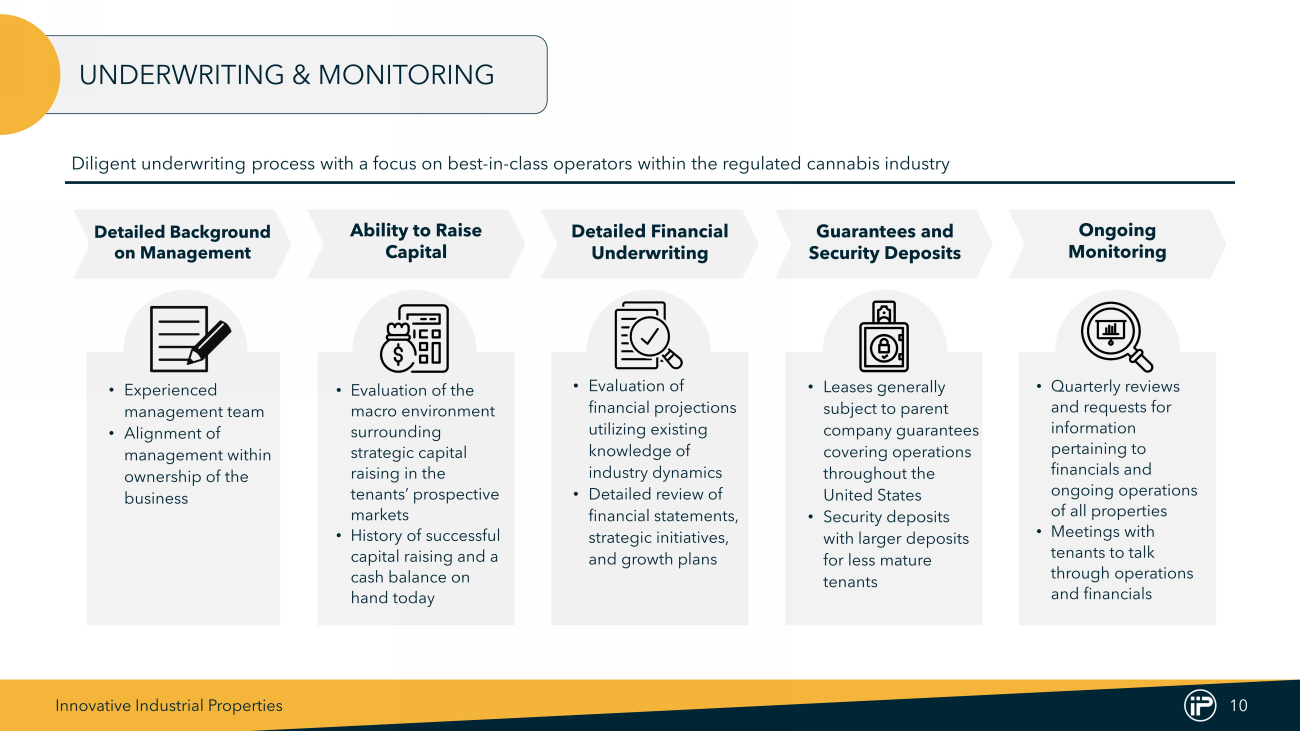 Innovative Industrial Properties 9 $0.55 $1.20 $2.83 $4.47 $5.72 $7.10 $7.22 $0.67 $1.34 $3.28 $5.01 $6.66 $8.45 $9.08 2017 2018 2019 2020 2021 2022 2023 Dividend/Share AFFO/Share CONSISTENT GROWTH IN AFFO AND DIVIDENDS AFFO Payout (3) : 82% 90% 86% 89% 86% 84% 80% Annual AFFO Per Diluted Share CAGR (1,2) ‘17 – ’23: 54% Annual Dividend Per Share CAGR (2) ‘17 – ’23: 54% Average AFFO Payout Ratio ‘17 – ’23: 85% (1) Management believes that Adjusted Funds From Operations (“AFFO”) and AFFO per diluted share are appropriate supplemental measures of a REIT’s operating performance . See the company’s Quarterly Report on Form 10 - Q for the quarter ended June 30 , 2024 and Appendix A to the company’s proxy statement, as filed with the U . S . Securities and Exchange Commission on May 9 , 2024 and April 1 , 2024 , respectively, for definitions and a reconciliation of AFFO to GAAP net income attributable to common stockholders . (2) "CAGR" represents compound annualized growth rate for the relevant metric . (3) Calculated as dividends declared for the specified period divided by AFFO per diluted share .