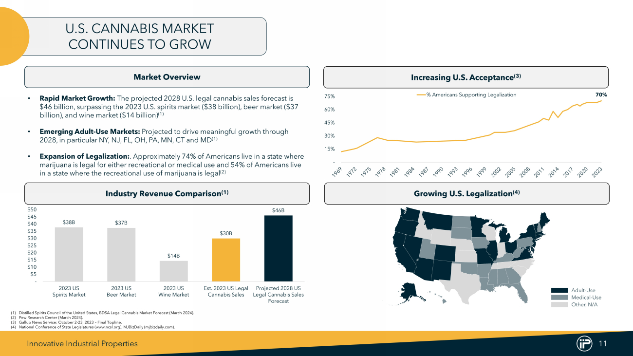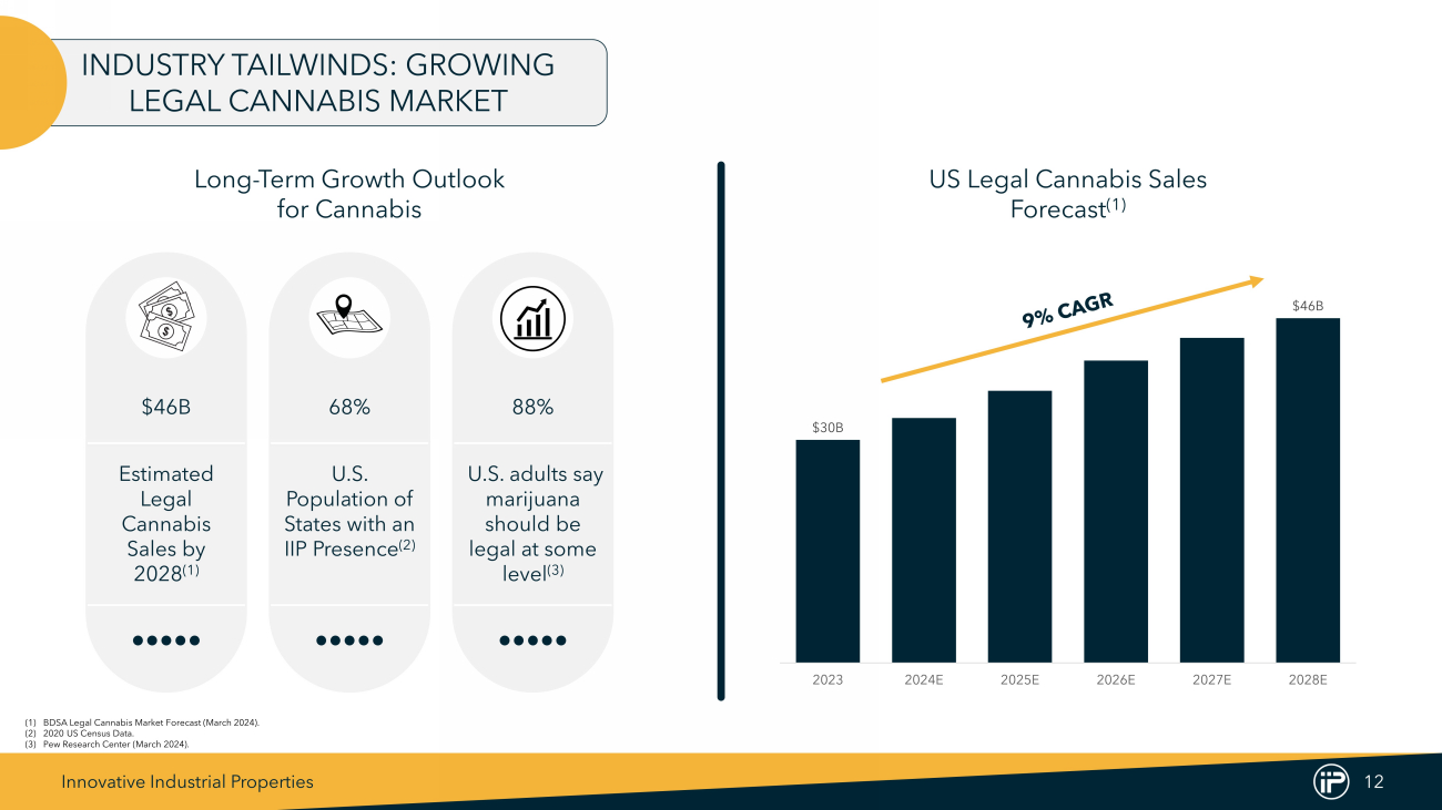 Innovative Industrial Properties 11 Market Overview U.S. CANNABIS MARKET CONTINUES TO GROW Increasing U.S. Acceptance (3) Industry Revenue Comparison (1) Growing U.S. Legalization (4) (1) Distilled Spirits Council of the United States, BDSA Legal Cannabis Market Forecast (March 2024 ) . (2) Pew Research Center (March 2024 ) . (3) Gallup News Service : October 2 - 23 , 2023 – Final Topline . (4) National Conference of State Legislatures (www . ncsl . org), MJBizDaily (mjbizdaily . com) . Other, N/A Adult - Use Medical - Use 70% - 15% 30% 45% 60% 75% % Americans Supporting Legalization $38B $37B $14B $30B $46B - $5 $10 $15 $20 $25 $30 $35 $40 $45 $50 2023 US Spirits Market 2023 US Beer Market 2023 US Wine Market Est. 2023 US Legal Cannabis Sales Projected 2028 US Legal Cannabis Sales Forecast • Rapid Market Growth: The projected 2028 U.S. legal cannabis sales forecast is $46 billion, surpassing the 2023 U.S. spirits market ($38 billion), beer market ($37 billion), and wine market ($14 billion) (1) • Emerging Adult - Use Markets: Projected to drive meaningful growth through 2028, in particular NY, NJ, FL, OH, PA, MN, CT and MD (1) • Expansion of Legalization: . Approximately 74% of Americans live in a state where marijuana is legal for either recreational or medical use and 54% of Americans live in a state where the recreational use of marijuana is legal (2)
