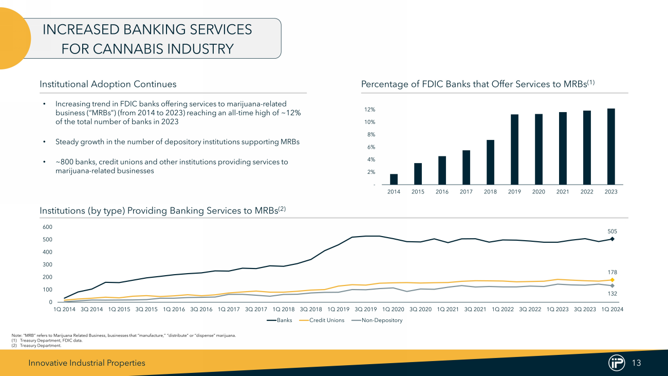 Innovative Industrial Properties 12 INDUSTRY TAILWINDS: GROWING LEGAL CANNABIS MARKET $30B $46B 2023 2024E 2025E 2026E 2027E 2028E Long - Term Growth Outlook for Cannabis $46B Estimated Legal Cannabis Sales by 2028 (1) 68% U.S. Population of States with an IIP Presence (2) 88% U.S. adults say marijuana should be legal at some level (3) (1) BDSA Legal Cannabis Market Forecast (March 2024 ) . (2) 2020 US Census Data . (3) Pew Research Center (March 2024 ) . US Legal Cannabis Sales Forecast (1)